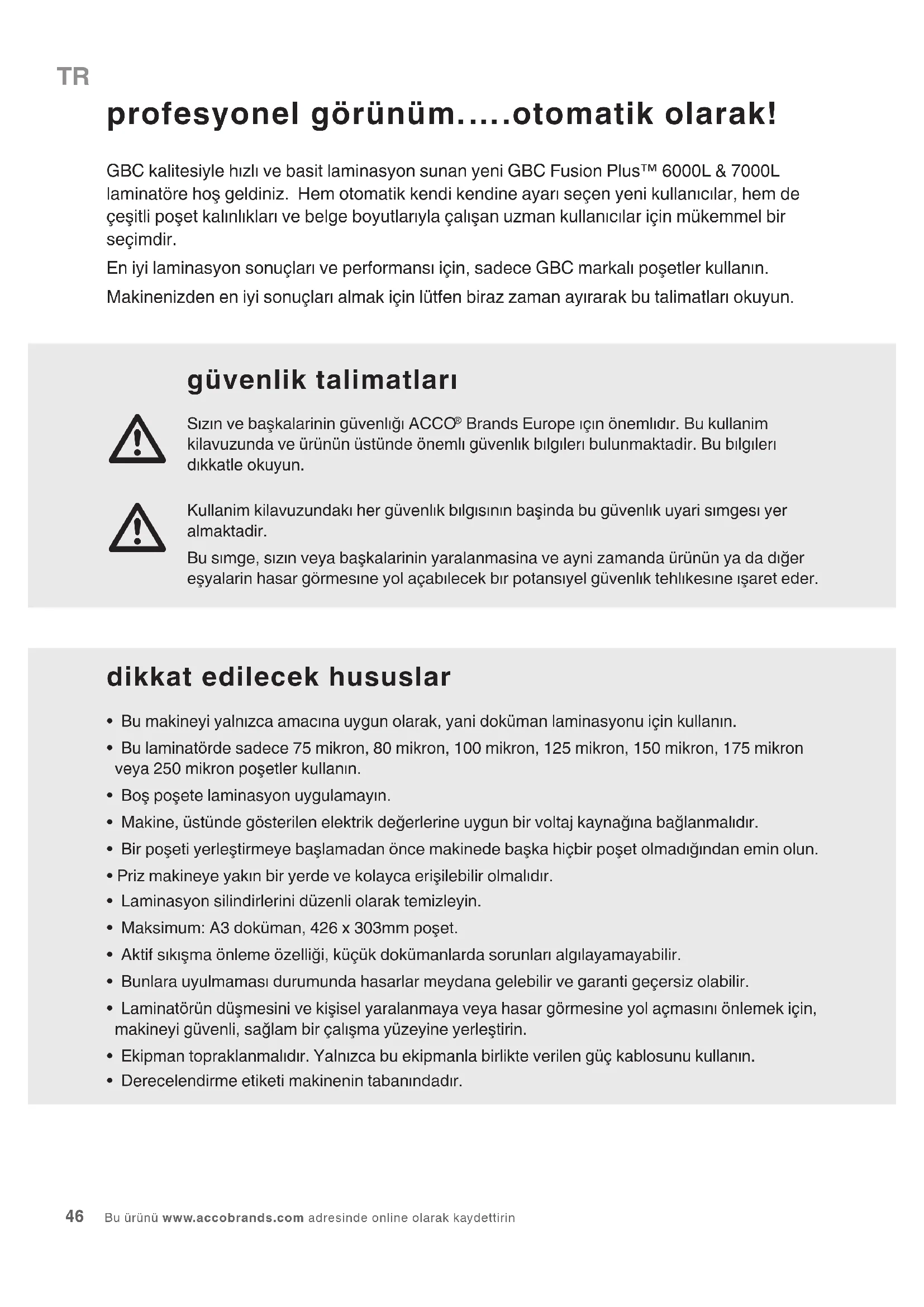- Bu makineyi yalnızca amacına uygun olarak, yani doküman laminasyonu için kullanın.• Bu laminatörde sadece 75 mikron, 80 mikron, 100 mikron, 125 mikron, 150 mikron, 175 mikron veya 250 mikron poşetler kullanın.• Boş poşete laminasyon uygulamayın.• Makine, üstünde gösterilen elektrik değerlerine uygun bir voltaj kaynağına bağlanmalıdır.• Bir poşeti yerleştirmeye başlamadan önce makinede başka hiçbir poşet olmadığından emin olun.• Priz makineye yakın bir yerde ve kolayca erişilebilir olmalıdır.• Laminasyon silindirlerini düzenli olarak temizleyin.• Maksimum: A3 doküman, 426 x 303mm poşet.• Aktif sıkışma önleme özelliği, küçük dokümanlarda sorunları algılayamayabilir.• Bunlara uyulmaması durumunda hasarlar meydana gelebilir ve garanti geçersiz olabilir.• Laminatörün düşmesini ve kişisel yaralanmaya veya hasar görmesine yol açmasını önlemek için, makineyi güvenli, sağlam bir çalışma yüzeyine yerleştirin.• Ekipman topraklanmalıdır. Yalnızca bu ekipmanla birlikte verilen güç kablosunu kullanın.• Derecelendirme etiketi makinenin tabanındadır. profesyonel görünüm.….otomatik olarak! GBC kalitesiyle hızlı ve basit laminasyon sunan yeni GBC Fusion Plus™ 6000L & 7000L laminatöre hoş geldiniz. Hem otomatik kendi kendine ayarı seçen yeni kullanıcılar, hem de çeşitli poşet kalınlıkları ve belge boyutlarıyla çalışan uzman kullanıcılar için mükemmel bir seçimdir. En iyi laminasyon sonuçları ve performansı için, sadece GBC markalı poşetler kullanın. Makinenizden en iyi sonuçları almak için lütfen biraz zaman ayırarak bu talimatları okuyun.TR servis Poşetli tip laminatörü kendiniz servis veya tamir etmeye çalışmayın. Gereken her türlü onarım için, makinenin şini prizden çekin ve GBC yetkili servis temsilcisine başvurun. FUSION PLUS