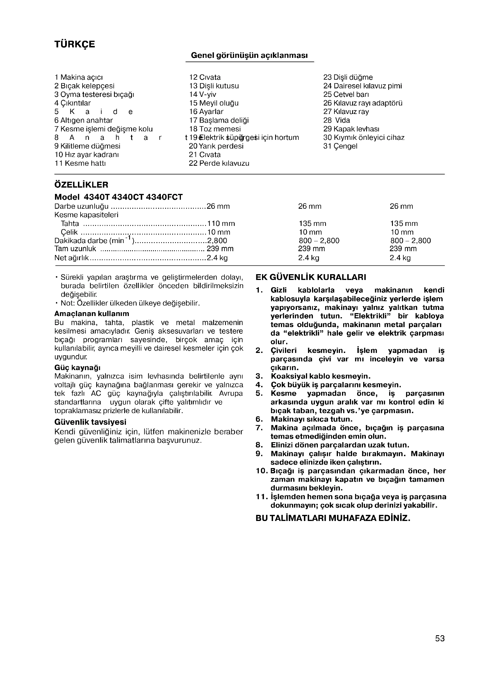 | 0 | Düz hatta kesme ilelmi | Yumusak Çelik, paslanmaz Çelik ve plastik kesmek icin. Tahta ve kontrplakta temiz kesme icin. |