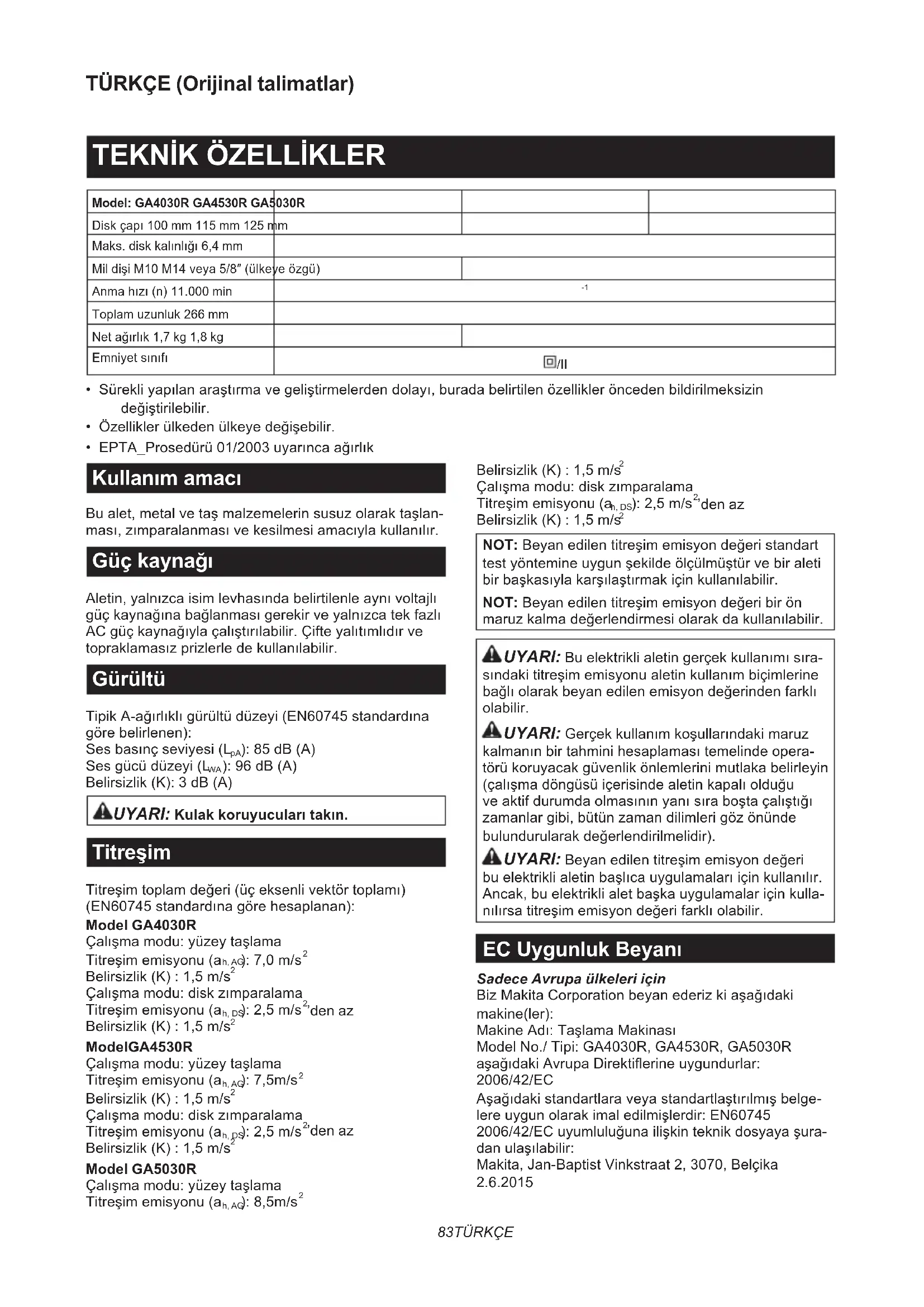 NOT: Beyan edilen titreşim emisyon değeri standart test yöntemine uygun şekilde ölçülmüştür ve bir aleti bir başkasıyla karşılaştırmak için kullanılabilir. NOT: Beyan edilen titreşim emisyon değeri bir ön maruz kalma değerlendirmesi olarak da kullanılabilir. UYARI: Bu elektrikli aletin gerçek kullanımı sıra- sındaki titreşim emisyonu aletin kullanım biçimlerine bağlı olarak beyan edilen emisyon değerinden farklı olabilir. UYARI: Gerçek kullanım koşullarındaki maruz kalmanın bir tahmini hesaplaması temelinde opera- törü koruyacak güvenlik önlemlerini mutlaka belirleyin (çalışma döngüsü içerisinde aletin kapalı olduğu ve aktif durumda olmasının yanı sıra boşta çalıştığı zamanlar gibi, bütün zaman dilimleri göz önünde bulundurularak değerlendirilmelidir). UYARI: Beyan edilen titreşim emisyon değeri bu elektrikli aletin başlıca uygulamaları için kullanılır. Ancak, bu elektrikli alet başka uygulamalar için kulla- nılırsa titreşim emisyon değeri farklı olabilir. EC Uygunluk Beyanı Sadece Avrupa ülkeleri için Biz Makita Corporation beyan ederiz ki aşağıdaki makine(ler): Makine Adı: Taşlama Makinası Model No./ Tipi: GA4030R, GA4530R, GA5030R aşağıdaki Avrupa Direktierine uygundurlar: 2006/42/EC Aşağıdaki standartlara veya standartlaştırılmış belge- lere uygun olarak imal edilmişlerdir: EN60745 2006/42/EC uyumluluğuna ilişkin teknik dosyaya şura- dan ulaşılabilir: Makita, Jan-Baptist Vinkstraat 2, 3070, Belçika