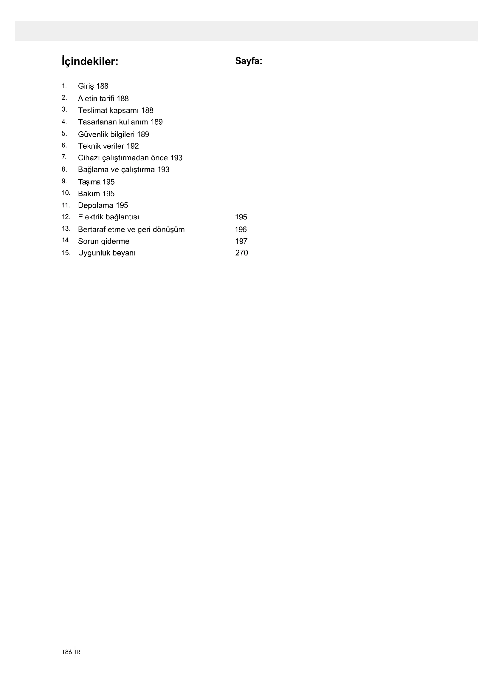 Cihaz, taşıma esnasındaki hasarın önlenmesi için am- balaj içerisinde temin edilmektedir. Bu ambalaj içerisin- deki ham maddeler tekrar kullanılabilir veya geri dönüş- türülebilir. Cihaz ve aksesuarları, metal ve plastik gibi çeşitli tip malzemelerden yapılmıştır. Arızalı bileşenler özel atık olarak bertaraf edilmelidir. Bayiinize veya be- lediye meclisinize danışınız.197TR