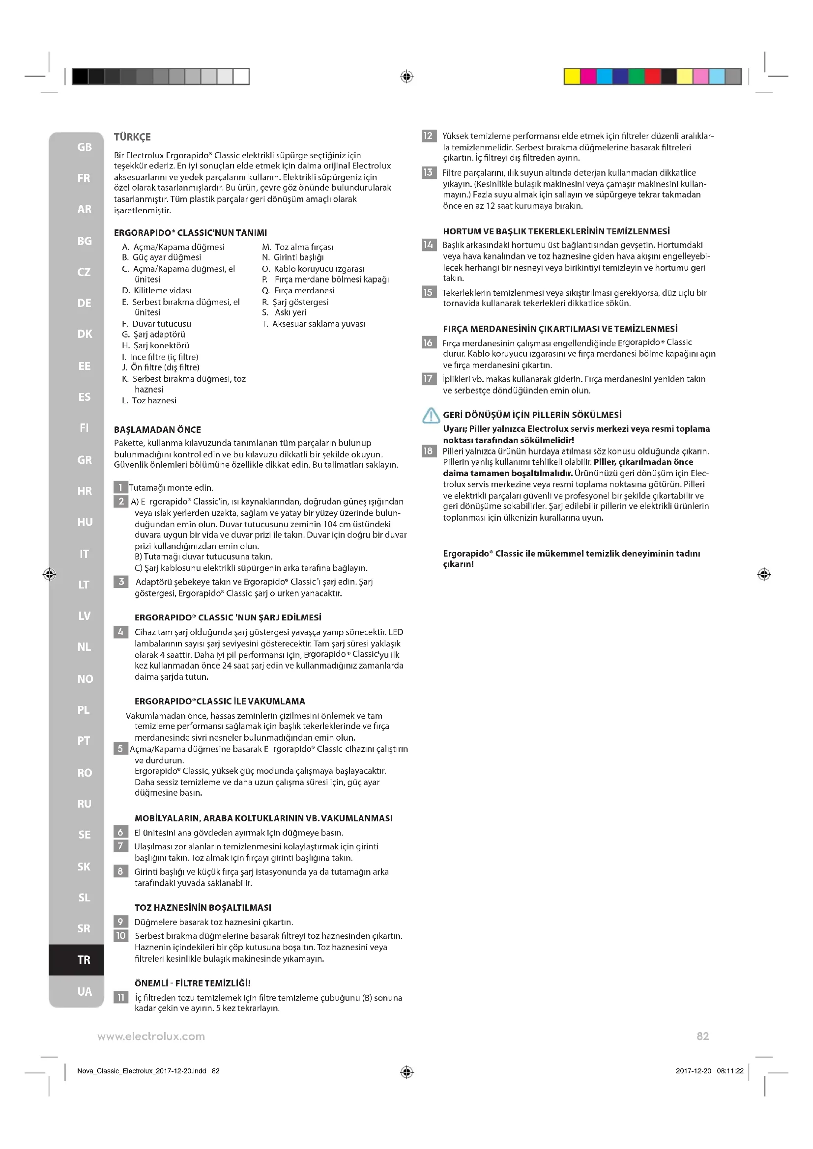 Nova_Classic_Electrolux_2017-12-20.indd 81 2017-12-20 08:11:21TÜRKÇE Bir Electrolux Ergorapido® Classic elektrikli süpürge seçtiğiniz için teşekkür ederiz. En iyi sonuçları elde etmek için daima orijinal Electrolux aksesuarlarını ve yedek parçalarını kullanın. Elektrikli süpürgeniz için özel olarak tasarlanmışlardır. Bu ürün, çevre göz önünde bulundurularak tasarlanmış tır. Tüm plastik parçalar geri dönüşüm amaçlı olarak işaretlenmiştir.