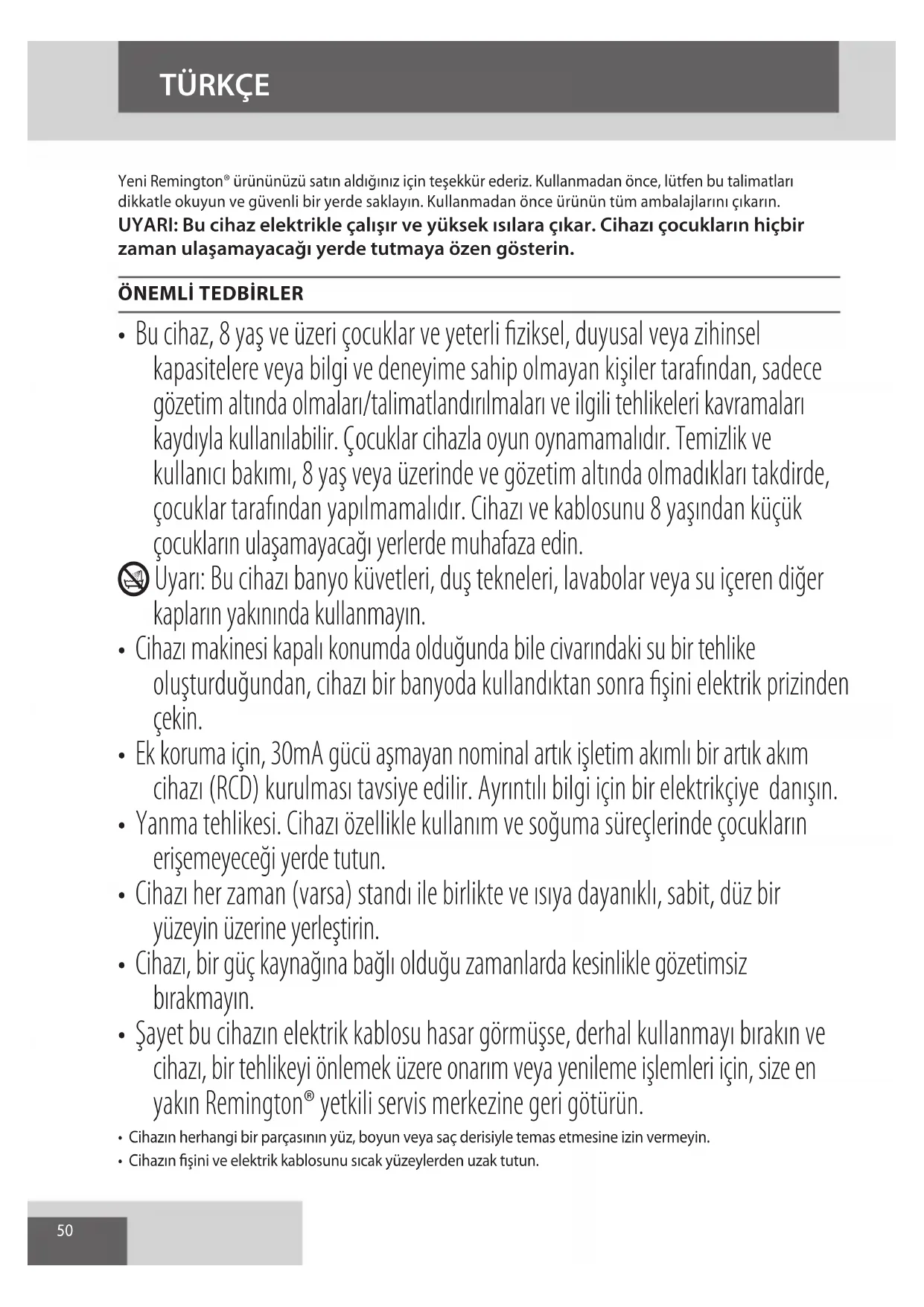 - Şayet bu cihazın elektrik kablosu hasar görmüşse, derhal kullanmayı bırakın ve cihazı, bir tehlikeyi önlemek üzere onarım veya yenileme işlemleri için, size en yakın Remington® yetkili servis merkezine geri götürün.