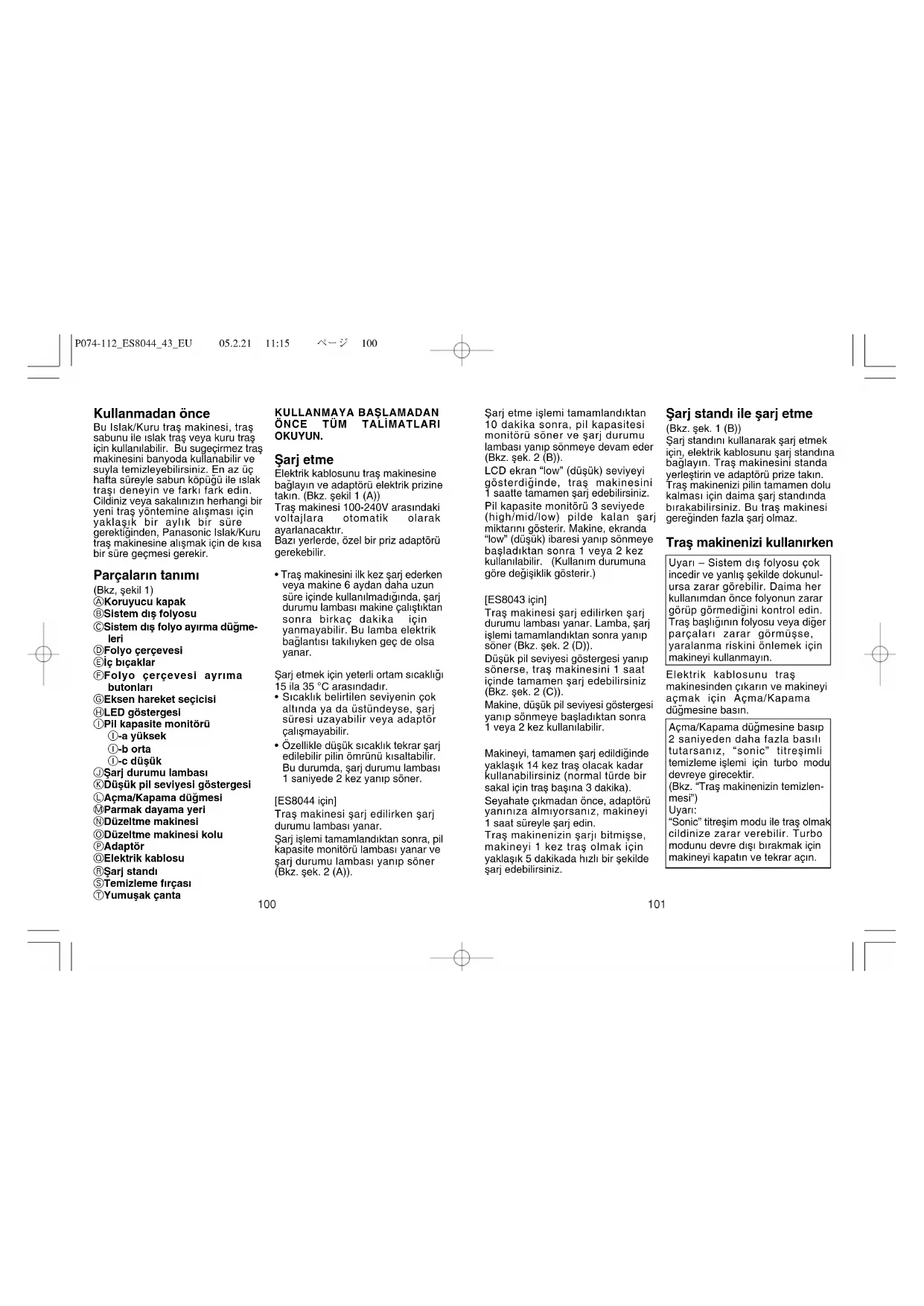 P074-112ES804443EU 05.2.21 11:15 ページ 10010 sokmak için Açma/Kapama dü¤me- sine 2 saniyeden daha fazla süre basın ve basılı tutun. Aynı zamanda, Pil kapasite monitörü (ES8044) lambaları veya Düflük pil seviyesi göstergesi/fiarj durumu lambası (ES8043) rasgele yanıp söner. Dıfl folyo üzerine biraz su dökün. Yaklaflık 20 saniye sonra, makine otomatik olarak kapanacaktır; Açma/ Kapama dü¤mesine basarak açabilirsiniz. Folyo çerçevesini çıkarın, “sonic” titreflimli temizlik yapmak amacıyla turbo modunu devreye sokmak için Açma/Kapama dü¤mesine 2 saniyeden daha fazla basın ve makineyi akan suyun altına tutun. Kuru bir bezle trafl makinesinin nemini alın ve folyo çerçevesi olmadan makineyi kurutun. Fırça temizleme Metal bafll›¤› ç›karmak için metal bafll›k b›rakma dü¤melerine bas›n›z ve yukar› kald›r›n›z (Bkz. flek. 9). Her iki ucundan iyice kavrayarak ve trafl makinesinden dıflarıya çekerek 1 defada iç bıçakları çıkarın. Dıfl folyoları, trafl makinesinin gövdesini ve düzelme makinesini uzun fırça ile temizleyin (Bkz. flek. 10). fiek. 11 (A)’a gösterilen yönde kısa fırçayı hareket ettirerek iç bıçakları temizleyin. ‹ç bıça¤a ve bıça¤ın kesme performansına zarar verece¤i için, fırçayı flek. 11 (B)’de gösterilen yönde hareket ettirmeyin. Dıfl folyoları temizlemek için kısa fırçayı kullanmayın. Trafl bafllı¤ı parçalarının de¤ifltirilmesi Trafl makinenizin kesme performan- sını korumak için sistem dıfl folyosunu yılda 1 kez ve iç bıça¤ı her 2 yılda bir kez de¤ifltirmeniz tavsiye edilmektedir. Sistem dıfl folyosunun de¤ifltiril- mesi (Bkz, flekil 8) Sistem dıfl folyo ayırma butonlarını sıkıfltırın ve çıkarmak için sistem dıfl folyosunu yukarıya kaldırın. Sistem dıfl folyo ayırma butonlarını sıkıfltırın ve çıkarmak için sistem dıfl folyosunu yukarıya kaldırın. ‹ç bıçakların de¤ifltirilmesi (Bkz, flekil 9) Folyo çerçevesi ay›rma butonlar›n› bast›r›n ve ç›karmak için folyo çerçevesini yukar›ya do¤ru kald›r›n. Her iki ucundan iyice kavrayarak ve trafl makinesinden dıflarıya çekerek 1 defada iç bıça¤ı çıkarın. ‹ç bıçakların metal kısımlarına dokunmayın. Yeni iç bıçak takmak için, bıça¤ı her iki ucundan tutun ve trafl makinesine yerleflinceye kadar afla¤ıya do¤ru bastırın. Çevrenin korunması ve geri dönüflümlü malzemeler Bu trafl makinesinde Litium-ion pil bulunur. Kullanılmıfl pili, ülkenizde varsa, resmi olarak belirlenmifl bir yere atın.