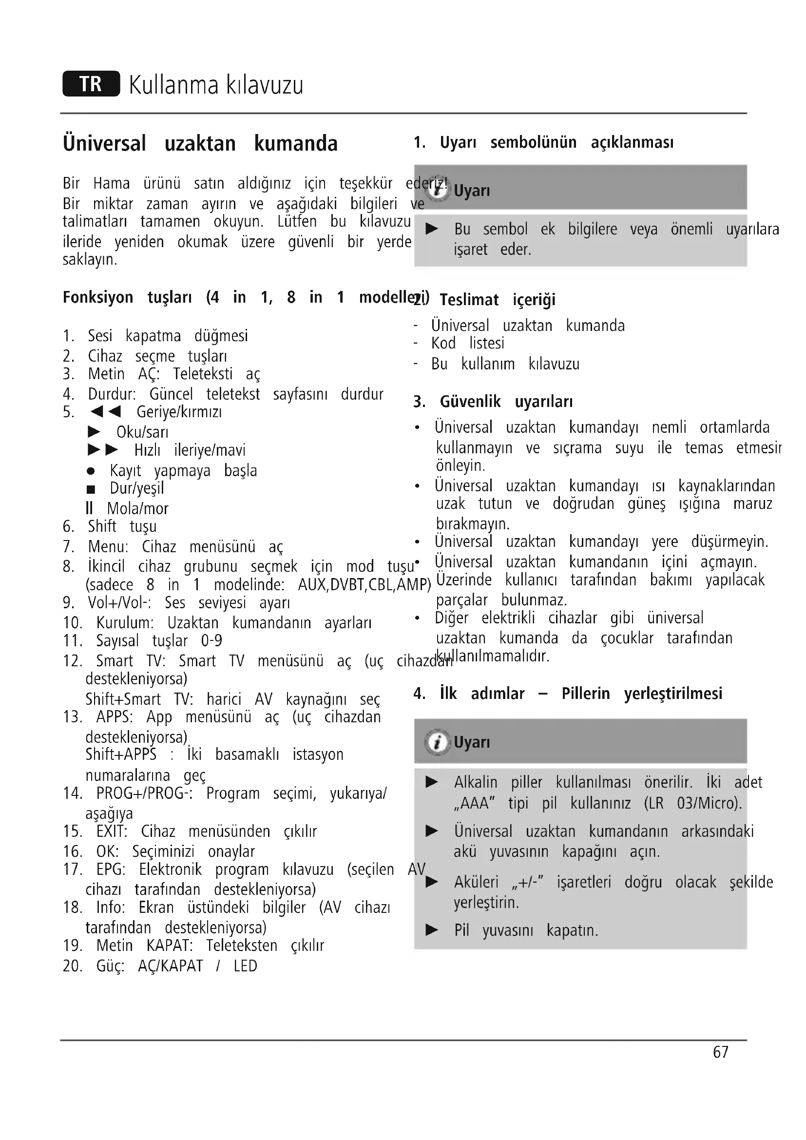 - Diğer elektrikli cihazlar gibi üniversal uzaktan kumanda da çocuklar tarafından kullanılmamalıdır.