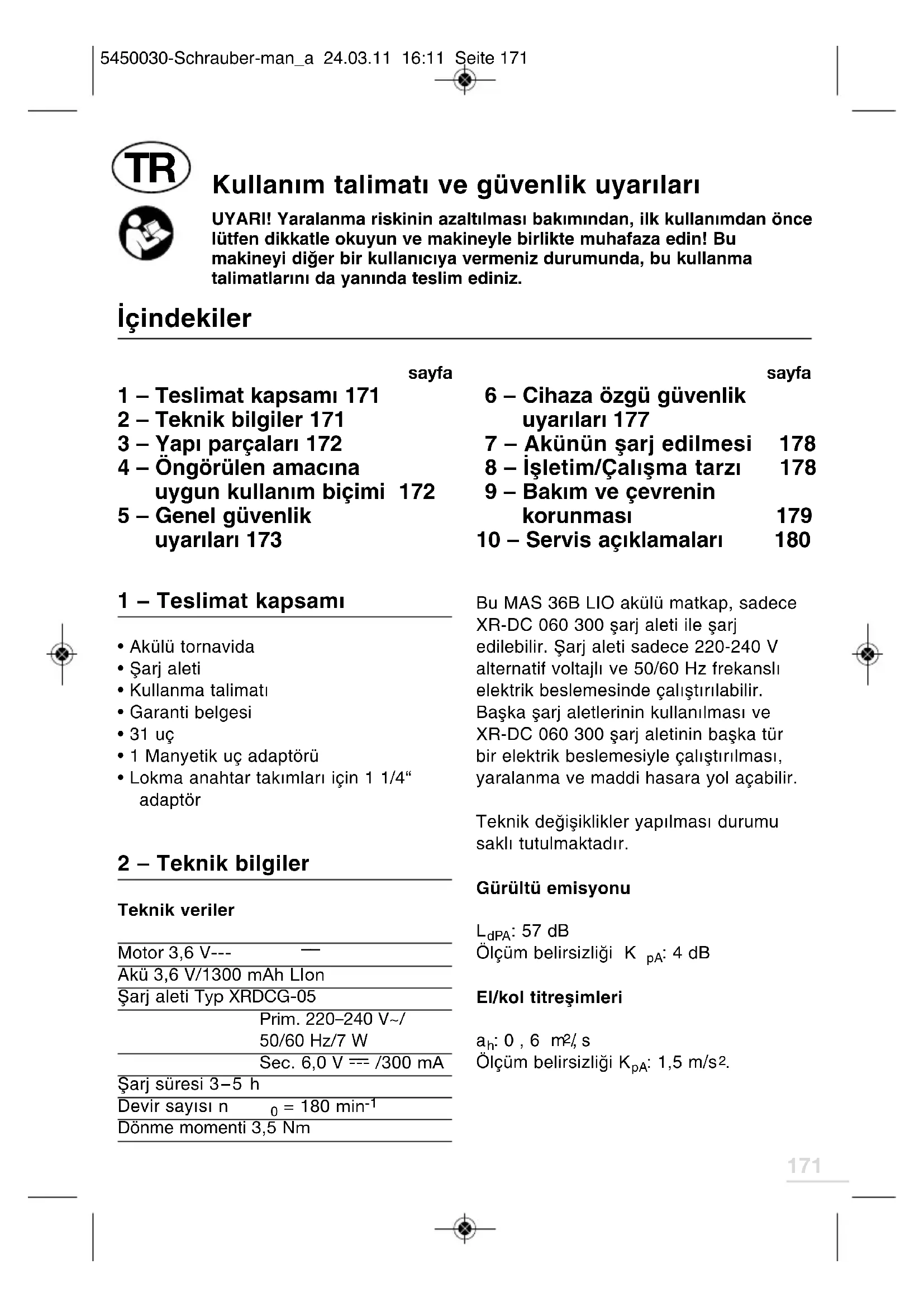 | 1 - Teslimat kapsamı 171 | 6 - Cihaza özgü güvenlik uyarınları 177 | |