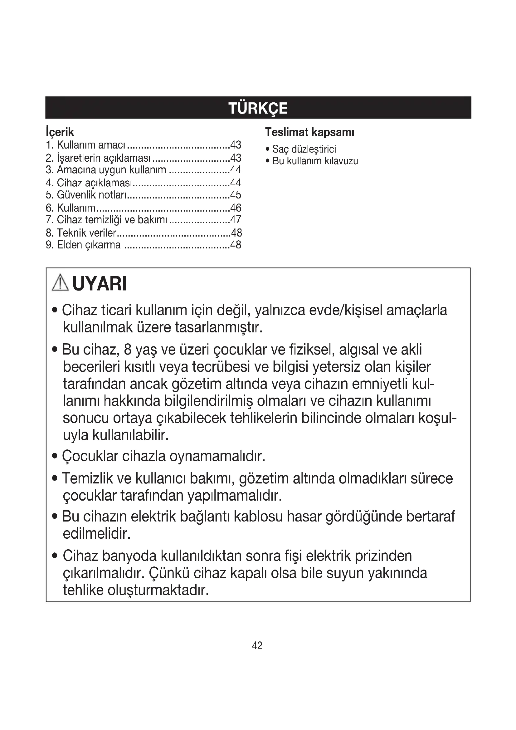 Cihaz banyoda kullanıldıktan sonra fişi elektrik prizinden çıkarılmalıdır. Çünkü cihaz kapalı olsa bile suyun yakınında tehlike oluşturmaktadır.43