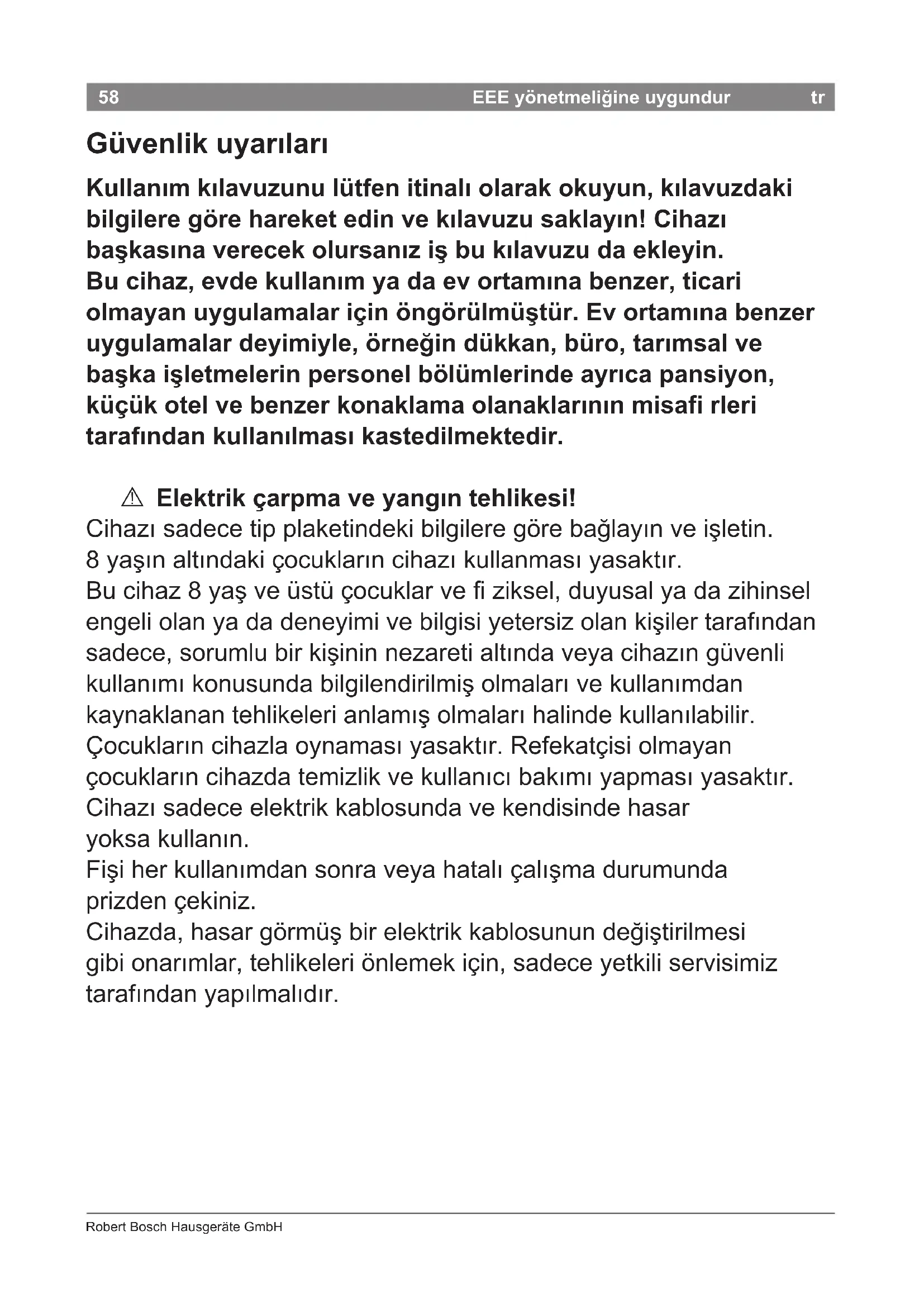 Banyo küvetlerinin, lavaboların veya içinde su bulunan veya içine su dökülen başka haznelerin yakınında kullanmayınız. A Ölüm tehlikesi! Cihaz asla suya temas ettirilmemelidir. Cihaz kapalıyken de tehlike vardır. Bu nedenle kullanımdan sonra ve kullanım esnasında saça uygulamaya ara verildiğinde mutlaka şi çekilmelidir. Evinizdeki elektrik tesisatına 30 mA’e kadar olan bir hata akımı koruma şalterinin montajı ek bir koruma sağlar. Lütfen bir elektrik tesisatçısına başvurarak bilgi alınız. A Boğulma riski! Çocukların ambalaj malzemesiyle oynamasına izin vermeyin. A Yanma tehlikesi! Şekillendirme başlığı ve dağıtıcı çok ısınabilir. Çıkartmadan önce soğumalarını bekleyin.60 Robert Bosch Hausgeräte GmbH