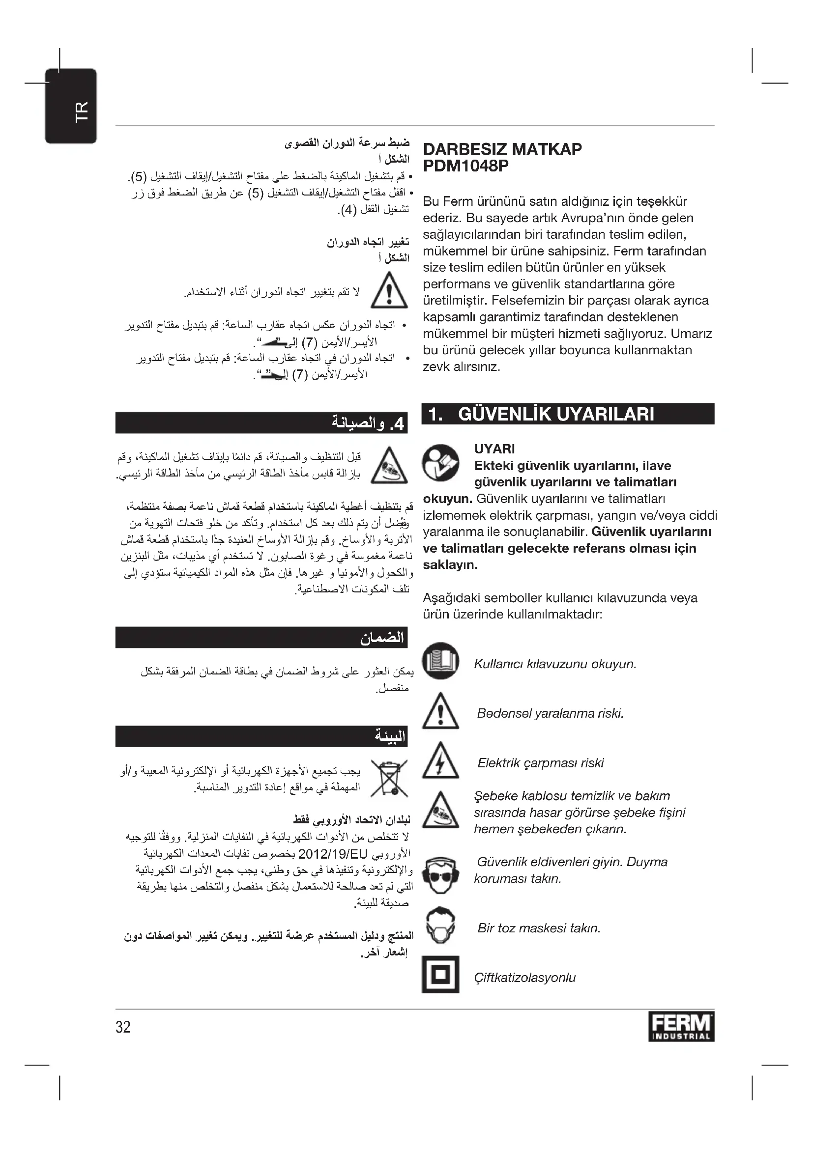 DARBESIZ MATKAP PDM1048P Bu Ferm ürününü satın aldığınız için teşekkür ederiz. Bu sayede artık Avrupa’nın önde gelen sağlayıcılarından biri tarafından teslim edilen, mükemmel bir ürüne sahipsiniz. Ferm tarafından size teslim edilen bütün ürünler en yüksek performans ve güvenlik standartlarına göre üretilmiştir. Felsefemizin bir parçası olarak ayrıca kapsamlı garantimiz tarafından desteklenen mükemmel bir müşteri hizmeti sağlıyoruz. Umarız bu ürünü gelecek yıllar boyunca kullanmaktan zevk alırsınız.