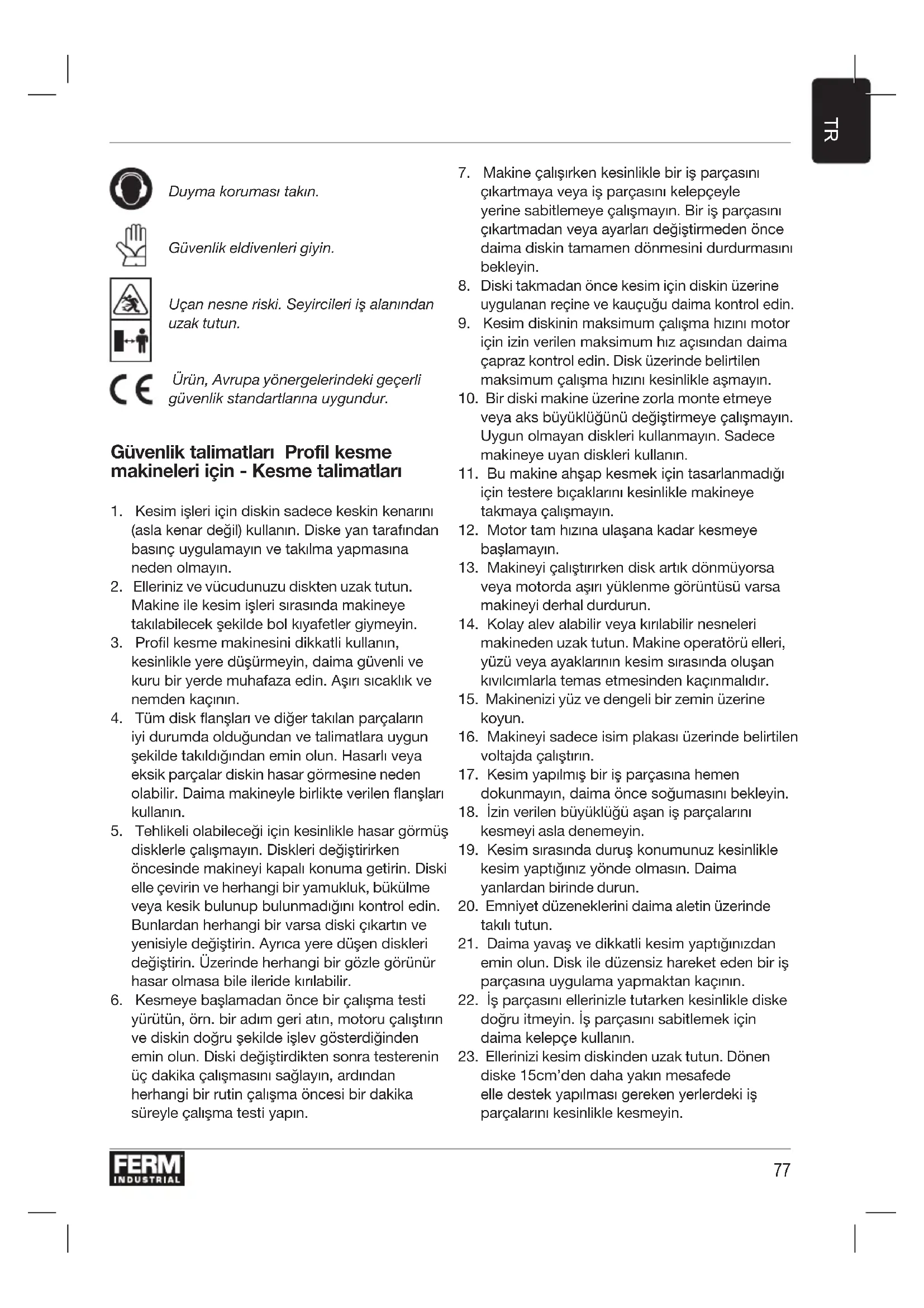 Duyma koruması takın. Güvenlik eldivenleri giyin. Uçan nesne riski. Seyircileri iş alanından uzak tutun. Ürün, Avrupa yönergelerindeki geçerli güvenlik standartlarına uygundur. Güvenlik talimatları Profil kesme makineleri için - Kesme talimatları