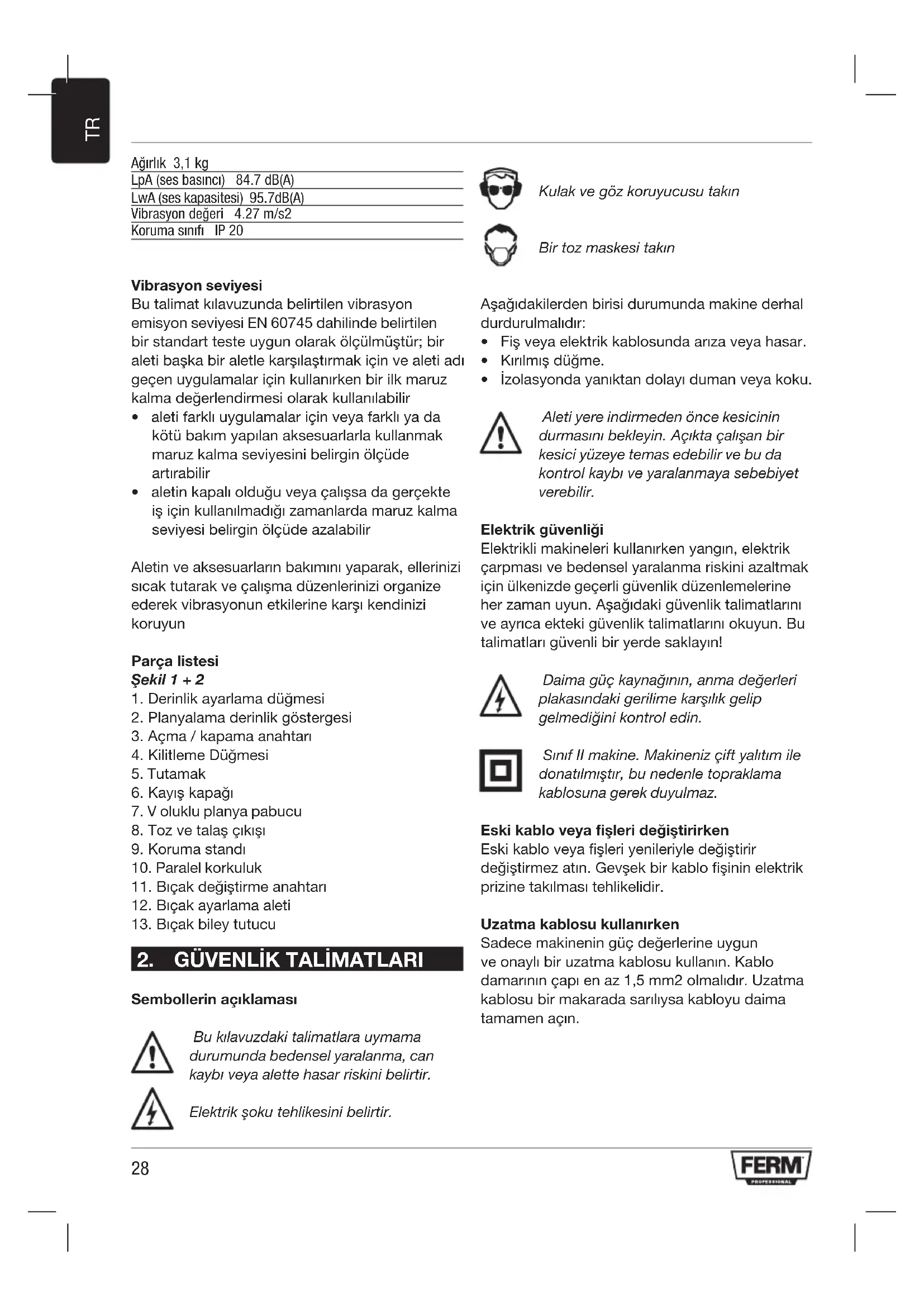 PPM1015P BuFermürününüsatınaldığınıziçinteşekkür ederiz. Bu sayede artık Avrupa’nın önde gelen tedarikçilerinden biri tarafından sunulan, mükemmel bir ürüne sahip oldunuz. Ferm tarafından size sunulan bütün ürünler en yüksek performans ve güvenlik standartlarına göre üretilmiştir. Felsefemizin bir parçası olarak, kapsamlı garantimiz tarafından desteklenen mükemmel bir müşteri hizmeti de sağlıyoruz. Umarız bu ürünü gelecek yıllar boyunca kullanmaktan zevk alırsınız. Aşağıdaki metinde verilen numaralar sayfa 2 + 3’teki resimleri belirtmektedir Makineyi kullanmadan önce bu operatör kullanmakılavuzudikkatlibirşekilde okuyun.Makineninişleyişinivenasıl çalıştırılmasıgerektiğinibildiğinizden emin olun. Makinede talimatlara uygun şekildebakımyaptırınvemakinenin doğruşekildeçalıştığındaneminolun.Bu kullanmakılavuzuvediğerilavebelgeleri makineyle birlikte muhafaza edin. Ürünaçıklaması Çift yalıtıma sahip bu elektrikli alet elle çalıştırılacak şekilde tasarlanmıştır. Bu makine son derece emniyetli ve güvenilir bir şekilde çalışır. Ahşap kiriş veya kalasların planyalanması için uygundur. İçindekiler