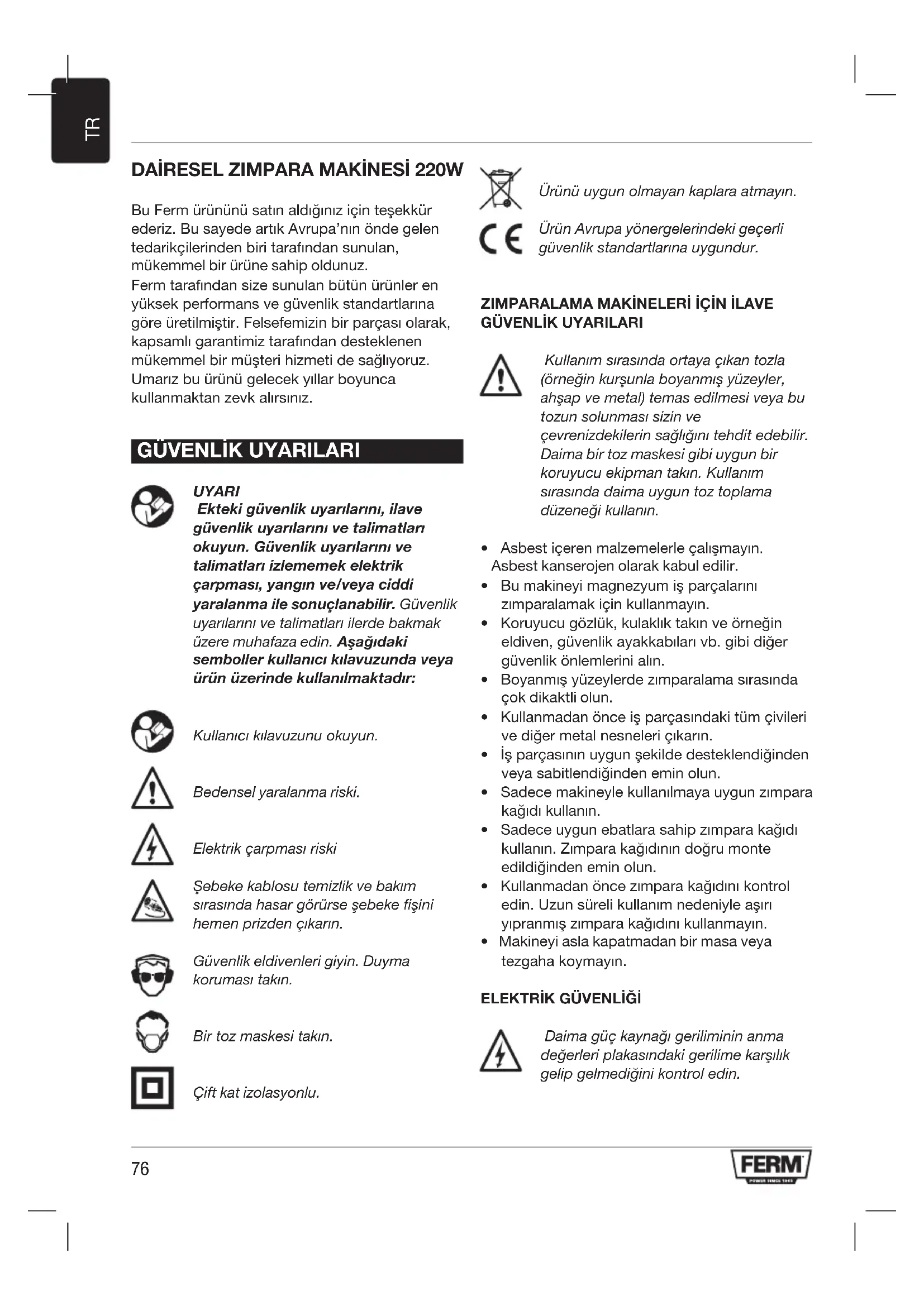 UYARI Ekteki güvenlik uyarılarını, ilave güvenlik uyarılarını ve talimatları okuyun. Güvenlik uyarılarını ve talimatları izlememek elektrik çarpması, yangın ve/veya ciddi yaralanma ile sonuçlanabilir. Güvenlik uyarılarını ve talimatları ilerde bakmak üzere muhafaza edin. Aşağıdaki semboller kullanıcı kılavuzunda veya ürün üzerinde kullanılmaktadır: Kullanıcı kılavuzunu okuyun. Bedensel yaralanma riski. Elektrik çarpması riski Şebeke kablosu temizlik ve bakım sırasında hasar görürse şebeke fişini hemen prizden çıkarın. Güvenlik eldivenleri giyin. Duyma koruması takın. Bir toz maskesi takın. Çift kat izolasyonlu. Ürünü uygun olmayan kaplara atmayın. Ürün Avrupa yönergelerindeki geçerli güvenlik standartlarına uygundur.