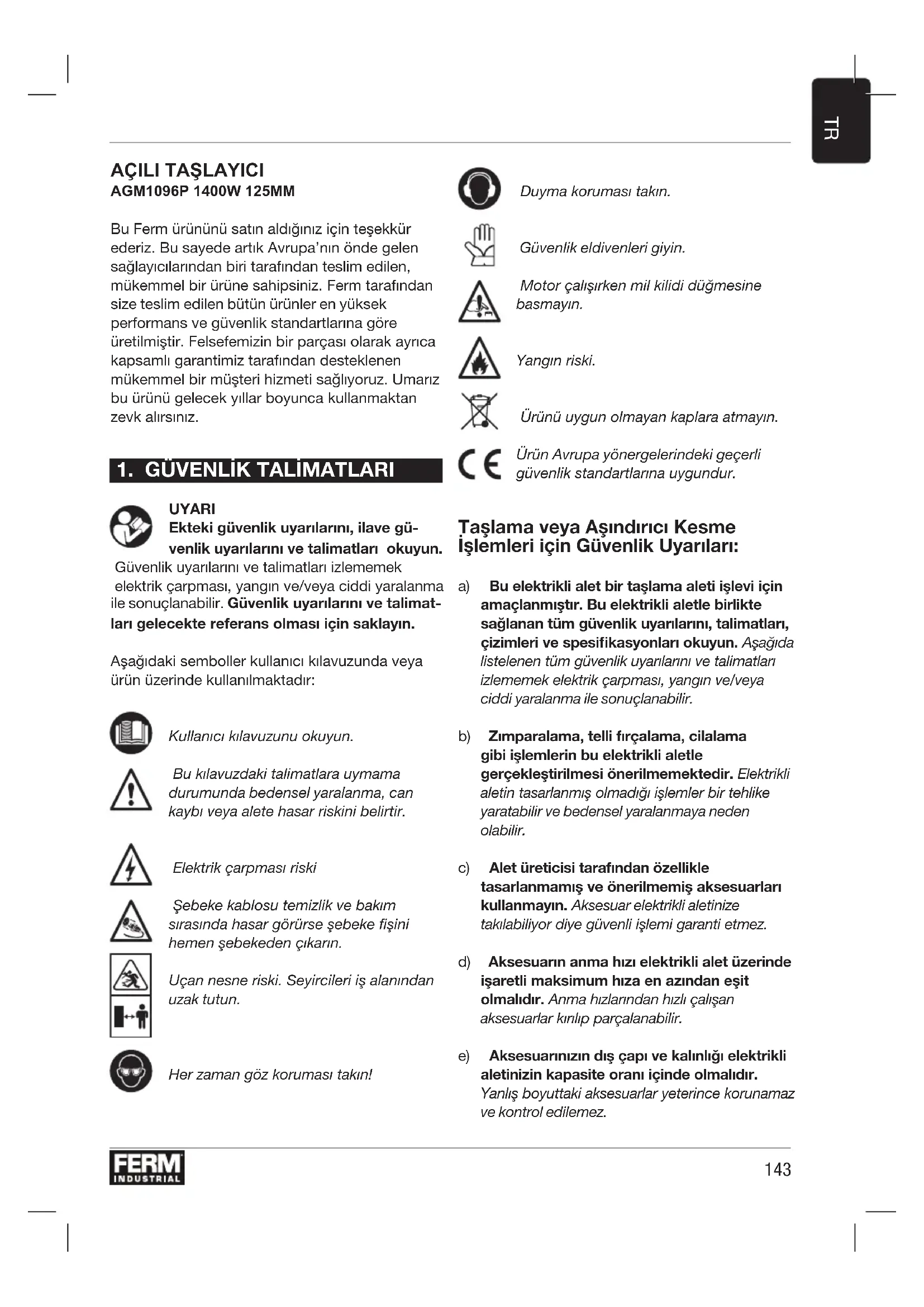UYARI Ekteki güvenlik uyarılarını, ilave gü- venlik uyarılarını ve talimatları okuyun. Güvenlik uyarılarını ve talimatları izlememek elektrik çarpması, yangın ve/veya ciddi yaralanma ile sonuçlanabilir. Güvenlik uyarılarını ve talimat- ları gelecekte referans olması için saklayın. Aşağıdaki semboller kullanıcı kılavuzunda veya ürün üzerinde kullanılmaktadır: Kullanıcı kılavuzunu okuyun. Bu kılavuzdaki talimatlara uymama durumunda bedensel yaralanma, can kaybı veya alete hasar riskini belirtir. Elektrik çarpması riski Şebeke kablosu temizlik ve bakım sırasında hasar görürse şebeke fişini hemen şebekeden çıkarın. Uçan nesne riski. Seyircileri iş alanından uzak tutun. Her zaman göz koruması takın! Duyma koruması takın. Güvenlik eldivenleri giyin. Motor çalışırken mil kilidi düğmesine basmayın. Yangın riski. Ürünü uygun olmayan kaplara atmayın. Ürün Avrupa yönergelerindeki geçerli güvenlik standartlarına uygundur. Taşlama veya Aşındırıcı Kesme İşlemleri için Güvenlik Uyarıları: a) Bu elektrikli alet bir taşlama aleti işlevi için amaçlanmıştır. Bu elektrikli aletle birlikte sağlanan tüm güvenlik uyarılarını, talimatları, çizimleri ve spesikasyonları okuyun. Aşağıda listelenen tüm güvenlik uyarılarını ve talimatları izlememek elektrik çarpması, yangın ve/veya ciddi yaralanma ile sonuçlanabilir. b) Zımparalama, telli fırçalama, cilalama gibi işlemlerin bu elektrikli aletle gerçekleştirilmesi önerilmemektedir. Elektrikli aletin tasarlanmış olmadığı işlemler bir tehlike yaratabilir ve bedensel yaralanmaya neden olabilir. c) Alet üreticisi tarafından özellikle tasarlanmamış ve önerilmemiş aksesuarları kullanmayın. Aksesuar elektrikli aletinize takılabiliyor diye güvenli işlemi garanti etmez. d) Aksesuarın anma hızı elektrikli alet üzerinde işaretli maksimum hıza en azından eşit olmalıdır. Anma hızlarından hızlı çalışan aksesuarlar kırılıp parçalanabilir. e) Aksesuarınızın dış çapı ve kalınlığı elektrikli aletinizin kapasite oranı içinde olmalıdır. Yanlış boyuttaki aksesuarlar yeterince korunamaz ve kontrol edilemez.144