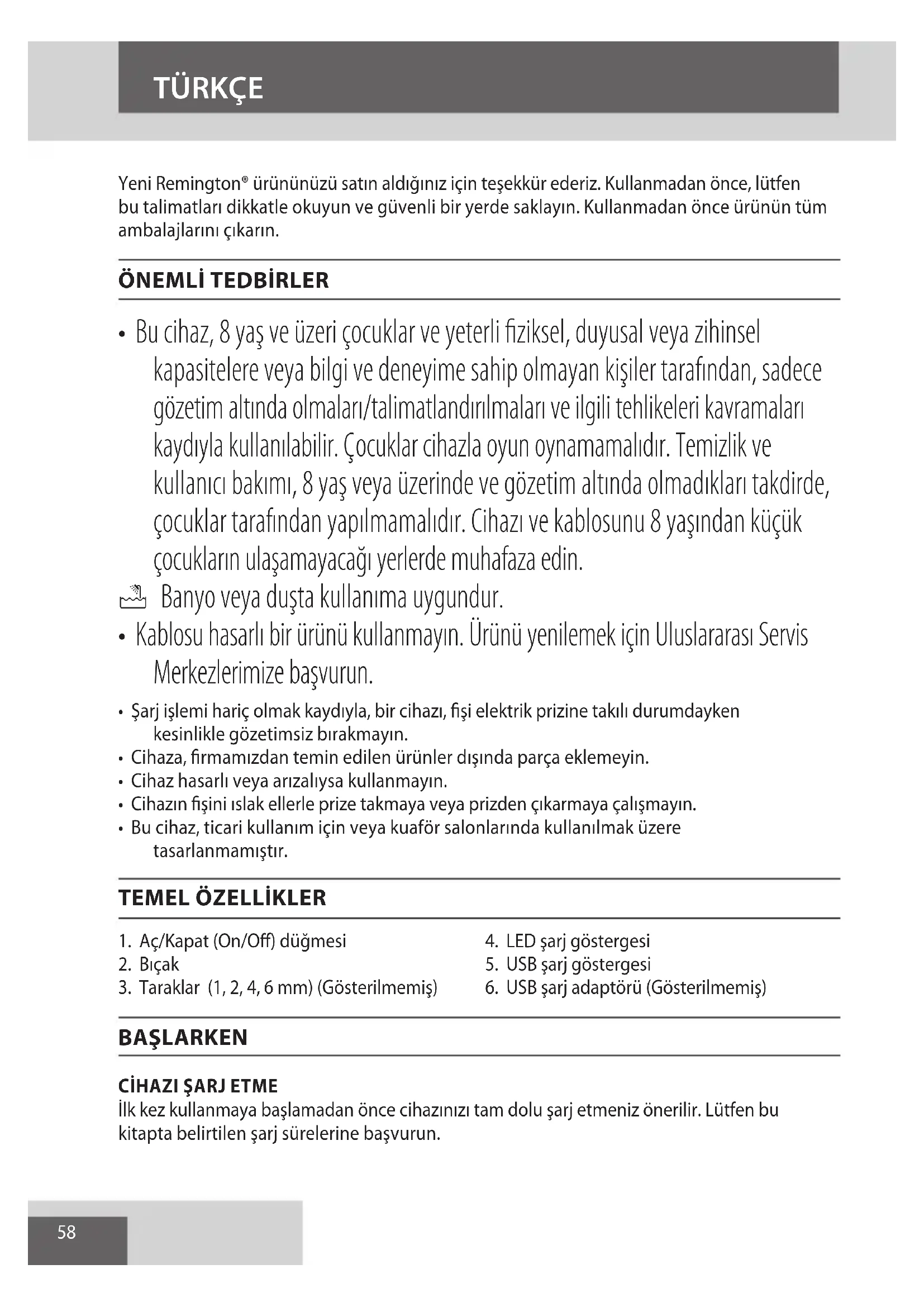 AE58 Yeni Remington® ürününüzü satın aldığınız için teşekkür ederiz. Kullanmadan önce, lütfen bu talimatları dikkatle okuyun ve güvenli bir yerde saklayın. Kullanmadan önce ürünün tüm ambalajlarını çıkarın.