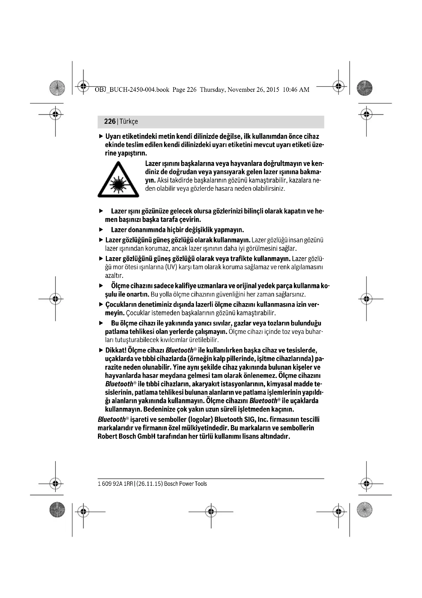 Τα εργαλεία μέτρησης, τα εξαρτήματα και οι συσκευασίες πρέπει να ανακυκλώνονται με τρόπο φιλικό προς το περιβάλλον. Μην ρίξετε τα εργαλεία μέτρησης και τις μπαταρίες στα απορρίμματα του σπιτιού σας! Μόνο για χώρες της ΕΕ: Σύμφωνα με την Κοινοτική Οδηγία 2012/19/EE τα άχρηστα εργαλεία μέτρησης, και σύμφωνα με την Κοινοτική Οδηγία 2006/66/EΚ οι χα- λασμένες ή αναλωμένες μπαταρίες δεν είναι πλέον υποχρεωτικό να συλλέγονται ξεχωριστά για να ανακυκλωθούν με τρόπο φιλικό προς το περιβάλλον. Τηρούμε το δικαίωμα αλλαγών. Türkçe Güvenlik Talimatı Ölçme cihazı ile tehlikesiz ve güvenli biçimde çalışabilmek için bütün güvenlik talimatını ve uyarıları okuyun. Ölçme cihazı bu ta- limata göre kullanılmadığı takdirde alete entegre koruma önlem- lerinin işlevi kısıtlanabilir. Ölçme cihazı üzerindeki uyarı etiketle- rini hiçbir zaman görünmez duruma getirmeyin. BU TALİMATLARI İYİ VE GÜVENLİ BİR YERDE SAKLAYIN VE ÖLÇME CİHAZINI BAŞKASINA VERDİ- ĞİNİZDE BUNLARI DA BİRLİKTE VERİN. Dikkat – Burada belirtilen kullanım veya ayar hükümlerine uyulmadığı veya başka yöntemler kullanıldığı takdirde cihazın çıkaracağı ışınlar kullanıcı için tehlikeli olabilir. Bu elektrikli el aleti bir uyarı etiketi ile teslim edilir (grafik sayfasındaki ölçme cihazının şekli üzerinde 12 numara ile gösterilmektedir). OBJ_BUCH-2450-004.book Page 225 Thursday, November 26, 2015 10:46 AM226 | Türkçe 1 609 92A 1RR | (26.11.15) Bosch Power Tools Uyarı etiketindeki metin kendi dilinizde değilse, ilk kullanımdan önce cihaz ekinde teslim edilen kendi dilinizdeki uyarı etiketini mevcut uyarı etiketi üze- rine yapıştırın. Lazer ışınını başkalarına veya hayvanlara doğrultmayın ve ken- diniz de doğrudan veya yansıyarak gelen lazer ışınına bakma- yın. Aksi takdirde başkalarının gözünü kamaştırabilir, kazalara ne- den olabilir veya gözlerde hasara neden olabilirsiniz. Lazer ışını gözünüze gelecek olursa gözlerinizi bilinçli olarak kapatın ve he- men başınızı başka tarafa çevirin. Lazer donanımında hiçbir değişiklik yapmayın. Lazer gözlüğünü güneş gözlüğü olarak kullanmayın. Lazer gözlüğü insan gözünü lazer ışınından korumaz, ancak lazer ışınının daha iyi görülmesini sağlar. Lazer gözlüğünü güneş gözlüğü olarak veya trafikte kullanmayın. Lazer gözlü- ğü mor ötesi ışınlarına (UV) karşı tam olarak koruma sağlamaz ve renk algılamasını azaltır. Ölçme cihazını sadece kalifiye uzmanlara ve orijinal yedek parça kullanma ko- şulu ile onartın. Bu yolla ölçme cihazının güvenliğini her zaman sağlarsınız. Çocukların denetiminiz dışında lazerli ölçme cihazını kullanmasına izin ver- meyin. Çocuklar istemeden başkalarının gözünü kamaştırabilir. Bu ölçme cihazı ile yakınında yanıcı sıvılar, gazlar veya tozların bulunduğu patlama tehlikesi olan yerlerde çalışmayın. Ölçme cihazı içinde toz veya buhar- ları tutuşturabilecek kıvılcımlar üretilebilir. Dikkat! Ölçme cihazı Bluetooth® ile kullanılırken başka cihaz ve tesislerde, uçaklarda ve tıbbi cihazlarda (örneğin kalp pillerinde, işitme cihazlarında) pa- razite neden olunabilir. Yine aynı şekilde cihaz yakınında bulunan kişeler ve hayvanlarda hasar meydana gelmesi tam olarak önlenemez. Ölçme cihazını Bluetooth® ile tıbbi cihazların, akaryakıt istasyonlarının, kimyasal madde te- sislerinin, patlama tehlikesi bulunan alanların ve patlama işlemlerinin yapıldı- ğı alanların yakınında kullanmayın. Ölçme cihazını Bluetooth® ile uçaklarda kullanmayın. Bedeninize çok yakın uzun süreli işletmeden kaçının. Bluetooth® işareti ve semboller (logolar) Bluetooth SIG, Inc. firmasının tescilli markalarıdır ve firmanın özel mülkiyetindedir. Bu markaların ve sembollerin Robert Bosch GmbH tarafından her türlü kullanımı lisans altındadır. OBJ_BUCH-2450-004.book Page 226 Thursday, November 26, 2015 10:46 AMTürkçe | 227 Bosch Power Tools 1 609 92A 1RR | (26.11.15) Ürün ve işlev tanımı Lütfen ölçme cihazının bulunduğu kapağı açın ve kullanım kılavuzunu okuduğunuz sü- rece bu kapağı açık tutun. Usulüne uygun kullanım Bu ölçme cihazı, uzaklıkların, uzunlukların, yüksekliklerin, mesafelerin, eğimlerin öl- çülmesi ve yüzey ve hacimlerin hesaplanması için tasarlanmıştır. Ölçme sonuçları Bluetooth® üzerinden diğer cihazlara aktarılabilir. Teknik veriler Dijital lazerli uzaklıkölçer GLM 50 C Ürün kodu 3601K72C.. Ölçme aralığı (tipik) 0,05–50 m