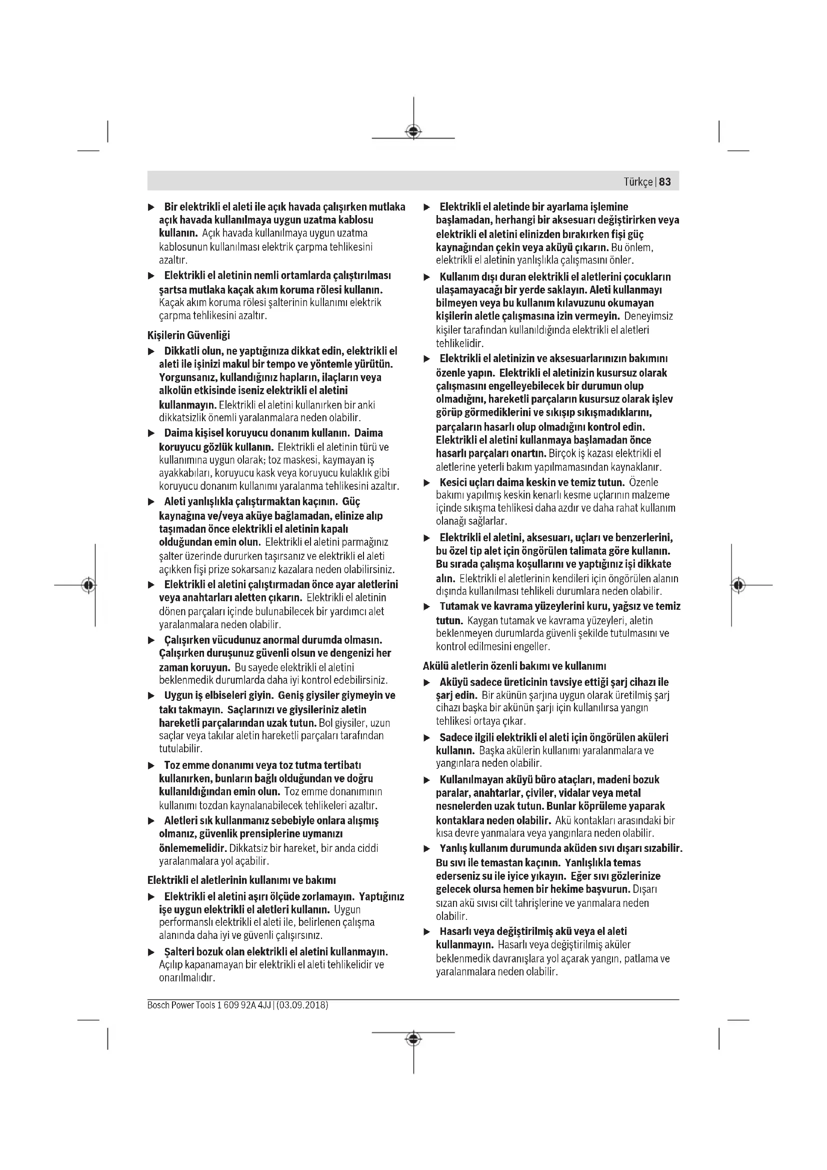 Τα ηλεκτρικά εργαλεία, οι μπαταρίες, τα εξαρτήματα και οι συσκευασίες πρέπει να ανακυκλώνονται με τρόπο φιλικό προς το περιβάλλον. Μην ρίχνετε τα ηλεκτρικά εργαλεία και τις μπαταρίες στα απορρίμματα του σπιτιού σας! Μόνο για χώρες τηςΕΕ: Σύμφωνα με την Ευρωπαϊκή οδηγία 2012/19/ΕΕ τα άχρηστα ηλεκτρικά εργαλεία και σύμφωνα με την Ευρωπαϊκή οδηγία 2006/66/ΕΚ οι χαλασμένες ή χρησιμοποιημένες μπαταρίες πρέπει να συλλέγονται ξεχωριστά για να ανακυκλωθούν με τρόπο φιλικό προς το περιβάλλον. Μπαταρίες/Επαναφορτιζόμενες μπαταρίες: Li-Ion: Προσέξτε παρακαλώ τις υποδείξεις στην ενότητα Μεταφορά (βλέπε «Μεταφορά», Σελίδα82). Türkçe Güvenlik talimatı Elektrikli el aletleri için genel güvenlik uyarıları UYARI Bu elektrikli el aletiyle birlikte gelen tüm güvenlik uyarılarını, talimatları, resim ve açıklamaları okuyun. Aşağıda bulunan talimatlara uyulmaması halinde elektrik çarpmalarına, yangınlara ve/veya ağır yaralanmalara neden olabilir. Bütün uyarıları ve talimat hükümlerini ileride kullanmak üzere saklayın. Uyarı ve talimat hükümlerinde kullanılan "elektrikli el aleti" terimi, akım şebekesine bağlı (elektrikli) aletlerle akü ile çalışan aletleri (akülü) kapsamaktadır. Çalışma yeri güvenliği u Çalıştığınız yeri temiz tutun ve iyi aydınlatın. Dağınık veya karanlık alanlar kazalara davetiye çıkarır. u Yakınında patlayıcı maddeler, yanıcı sıvı, gaz veya tozların bulunduğu yerlerde elektrikli el aleti ile çalışmayın. Elektrikli el aletleri, toz veya buharların tutuşmasına neden olabilecek kıvılcımlar çıkarırlar. u Elektrikli el aleti ile çalışırken çocukları ve etraftaki kişileri uzakta tutun. Dikkatiniz dağılacak olursa aletin kontrolünü kaybedebilirsiniz. Elektrik Güvenliği u Elektrikli el aletinin fişi prize uymalıdır. Fişi hiçbir zaman değiştirmeyin. Korumalı (topraklanmış) elektrikli el aletleri ile birlikte adaptör fiş kullanmayın. Değiştirilmemiş fiş ve uygun priz elektrik çarpma tehlikesini azaltır. u Borular, kalorifer petekleri, ısıtıcılar ve buzdolapları gibi topraklanmış yüzeylerle vücudunuzun temas etmesinden kaçının. Vücudunuz topraklandığı anda büyük bir elektrik çarpma tehlikesi ortaya çıkar. u Elektrikli el aletlerini yağmur altında veya nemli ortamlarda bırakmayın. Suyun elektrikli el aleti içine sızması elektrik çarpma tehlikesini artırır. u Kabloya zarar vermeyin. Elektrikli el aletini kablosundan tutarak taşımayın, kabloyu kullanarak çekmeyin veya kablodan çekerek fişi çıkarmayın. Kabloyu ateş, yanıcı ve/veya keskin ve hareket eden maddelerden uzak tutun. Hasarlı veya dolaşmış kablo elektrik çarpma tehlikesini artırır.u Bir elektrikli el aleti ile açık havada çalışırken mutlaka açık havada kullanılmaya uygun uzatma kablosu kullanın. Açık havada kullanılmaya uygun uzatma kablosunun kullanılması elektrik çarpma tehlikesini azaltır. u Elektrikli el aletinin nemli ortamlarda çalıştırılması şartsa mutlaka kaçak akım koruma rölesi kullanın. Kaçak akım koruma rölesi şalterinin kullanımı elektrik çarpma tehlikesini azaltır. Kişilerin Güvenliği u Dikkatli olun, ne yaptığınıza dikkat edin, elektrikli el aleti ile işinizi makul bir tempo ve yöntemle yürütün. Yorgunsanız, kullandığınız hapların, ilaçların veya alkolün etkisinde iseniz elektrikli el aletini kullanmayın. Elektrikli el aletini kullanırken bir anki dikkatsizlik önemli yaralanmalara neden olabilir. u Daima kişisel koruyucu donanım kullanın. Daima koruyucu gözlük kullanın. Elektrikli el aletinin türü ve kullanımına uygun olarak; toz maskesi, kaymayan iş ayakkabıları, koruyucu kask veya koruyucu kulaklık gibi koruyucu donanım kullanımı yaralanma tehlikesini azaltır. u Aleti yanlışlıkla çalıştırmaktan kaçının. Güç kaynağına ve/veya aküye bağlamadan, elinize alıp taşımadan önce elektrikli el aletinin kapalı olduğundan emin olun. Elektrikli el aletini parmağınız şalter üzerinde dururken taşırsanız ve elektrikli el aleti açıkken fişi prize sokarsanız kazalara neden olabilirsiniz. u Elektrikli el aletini çalıştırmadan önce ayar aletlerini veya anahtarları aletten çıkarın. Elektrikli el aletinin dönen parçaları içinde bulunabilecek bir yardımcı alet yaralanmalara neden olabilir. u Çalışırken vücudunuz anormal durumda olmasın. Çalışırken duruşunuz güvenli olsun ve dengenizi her zaman koruyun. Bu sayede elektrikli el aletini beklenmedik durumlarda daha iyi kontrol edebilirsiniz. u Uygun iş elbiseleri giyin. Geniş giysiler giymeyin ve takı takmayın. Saçlarınızı ve giysileriniz aletin hareketli parçalarından uzak tutun. Bol giysiler, uzun saçlar veya takılar aletin hareketli parçaları tarafından tutulabilir. u Toz emme donanımı veya toz tutma tertibatı kullanırken, bunların bağlı olduğundan ve doğru kullanıldığından emin olun. Toz emme donanımının kullanımı tozdan kaynalanabilecek tehlikeleri azaltır. u Aletleri sık kullanmanız sebebiyle onlara alışmış olmanız, güvenlik prensiplerine uymanızı önlememelidir. Dikkatsiz bir hareket, bir anda ciddi yaralanmalara yol açabilir. Elektrikli el aletlerinin kullanımı ve bakımı u Elektrikli el aletini aşırı ölçüde zorlamayın. Yaptığınız işe uygun elektrikli el aletleri kullanın. Uygun performanslı elektrikli el aleti ile, belirlenen çalışma 