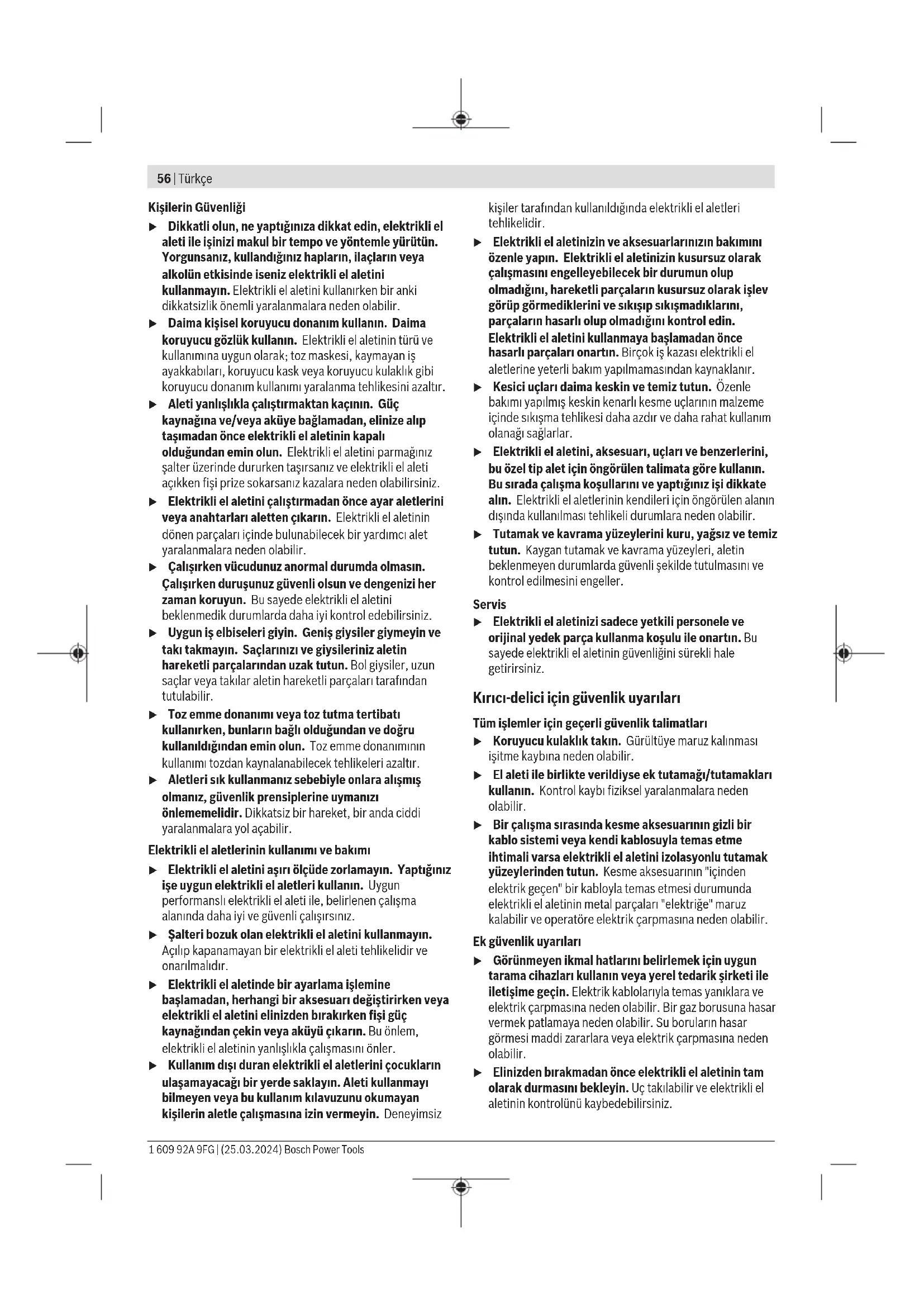 Μην ρίχνετε τα ηλεκτρικά εργαλεία στα απορρίμ- ματα του σπιτιού σας! Μόνο για χώρες τηςΕΕ: Τα άχρηστα ηλεκτρικά εργαλεία πρέπει να αποσύρονται ξεχω- ριστά. Χρησιμοποιείτε τα προβλεπόμενα συστήματα συλλογής. Σε περίπτωση μη ενδεδειγμένης απόσυρσης οι ηλεκτρικές και ηλεκτρονικές συσκευές λόγω ενδεχομένης παρουσίας επικίν- δυνων ουσιών μπορούν να έχουν επιβλαβείς επιπτώσεις στο περιβάλλον και στην ανθρώπινη υγεία. Türkçe Güvenlik talimatı Elektrikli el aletleri için genel güvenlik uyarıları UYARI Bu elektrikli el aletiyle birlikte gelen tüm güvenlik uyarılarını, talimatları, resim ve açıklamaları okuyun. Aşağıda bulunan talimatlara uyulmaması halinde elektrik çarpmalarına, yangınlara ve/veya ağır yaralanmalara neden olabilir. Bütün uyarıları ve talimat hükümlerini ileride kullanmak üzere saklayın. Uyarı ve talimat hükümlerinde kullanılan "elektrikli el aleti" terimi, akım şebekesine bağlı (elektrikli) aletlerle akü ile çalışan aletleri (akülü) kapsamaktadır. Çalışma yeri güvenliği u Çalıştığınız yeri temiz tutun ve iyi aydınlatın. Dağınık veya karanlık alanlar kazalara davetiye çıkarır. u Yakınında patlayıcı maddeler, yanıcı sıvı, gaz veya tozların bulunduğu yerlerde elektrikli el aleti ile çalışmayın. Elektrikli el aletleri, toz veya buharların tutuşmasına neden olabilecek kıvılcımlar çıkarırlar. u Elektrikli el aleti ile çalışırken çocukları ve etraftaki kişileri uzakta tutun. Dikkatiniz dağılacak olursa aletin kontrolünü kaybedebilirsiniz. Elektrik Güvenliği u Elektrikli el aletinin fişi prize uymalıdır. Fişi hiçbir zaman değiştirmeyin. Korumalı (topraklanmış) elektrikli el aletleri ile birlikte adaptör fiş kullanmayın. Değiştirilmemiş fiş ve uygun priz elektrik çarpma tehlikesini azaltır. u Borular, kalorifer petekleri, ısıtıcılar ve buzdolapları gibi topraklanmış yüzeylerle vücudunuzun temas etmesinden kaçının. Vücudunuz topraklandığı anda büyük bir elektrik çarpma tehlikesi ortaya çıkar. u Elektrikli el aletlerini yağmur altında veya nemli ortamlarda bırakmayın. Suyun elektrikli el aleti içine sızması elektrik çarpma tehlikesini artırır. u Kabloya zarar vermeyin. Elektrikli el aletini kablosundan tutarak taşımayın, kabloyu kullanarak çekmeyin veya kablodan çekerek fişi çıkarmayın. Kabloyu ateş, yanıcı ve/veya keskin ve hareket eden maddelerden uzak tutun. Hasarlı veya dolaşmış kablo elektrik çarpma tehlikesini artırır. u Bir elektrikli el aleti ile açık havada çalışırken mutlaka açık havada kullanılmaya uygun uzatma kablosu kullanın. Açık havada kullanılmaya uygun uzatma kablosunun kullanılması elektrik çarpma tehlikesini azaltır. u Elektrikli el aletinin nemli ortamlarda çalıştırılması şartsa mutlaka kaçak akım koruma rölesi kullanın. Kaçak akım koruma rölesi şalterinin kullanımı elektrik çarpma tehlikesini azaltır. Bosch Power Tools 1 609 92A 9FG | (25.03.2024)56 | Türkçe Kişilerin Güvenliği u Dikkatli olun, ne yaptığınıza dikkat edin, elektrikli el aleti ile işinizi makul bir tempo ve yöntemle yürütün. Yorgunsanız, kullandığınız hapların, ilaçların veya alkolün etkisinde iseniz elektrikli el aletini kullanmayın. Elektrikli el aletini kullanırken bir anki dikkatsizlik önemli yaralanmalara neden olabilir. u Daima kişisel koruyucu donanım kullanın. Daima koruyucu gözlük kullanın. Elektrikli el aletinin türü ve kullanımına uygun olarak; toz maskesi, kaymayan iş ayakkabıları, koruyucu kask veya koruyucu kulaklık gibi koruyucu donanım kullanımı yaralanma tehlikesini azaltır. u Aleti yanlışlıkla çalıştırmaktan kaçının. Güç kaynağına ve/veya aküye bağlamadan, elinize alıp taşımadan önce elektrikli el aletinin kapalı olduğundan emin olun. Elektrikli el aletini parmağınız şalter üzerinde dururken taşırsanız ve elektrikli el aleti açıkken fişi prize sokarsanız kazalara neden olabilirsiniz. u Elektrikli el aletini çalıştırmadan önce ayar aletlerini veya anahtarları aletten çıkarın. Elektrikli el aletinin dönen parçaları içinde bulunabilecek bir yardımcı alet yaralanmalara neden olabilir. u Çalışırken vücudunuz anormal durumda olmasın. Çalışırken duruşunuz güvenli olsun ve dengenizi her zaman koruyun. Bu sayede elektrikli el aletini beklenmedik durumlarda daha iyi kontrol edebilirsiniz. u Uygun iş elbiseleri giyin. Geniş giysiler giymeyin ve takı takmayın. Saçlarınızı ve giysileriniz aletin hareketli parçalarından uzak tutun. Bol giysiler, uzun saçlar veya takılar aletin hareketli parçaları tarafından tutulabilir. u Toz emme donanımı veya toz tutma tertibatı kullanırken, bunların bağlı olduğundan ve doğru kullanıldığından emin olun. Toz emme donanımının kullanımı tozdan kaynalanabilecek tehlikeleri azaltır. u Aletleri sık kullanmanız sebebiyle onlara alışmış olmanız, güvenlik prensiplerine uymanızı önlememelidir. Dikkatsiz bir hareket, bir anda ciddi yaralanmalara yol açabilir. Elektrikli el aletlerinin kullanımı ve bakımı u Elektrikli el aletini aşırı ölçüde zorlamayın. Yaptığınız işe uygun elektrikli el aletleri kullanın. Uygun performanslı elektrikli el aleti ile, belirlenen çalışma alanında daha iyi ve güvenli çalışırsınız. u Şalteri bozuk olan elektrikli el aletini kullanmayın. Açılıp kapanamayan bir elektrikli el aleti tehlikelidir ve onarılmalıdır. u Elektrikli el aletinde bir ayarlama işlemine başlamadan, herhangi bir aksesuarı değiştirirken veya