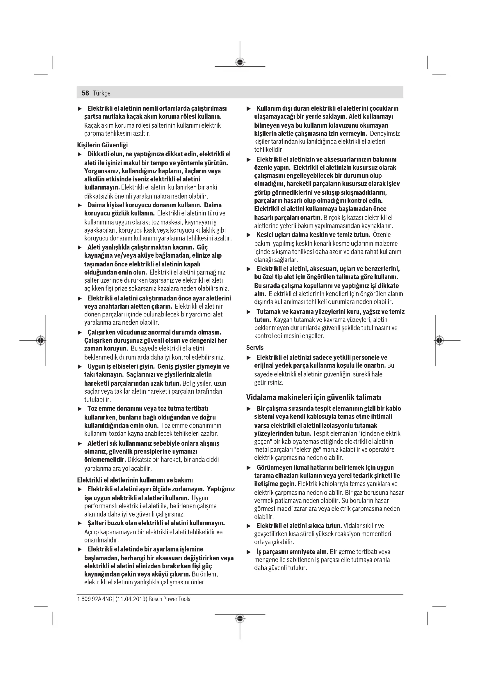 Τα ηλεκτρικά εργαλεία, τα εξαρτήματα και οι συσκευασίες πρέπει να ανακυκλώνονται με τρόπο φιλικό προς το περιβάλλον. Μην ρίχνετε τα ηλεκτρικά εργαλεία στα απορρίμματα του σπιτιού σας! Μόνο για χώρες τηςΕΕ: Σύμφωνα με την Ευρωπαϊκή Οδηγία 2012/19/ΕΕ σχετικά με τις παλιές ηλεκτρικές και ηλεκτρονικές συσκευές και τη μεταφορά της οδηγίας αυτής σε εθνικό δίκαιο δεν είναι πλέον υποχρεωτικό, τα άχρηστα ηλεκτρικά εργαλεία να συλλέγονται ξεχωριστά για να ανακυκλωθούν με τρόπο φιλικό προς το περιβάλλον. Türkçe Güvenlik talimatı Elektrikli el aletleri için genel güvenlik uyarıları UYARI Bu elektrikli el aletiyle birlikte gelen tüm güvenlik uyarılarını, talimatları, resim ve açıklamaları okuyun. Aşağıda bulunan talimatlara uyulmaması halinde elektrik çarpmalarına, yangınlara ve/veya ağır yaralanmalara neden olabilir. Bütün uyarıları ve talimat hükümlerini ileride kullanmak üzere saklayın. Uyarı ve talimat hükümlerinde kullanılan "elektrikli el aleti" terimi, akım şebekesine bağlı (elektrikli) aletlerle akü ile çalışan aletleri (akülü) kapsamaktadır. Çalışma yeri güvenliği u Çalıştığınız yeri temiz tutun ve iyi aydınlatın. Dağınık veya karanlık alanlar kazalara davetiye çıkarır. u Yakınında patlayıcı maddeler, yanıcı sıvı, gaz veya tozların bulunduğu yerlerde elektrikli el aleti ile çalışmayın. Elektrikli el aletleri, toz veya buharların tutuşmasına neden olabilecek kıvılcımlar çıkarırlar. u Elektrikli el aleti ile çalışırken çocukları ve etraftaki kişileri uzakta tutun. Dikkatiniz dağılacak olursa aletin kontrolünü kaybedebilirsiniz. Elektrik Güvenliği u Elektrikli el aletinin fişi prize uymalıdır. Fişi hiçbir zaman değiştirmeyin. Korumalı (topraklanmış) elektrikli el aletleri ile birlikte adaptör fiş kullanmayın. Değiştirilmemiş fiş ve uygun priz elektrik çarpma tehlikesini azaltır. u Borular, kalorifer petekleri, ısıtıcılar ve buzdolapları gibi topraklanmış yüzeylerle vücudunuzun temas etmesinden kaçının. Vücudunuz topraklandığı anda büyük bir elektrik çarpma tehlikesi ortaya çıkar. u Elektrikli el aletlerini yağmur altında veya nemli ortamlarda bırakmayın. Suyun elektrikli el aleti içine sızması elektrik çarpma tehlikesini artırır. u Kabloya zarar vermeyin. Elektrikli el aletini kablosundan tutarak taşımayın, kabloyu kullanarak çekmeyin veya kablodan çekerek fişi çıkarmayın. Kabloyu ateş, yanıcı ve/veya keskin ve hareket eden maddelerden uzak tutun. Hasarlı veya dolaşmış kablo elektrik çarpma tehlikesini artırır. u Bir elektrikli el aleti ile açık havada çalışırken mutlaka açık havada kullanılmaya uygun uzatma kablosu kullanın. Açık havada kullanılmaya uygun uzatma kablosunun kullanılması elektrik çarpma tehlikesini azaltır. Bosch Power Tools 1 609 92A 4NG | (11.04.2019)58 | Türkçe u Elektrikli el aletinin nemli ortamlarda çalıştırılması şartsa mutlaka kaçak akım koruma rölesi kullanın. Kaçak akım koruma rölesi şalterinin kullanımı elektrik çarpma tehlikesini azaltır. Kişilerin Güvenliği u Dikkatli olun, ne yaptığınıza dikkat edin, elektrikli el aleti ile işinizi makul bir tempo ve yöntemle yürütün. Yorgunsanız, kullandığınız hapların, ilaçların veya alkolün etkisinde iseniz elektrikli el aletini kullanmayın. Elektrikli el aletini kullanırken bir anki dikkatsizlik önemli yaralanmalara neden olabilir. u Daima kişisel koruyucu donanım kullanın. Daima koruyucu gözlük kullanın. Elektrikli el aletinin türü ve kullanımına uygun olarak; toz maskesi, kaymayan iş ayakkabıları, koruyucu kask veya koruyucu kulaklık gibi koruyucu donanım kullanımı yaralanma tehlikesini azaltır. u Aleti yanlışlıkla çalıştırmaktan kaçının. Güç kaynağına ve/veya aküye bağlamadan, elinize alıp taşımadan önce elektrikli el aletinin kapalı olduğundan emin olun. Elektrikli el aletini parmağınız şalter üzerinde dururken taşırsanız ve elektrikli el aleti açıkken fişi prize sokarsanız kazalara neden olabilirsiniz. u Elektrikli el aletini çalıştırmadan önce ayar aletlerini veya anahtarları aletten çıkarın. Elektrikli el aletinin dönen parçaları içinde bulunabilecek bir yardımcı alet yaralanmalara neden olabilir. u Çalışırken vücudunuz anormal durumda olmasın. Çalışırken duruşunuz güvenli olsun ve dengenizi her zaman koruyun. Bu sayede elektrikli el aletini beklenmedik durumlarda daha iyi kontrol edebilirsiniz. u Uygun iş elbiseleri giyin. Geniş giysiler giymeyin ve takı takmayın. Saçlarınızı ve giysileriniz aletin hareketli parçalarından uzak tutun. Bol giysiler, uzun saçlar veya takılar aletin hareketli parçaları tarafından tutulabilir. u Toz emme donanımı veya toz tutma tertibatı kullanırken, bunların bağlı olduğundan ve doğru kullanıldığından emin olun. Toz emme donanımının kullanımı tozdan kaynalanabilecek tehlikeleri azaltır. u Aletleri sık kullanmanız sebebiyle onlara alışmış olmanız, güvenlik prensiplerine uymanızı önlememelidir. Dikkatsiz bir hareket, bir anda ciddi yaralanmalara yol açabilir. Elektrikli el aletlerinin kullanımı ve bakımı u Elektrikli el aletini aşırı ölçüde zorlamayın. Yaptığınız işe uygun elektrikli el aletleri kullanın. Uygun performanslı elektrikli el aleti ile, belirlenen çalışma alanında daha iyi ve güvenli çalışırsınız. u Şalteri bozuk olan elektrikli el aletini kullanmayın. Açılıp kapanamayan bir elektrikli el a