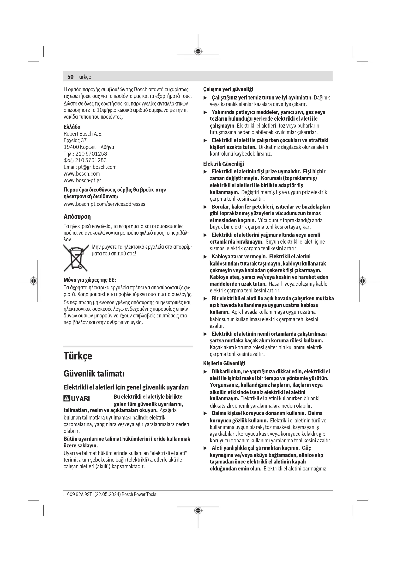 Μην ρίχνετε τα ηλεκτρικά εργαλεία στα απορρίμ- ματα του σπιτιού σας! Μόνο για χώρες τηςΕΕ: Τα άχρηστα ηλεκτρικά εργαλεία πρέπει να αποσύρονται ξεχω- ριστά. Χρησιμοποιείτε τα προβλεπόμενα συστήματα συλλογής. Σε περίπτωση μη ενδεδειγμένης απόσυρσης οι ηλεκτρικές και ηλεκτρονικές συσκευές λόγω ενδεχομένης παρουσίας επικίν- δυνων ουσιών μπορούν να έχουν επιβλαβείς επιπτώσεις στο περιβάλλον και στην ανθρώπινη υγεία. Türkçe Güvenlik talimatı Elektrikli el aletleri için genel güvenlik uyarıları UYARI Bu elektrikli el aletiyle birlikte gelen tüm güvenlik uyarılarını, talimatları, resim ve açıklamaları okuyun. Aşağıda bulunan talimatlara uyulmaması halinde elektrik çarpmalarına, yangınlara ve/veya ağır yaralanmalara neden olabilir. Bütün uyarıları ve talimat hükümlerini ileride kullanmak üzere saklayın. Uyarı ve talimat hükümlerinde kullanılan "elektrikli el aleti" terimi, akım şebekesine bağlı (elektrikli) aletlerle akü ile çalışan aletleri (akülü) kapsamaktadır. Çalışma yeri güvenliği u Çalıştığınız yeri temiz tutun ve iyi aydınlatın. Dağınık veya karanlık alanlar kazalara davetiye çıkarır. u Yakınında patlayıcı maddeler, yanıcı sıvı, gaz veya tozların bulunduğu yerlerde elektrikli el aleti ile çalışmayın. Elektrikli el aletleri, toz veya buharların tutuşmasına neden olabilecek kıvılcımlar çıkarırlar. u Elektrikli el aleti ile çalışırken çocukları ve etraftaki kişileri uzakta tutun. Dikkatiniz dağılacak olursa aletin kontrolünü kaybedebilirsiniz. Elektrik Güvenliği u Elektrikli el aletinin fişi prize uymalıdır. Fişi hiçbir zaman değiştirmeyin. Korumalı (topraklanmış) elektrikli el aletleri ile birlikte adaptör fiş kullanmayın. Değiştirilmemiş fiş ve uygun priz elektrik çarpma tehlikesini azaltır. u Borular, kalorifer petekleri, ısıtıcılar ve buzdolapları gibi topraklanmış yüzeylerle vücudunuzun temas etmesinden kaçının. Vücudunuz topraklandığı anda büyük bir elektrik çarpma tehlikesi ortaya çıkar. u Elektrikli el aletlerini yağmur altında veya nemli ortamlarda bırakmayın. Suyun elektrikli el aleti içine sızması elektrik çarpma tehlikesini artırır. u Kabloya zarar vermeyin. Elektrikli el aletini kablosundan tutarak taşımayın, kabloyu kullanarak çekmeyin veya kablodan çekerek fişi çıkarmayın. Kabloyu ateş, yanıcı ve/veya keskin ve hareket eden maddelerden uzak tutun. Hasarlı veya dolaşmış kablo elektrik çarpma tehlikesini artırır. u Bir elektrikli el aleti ile açık havada çalışırken mutlaka açık havada kullanılmaya uygun uzatma kablosu kullanın. Açık havada kullanılmaya uygun uzatma kablosunun kullanılması elektrik çarpma tehlikesini azaltır. u Elektrikli el aletinin nemli ortamlarda çalıştırılması şartsa mutlaka kaçak akım koruma rölesi kullanın. Kaçak akım koruma rölesi şalterinin kullanımı elektrik çarpma tehlikesini azaltır. Kişilerin Güvenliği u Dikkatli olun, ne yaptığınıza dikkat edin, elektrikli el aleti ile işinizi makul bir tempo ve yöntemle yürütün. Yorgunsanız, kullandığınız hapların, ilaçların veya alkolün etkisinde iseniz elektrikli el aletini kullanmayın. Elektrikli el aletini kullanırken bir anki dikkatsizlik önemli yaralanmalara neden olabilir. u Daima kişisel koruyucu donanım kullanın. Daima koruyucu gözlük kullanın. Elektrikli el aletinin türü ve kullanımına uygun olarak; toz maskesi, kaymayan iş ayakkabıları, koruyucu kask veya koruyucu kulaklık gibi koruyucu donanım kullanımı yaralanma tehlikesini azaltır. u Aleti yanlışlıkla çalıştırmaktan kaçının. Güç kaynağına ve/veya aküye bağlamadan, elinize alıp taşımadan önce elektrikli el aletinin kapalı olduğundan emin olun. Elektrikli el aletini parmağınız 1 609 92A 9ST | (22.05.2024) Bosch Power ToolsTürkçe | 51 şalter üzerinde dururken taşırsanız ve elektrikli el aleti açıkken fişi prize sokarsanız kazalara neden olabilirsiniz. u Elektrikli el aletini çalıştırmadan önce ayar aletlerini veya anahtarları aletten çıkarın. Elektrikli el aletinin dönen parçaları içinde bulunabilecek bir yardımcı alet yaralanmalara neden olabilir. u Çalışırken vücudunuz anormal durumda olmasın. Çalışırken duruşunuz güvenli olsun ve dengenizi her zaman koruyun. Bu sayede elektrikli el aletini beklenmedik durumlarda daha iyi kontrol edebilirsiniz. u Uygun iş elbiseleri giyin. Geniş giysiler giymeyin ve takı takmayın. Saçlarınızı ve giysileriniz aletin hareketli parçalarından uzak tutun. Bol giysiler, uzun saçlar veya takılar aletin hareketli parçaları tarafından tutulabilir. u Toz emme donanımı veya toz tutma tertibatı kullanırken, bunların bağlı olduğundan ve doğru kullanıldığından emin olun. Toz emme donanımının kullanımı tozdan kaynalanabilecek tehlikeleri azaltır. u Aletleri sık kullanmanız sebebiyle onlara alışmış olmanız, güvenlik prensiplerine uymanızı önlememelidir. Dikkatsiz bir hareket, bir anda ciddi yaralanmalara yol açabilir. Elektrikli el aletlerinin kullanımı ve bakımı u Elektrikli el aletini aşırı ölçüde zorlamayın. Yaptığınız işe uygun elektrikli el aletleri kullanın. Uygun performanslı elektrikli el aleti ile, belirlenen çalışma alanında daha iyi ve güvenli çalışırsınız. u Şalteri bozuk olan elektrikli el aletini kullanmayın. Açılıp kapanamayan bir elektrikli el aleti tehlikelidir ve onarılmalıdır. u Elektrikli el aletinde bir ayarlama işlemine başlamadan, herhangi bir aksesuarı değiştirirken veya