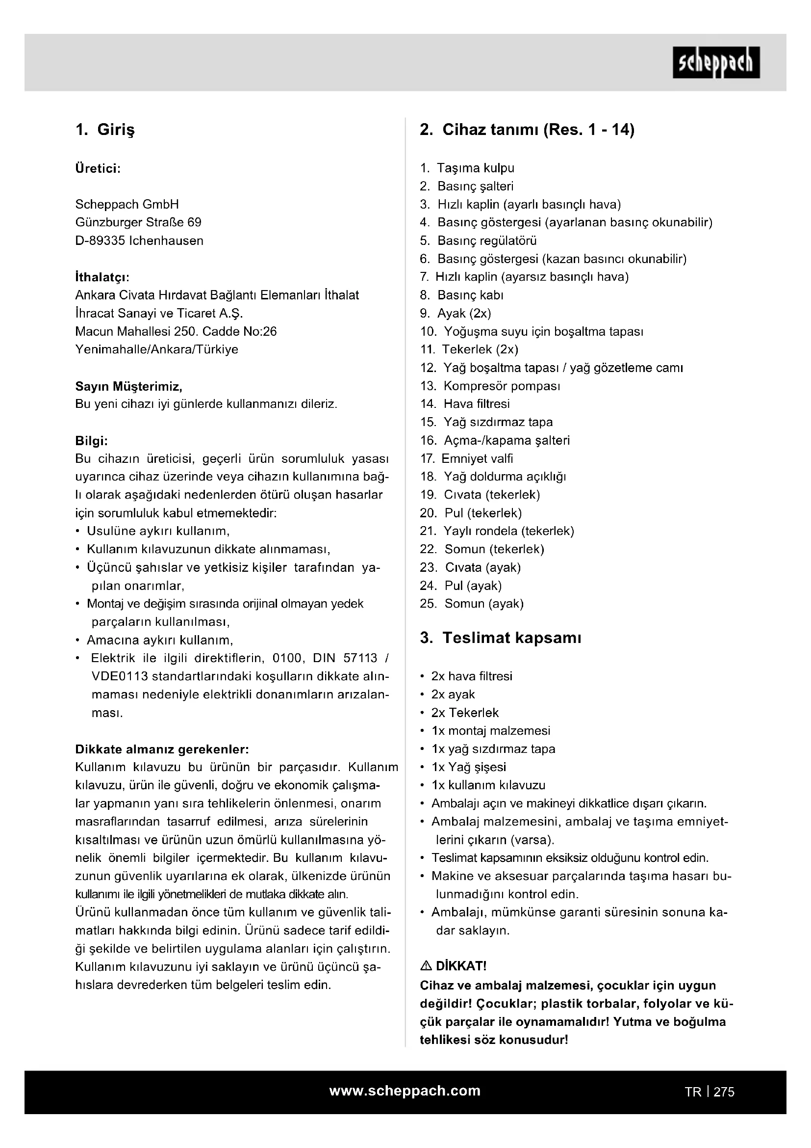 Üretici: Scheppach GmbH Günzburger Straße 69 D-89335 Ichenhausen İthalatçı: Ankara Civata Hırdavat Bağlantı Elemanları İthalat İhracat Sanayi ve Ticaret A.Ş. Macun Mahallesi 250. Cadde No:26 Yenimahalle/Ankara/Türkiye Sayın Müşterimiz, Bu yeni cihazı iyi günlerde kullanmanızı dileriz. Bilgi: Bu cihazın üreticisi, geçerli ürün sorumluluk yasası uyarınca cihaz üzerinde veya cihazın kullanımına bağ- lı olarak aşağıdaki nedenlerden ötürü oluşan hasarlar için sorumluluk kabul etmemektedir: