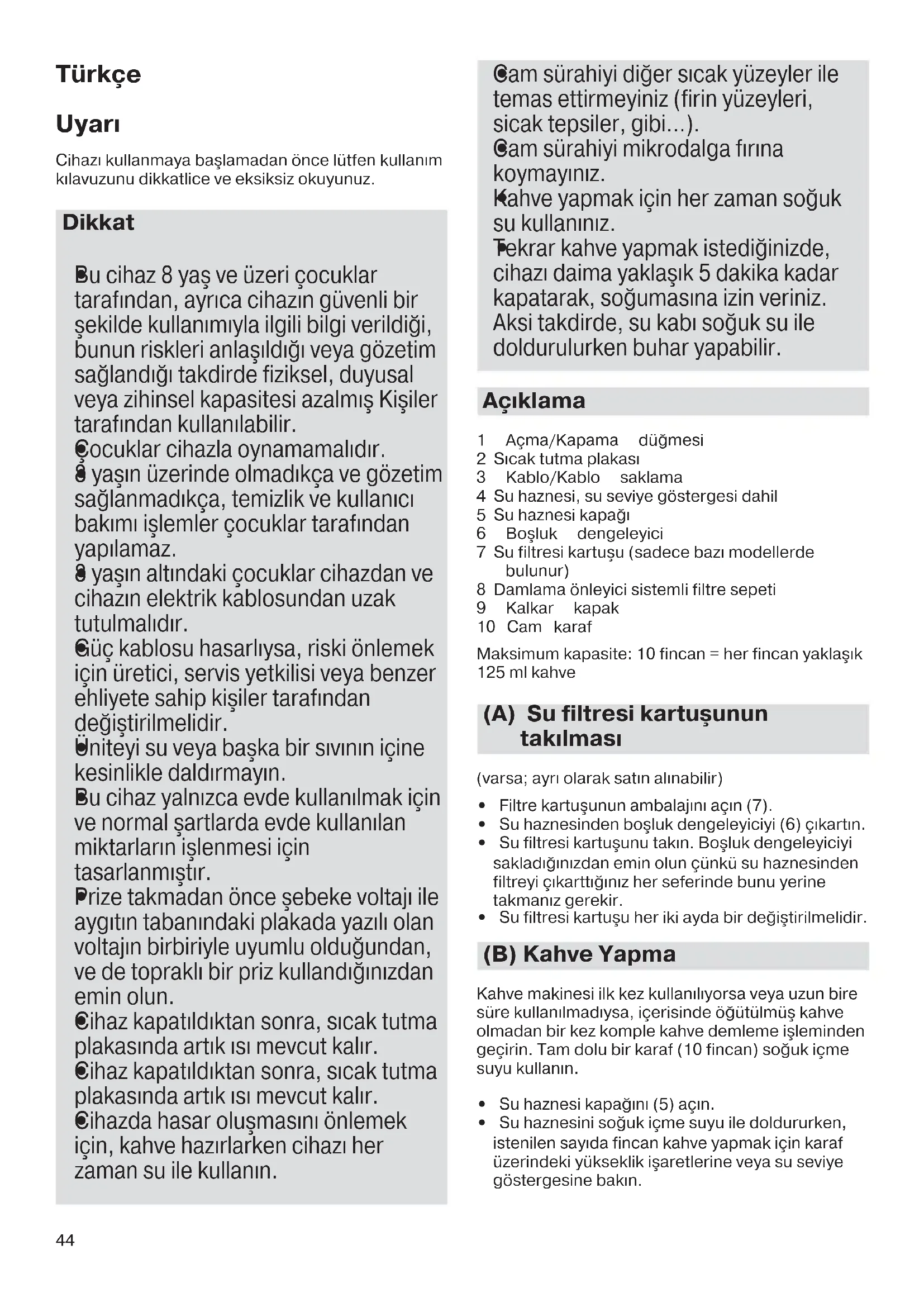Tekrar kahve yapmak istediğinizde, cihazı daima yaklaşık 5 dakika kadar kapatarak, soğumasına izin veriniz. Aksi takdirde, su kabı soğuk su ile doldurulurken buhar yapabilir. Açıklama 1 Açma/Kapama düğmesi 2 Sıcak tutma plakası 3 Kablo/Kablo saklama 4 Su haznesi, su seviye göstergesi dahil 5 Su haznesi kapağı 6 Boşluk dengeleyici 7 Su filtresi kartuşu (sadece bazı modellerde bulunur) 8 Damlama önleyici sistemli filtre sepeti 9 Kalkar kapak 10 Cam karaf Maksimum kapasite: 10 fincan = her fincan yaklaşık 125 ml kahve (A) Su filtresi kartuşunun takılması (varsa; ayrı olarak satın alınabilir)