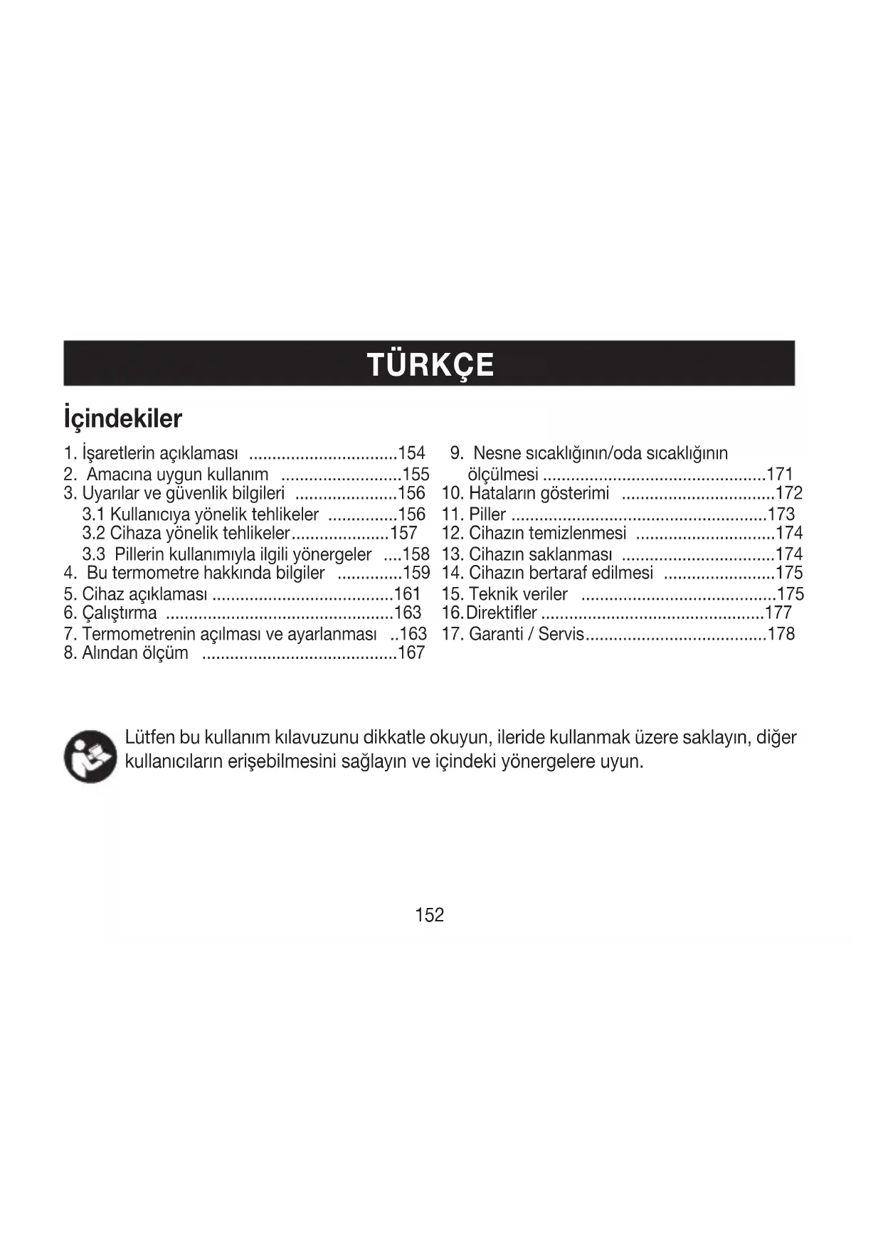 Bu termometre, alından temassız ateş ölçümü için tasarlanmıştır. Bu termometre ile ayrıca nesne ve oda sıcaklığı da ölçülebilir. Bu termometre evde ölçüm yapılması için uygundur. Bu- nunla vücut sıcaklığınızı hızlı ve basit biçimde ölçebilirsiniz. Değerler otomatik olarak kaydedilir.156