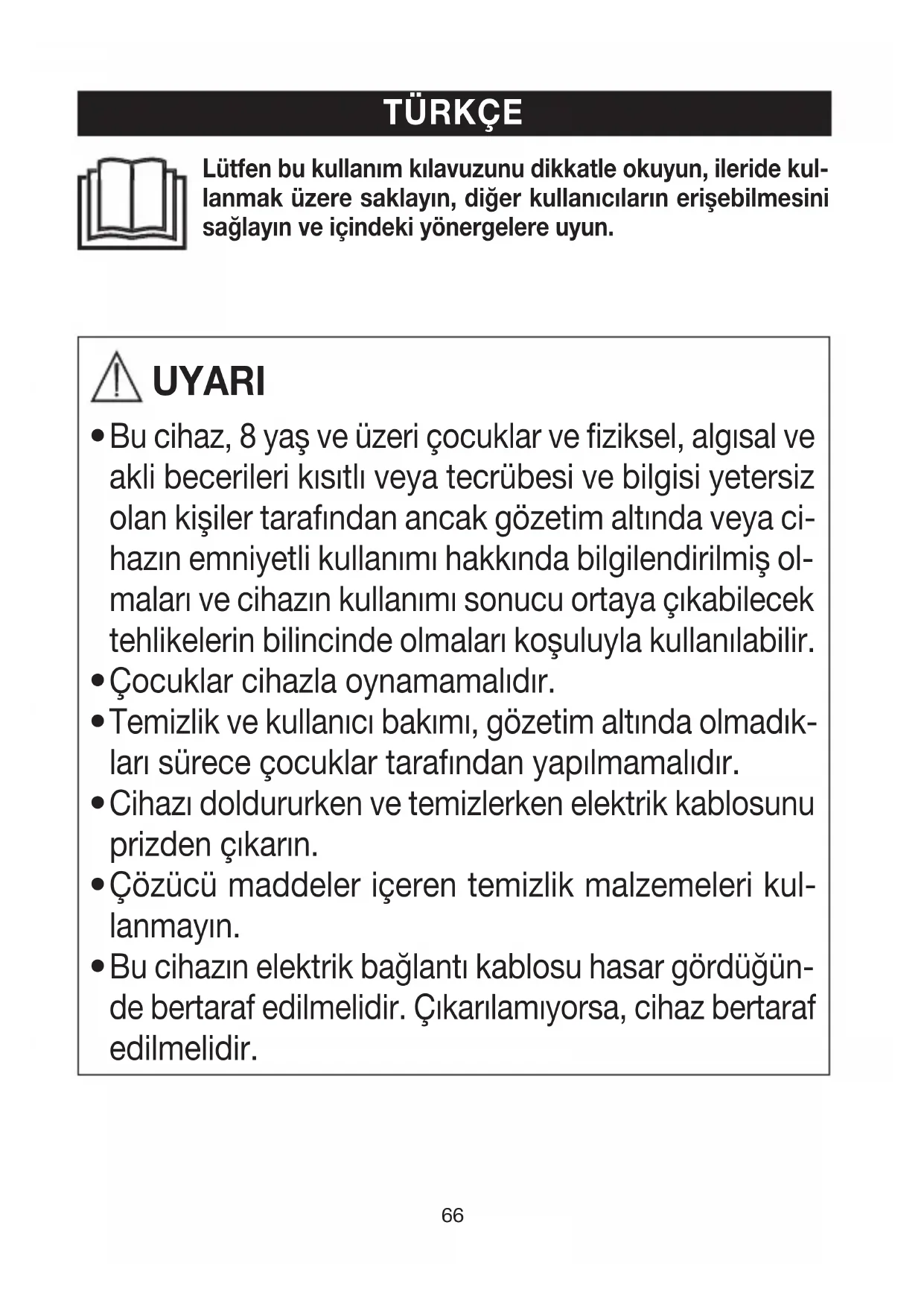 Bu cihaz, 8 yaş ve üzeri çocuklar ve fiziksel, algısal ve akli becerileri kısıtlı veya tecrübesi ve bilgisi yetersiz olan kişiler tarafından ancak gözetim altında veya ci- hazın emniyetli kullanımı hakkında bilgilendirilmiş ol- maları ve cihazın kullanımı sonucu ortaya çıkabilecek tehlikelerin bilincinde olmaları koşuluyla kullanılabilir