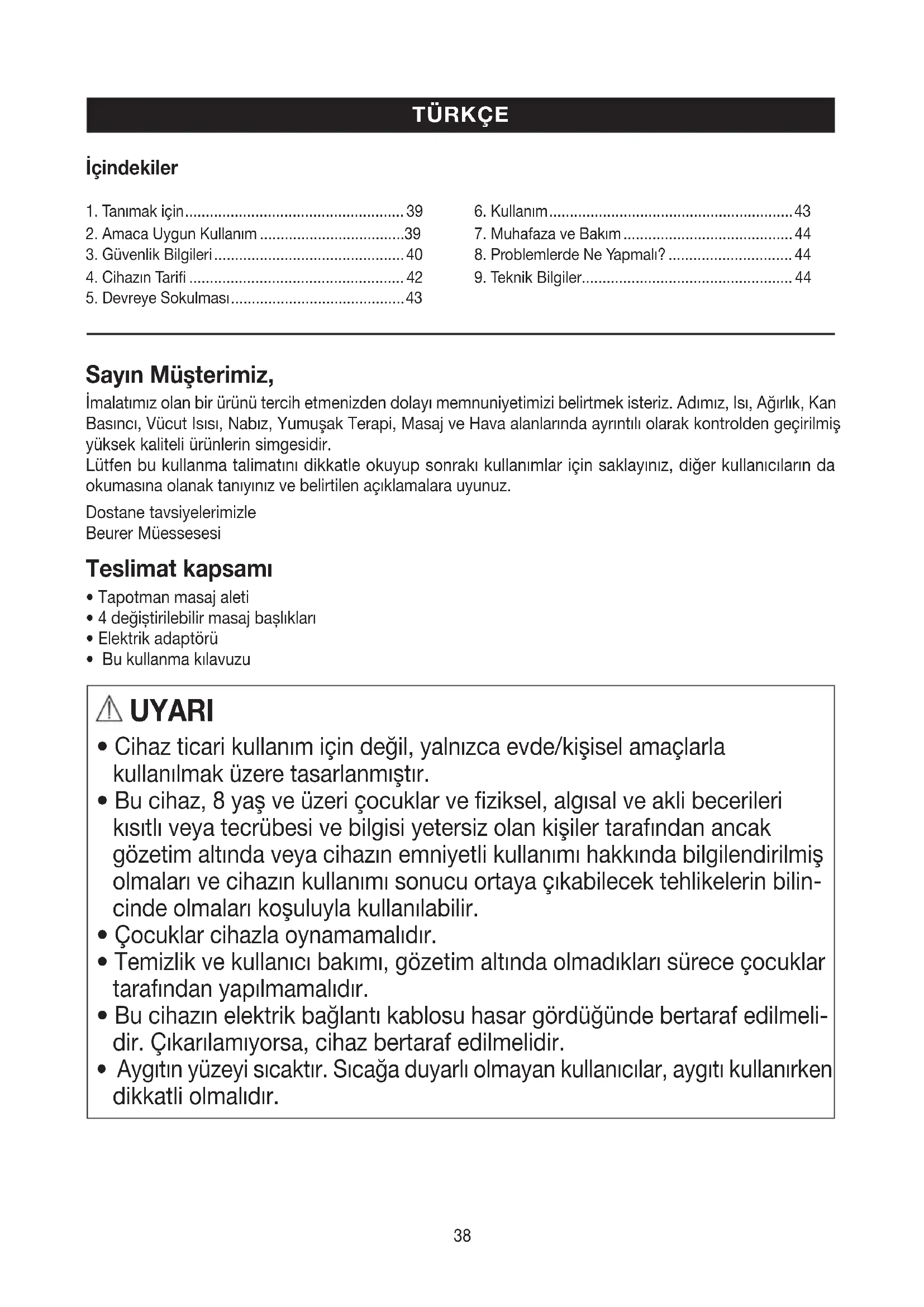 Sayın Müşterimiz, İmalatımız olan bir ürünü tercih etmenizden dolayı memnuniyetimizi belirtmek isteriz. Adımız, Isı, Ağırlık, Kan Basıncı, Vücut Isısı, Nabız, Yumuşak Terapi, Masaj ve Hava alanlarında ayrıntılı olarak kontrolden geçirilmiş yüksek kaliteli ürünlerin simgesidir. Lütfen bu kullanma talimatını dikkatle okuyup sonrakı kullanımlar için saklayınız, diğer kullanıcıların da okumasına olanak tanıyınız ve belirtilen açıklamalara uyunuz.Dostane tavsiyelerimizleBeurer Müessesesi Teslimat kapsamı
