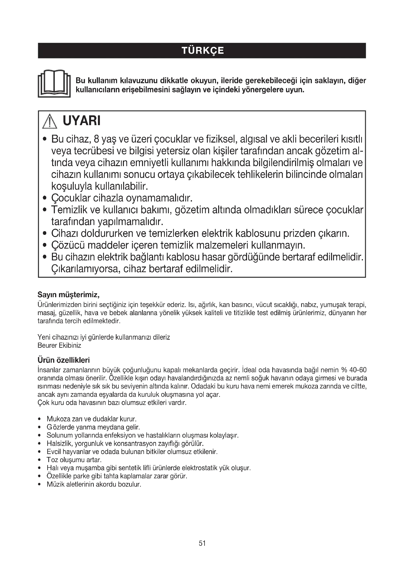 Bu cihazın elektrik bağlantı kablosu hasar gördüğünde bertaraf edilmelidir. Çıkarılamıyorsa, cihaz bertaraf edilmelidir. Sayın müşterimiz, Ürünlerimizden birini seçtiğiniz için teşekkür ederiz. Isı, ağırlık, kan basıncı, vücut sıcaklığı, nabız, yumuşak terapi, masaj, güzellik, hava ve bebek alanlarına yönelik yüksek kaliteli ve titizlikle test edilmiş ürünlerimiz, dünyanın her tarafında tercih edilmektedir. Yeni cihazınızı iyi günlerde kullanmanızı dileriz Beurer Ekibiniz Ürün özellikleri İnsanlar zamanlarının büyük çoğunluğunu kapalı mekanlarda geçirir. İdeal oda havasında bağıl nemin %40-60 oranında olması önerilir. Özellikle kışın odayı havalandırdığınızda az nemli soğuk havanın odaya girmesi ve burada ısınması nedeniyle sık sık bu seviyenin altında kalınır. Odadaki bu kuru hava nemi emerek mukoza zarında ve ciltte, ancak aynı zamanda eşyalarda da kuruluk oluşmasına yol açar. Çok kuru oda havasının bazı olumsuz etkileri vardır.