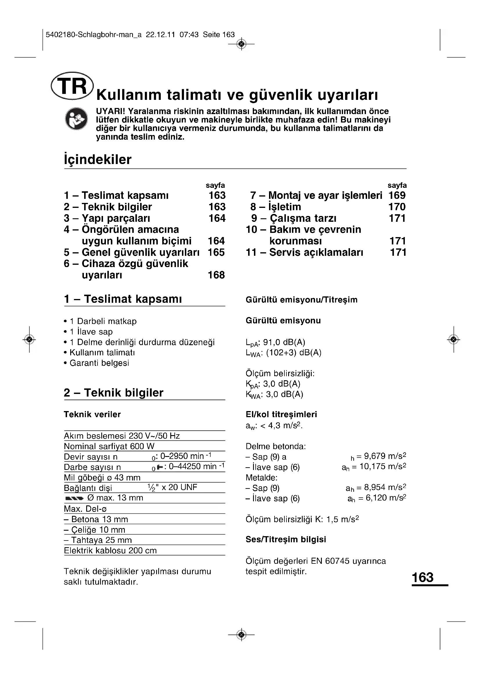 | 1 – Teslimat kapsamı | sayfa 163 |