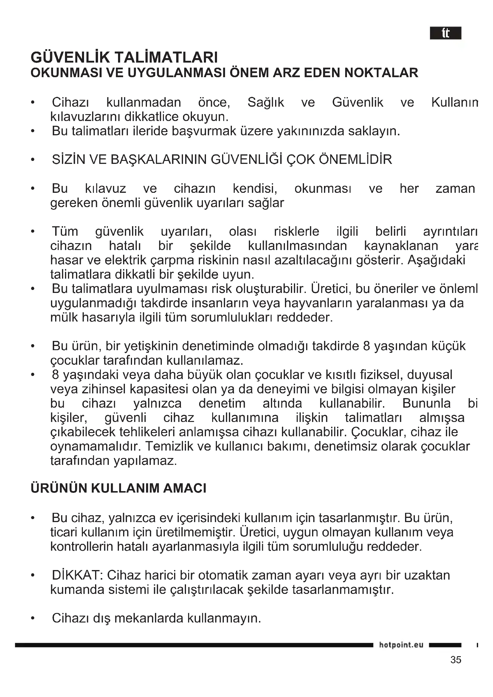 - Bucihaz,yalnızcaeviçerisindekikullanımiçintasarlanmıştır.Buürün, ticarikullanımiçinüretilmemiştir.Üretici,uygunolmayankullanımveya kontrollerinhatalıayarlanmasıylailgilitümsorumluluğureddeder.