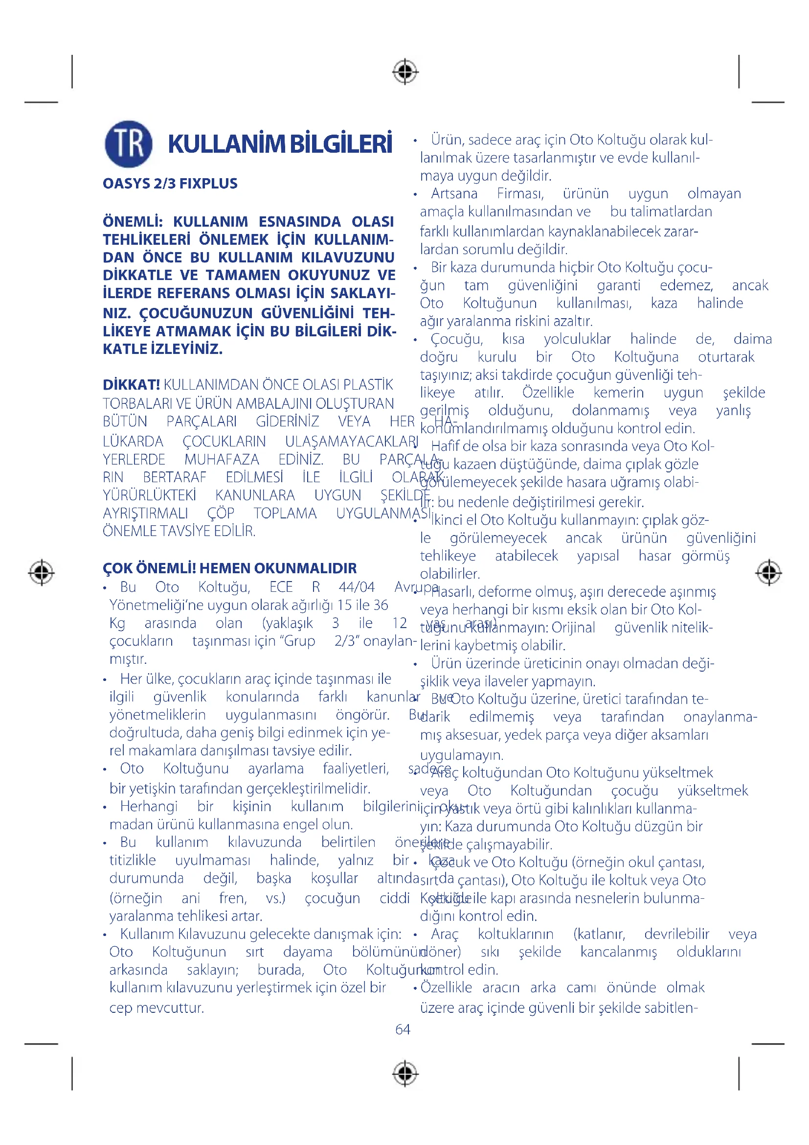 - Aracın güneş altında kalmış olması halinde, çocuğu Oto Koltuğuna bindirmeden önce muhtelifkısımlarınaşırıısınmamışolduklarını kontroledin: budurumda,yanıklarıönlemek için,çocuğuoturtmadan önceOtoKoltuğu- nunparçalarınınsoğumasınıbekleyin. ÖNEMLİ UYARI 1.Bu tertibat, iki farklı montaj tipi için, ECE R44/04sayılıAvrupaBirliğiYönetmeliğiuya- rıncaonaylanmışbirçocuktutmatertibatıdır: -FixPlus (P) sert bağlantıları aracın üç noktalı güvenlikkemerleriilekullanıldıklarındatertibat “Yarı Evrenseldir” ve sadece özel“Araç Listesi” bağlamındabelirtilenaraçlarileuyumludur; -OtoKoltuğuaracınüçnoktalıgüvenlikkemer- leriilesertFixPlusbağlantılarıolmadankulla- nıldığındatertibat“Evrenseldir”. 2.Sadece,UN/ECEN°16sayılıYönetmeliğeveya eşitdüzeydekidiğerstandartlaragöreonay- lanmış3noktalı,statik veya sarıcılıgüvenlik kemerleri ile donatılmış araçlarda kullanıma uygundur. 3.Tereddütdurumunda,tutmatertibatınınüre- ticisiveyayetkilisatıcısıileiletişimkurun. ÜRÜN VE ARAÇ KOLTUĞUNA İLİŞKİN KISIT-