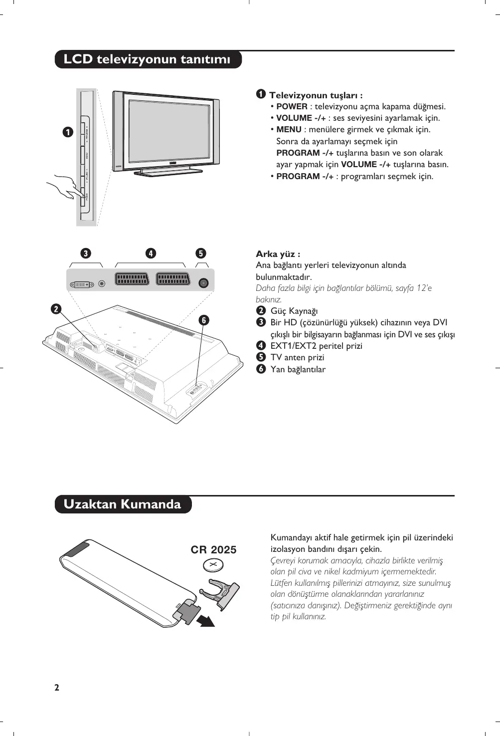Les raccordements principaux s’effectuent par le dessous du téléviseur. Pour plus de détails sur les raccordements, voir page 12. é Alimentation “ Prise DVI et entrée audio pour le raccordement d’un appareil HD (Haute Définition) ou d’un ordinateur avec sortie DVI ‘ Prises péritel EXT 1 et EXT 2 ( Prise d’antenne TV Les touches de la télécommande 1)