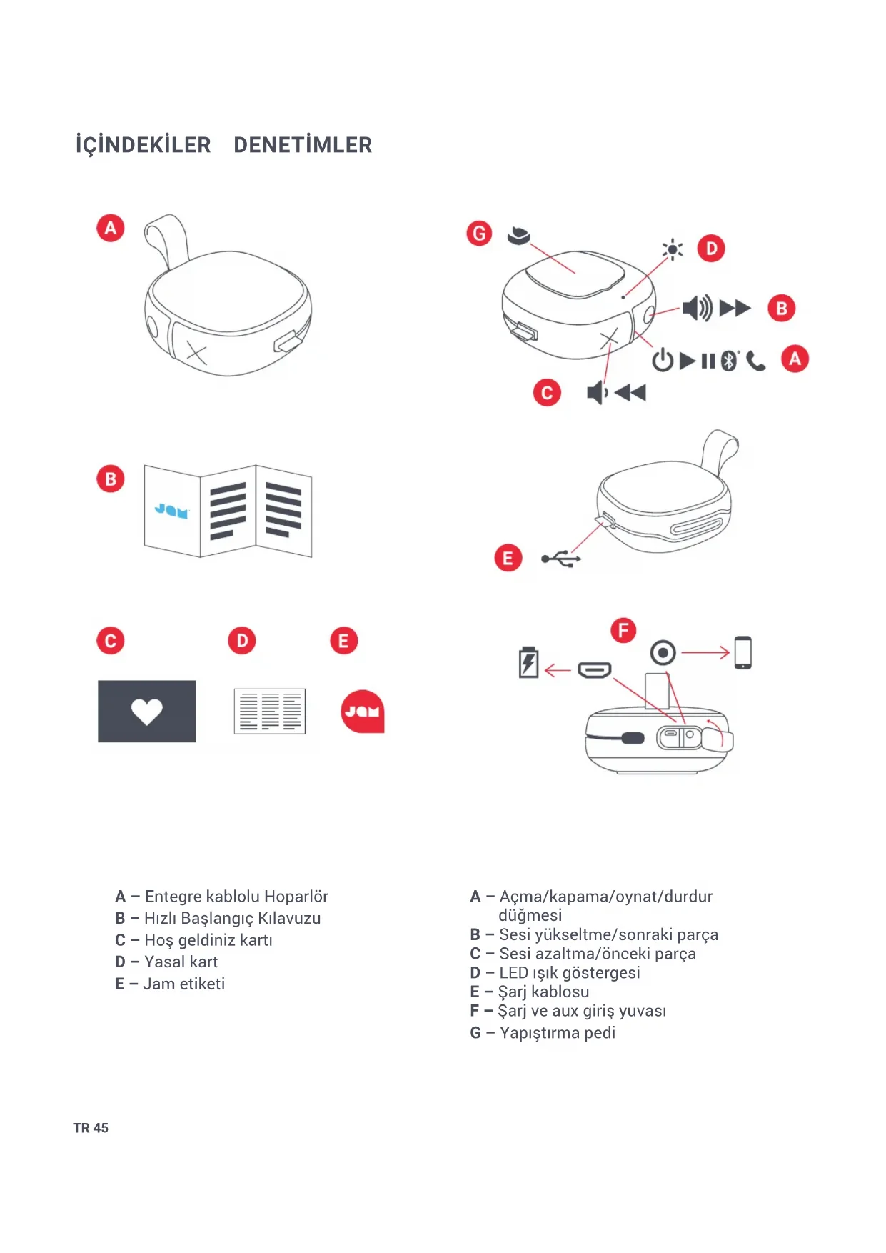 A – Entegre kablolu Hoparlör B – Hızlı Başlangıç Kılavuzu C – Hoş geldiniz kartı D – Yasal kart E – Jam etiketi A – Açma/kapama/oynat/durdur düğmesi B – Sesi yükseltme/sonraki parça C – Sesi azaltma/önceki parça D – LED ışık göstergesi E – Şarj kablosu F – Şarj ve aux giriş yuvası G – Yapıştırma pediTR 46 KURULUM