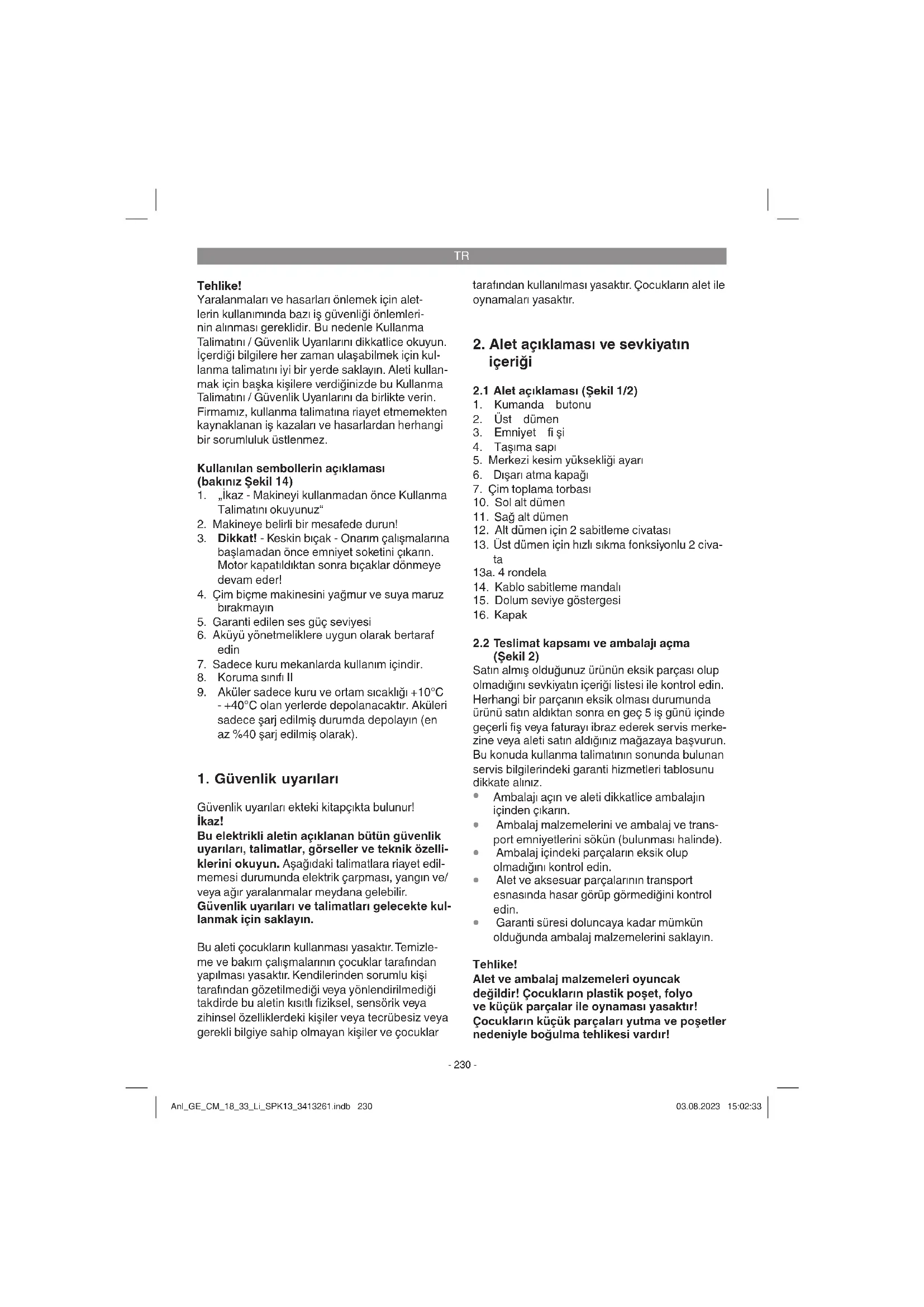 Garanti süresi doluncaya kadar mümkün olduğunda ambalaj malzemelerini saklayın. Tehlike! Alet ve ambalaj malzemeleri oyuncak değildir! Çocukların plastik poşet, folyo ve küçük parçalar ile oynaması yasaktır! Çocukların küçük parçaları yutma ve poşetler nedeniyle boğulma tehlikesi vardır! Anl_GE_CM_18_33_Li_SPK13_3413261.indb 230Anl_GE_CM_18_33_Li_SPK13_3413261.indb 230 03.08.2023 15:02:3303.08.2023 15:02:33TR
