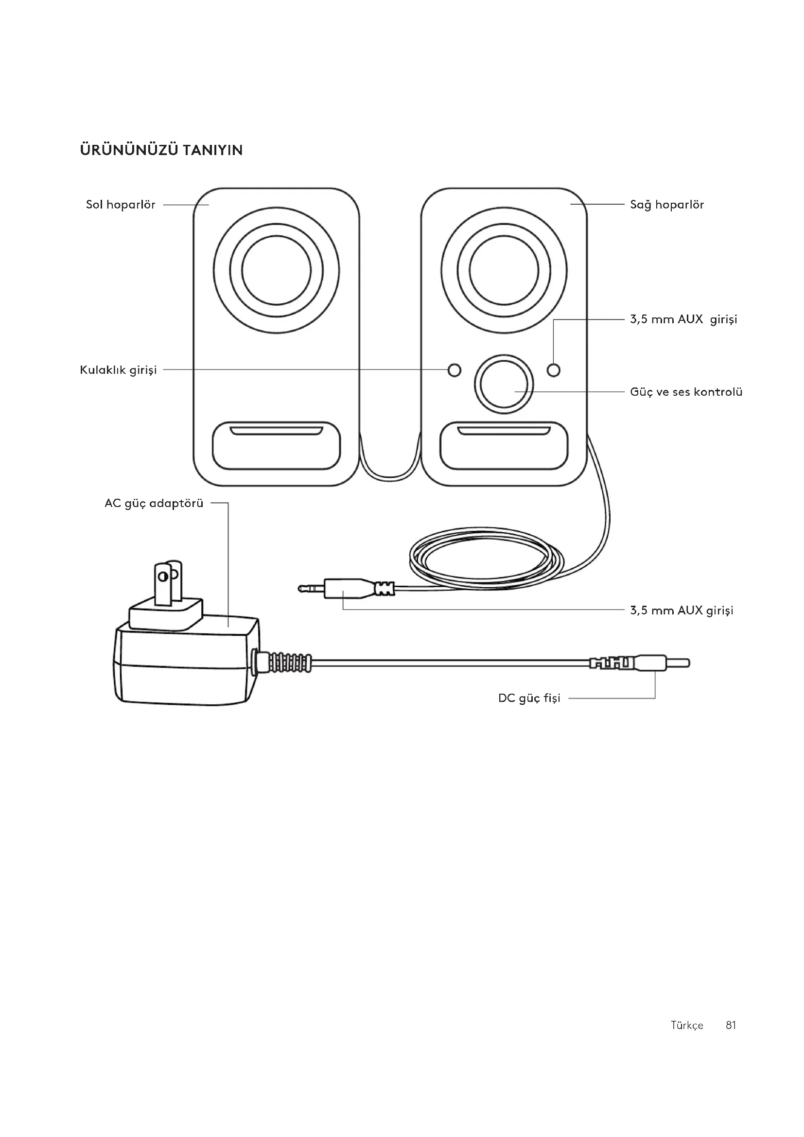 Sol hoparlör Kulaklık girişi DC güç fişi Sağ hoparlör Güç ve seskontrolü 3,5mm AUX girişi 3,5mm AUX girişi AC güç adaptörüTürkçe 82