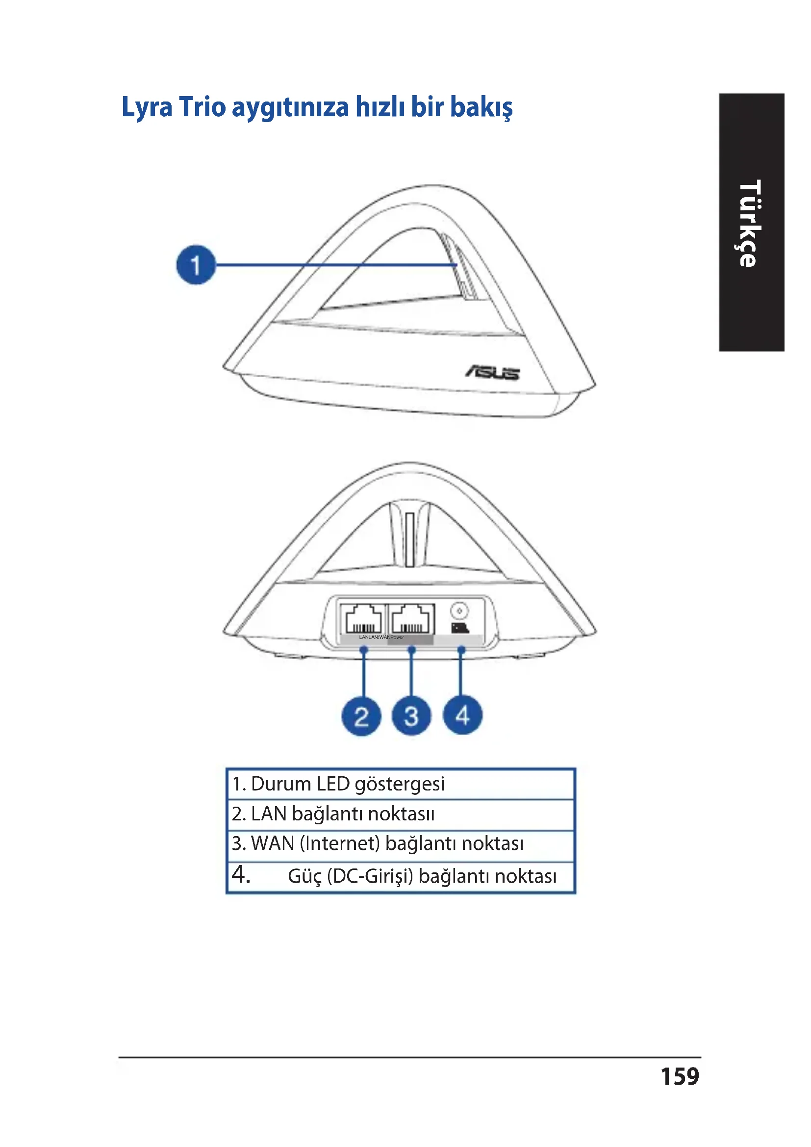 Güç adaptörünü Lyra Trio aygıtına takın ve Lyra Trio aygıtınızın kuruluma hazır olduğundan emin olmak için LED’ler sabit beyaz renkte yanana kadar bekleyin. LAN Birincil Lyra Trio161 Türkçe Lyra Trio WiFi sisteminizi kurun ASUS Lyra uygulamasını mobil aygıtınızda başlatın ve kısa bir süre yönergeleri izleyin.