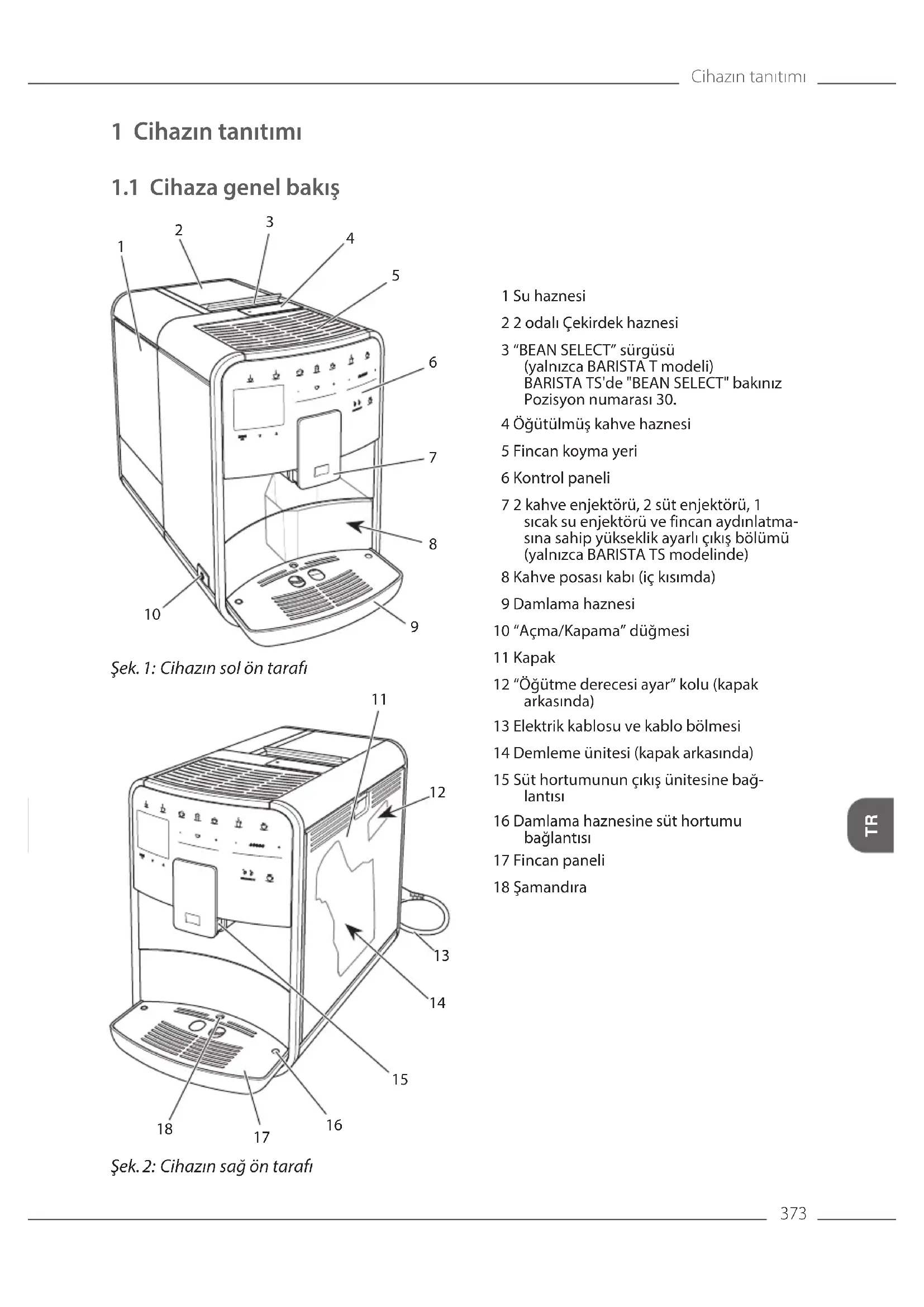 Şek. 2: Cihazın sağ ön tarafı 1 Su haznesi 2 2 odalı Çekirdek haznesi 3 “BEAN SELECT” sürgüsü (yalnızca BARISTAT modeli) BARISTA TS'de "BEAN SELECT" bakınız Pozisyon numarası 30. 4 Öğütülmüş kahve haznesi 5 Fincan koyma yeri 6 Kontrol paneli 7 2 kahve enjektörü, 2 süt enjektörü, 1 sıcak su enjektörü ve fincan aydınlatma- sına sahip yükseklik ayarlı çıkış bölümü (yalnızca BARISTATS modelinde) 8 Kahve posası kabı (iç kısımda) 9 Damlama haznesi 10 “Açma/Kapama” düğmesi 11 Kapak 12 “Öğütme derecesi ayar” kolu (kapak arkasında) 13 Elektrik kablosu ve kablo bölmesi 14 Demleme ünitesi (kapak arkasında) 15 Süt hortumunun çıkış ünitesine bağ- lantısı 16 Damlama haznesine süt hortumu bağlantısı 17 Fincan paneli 18 ŞamandıraCihazın tanıtımı