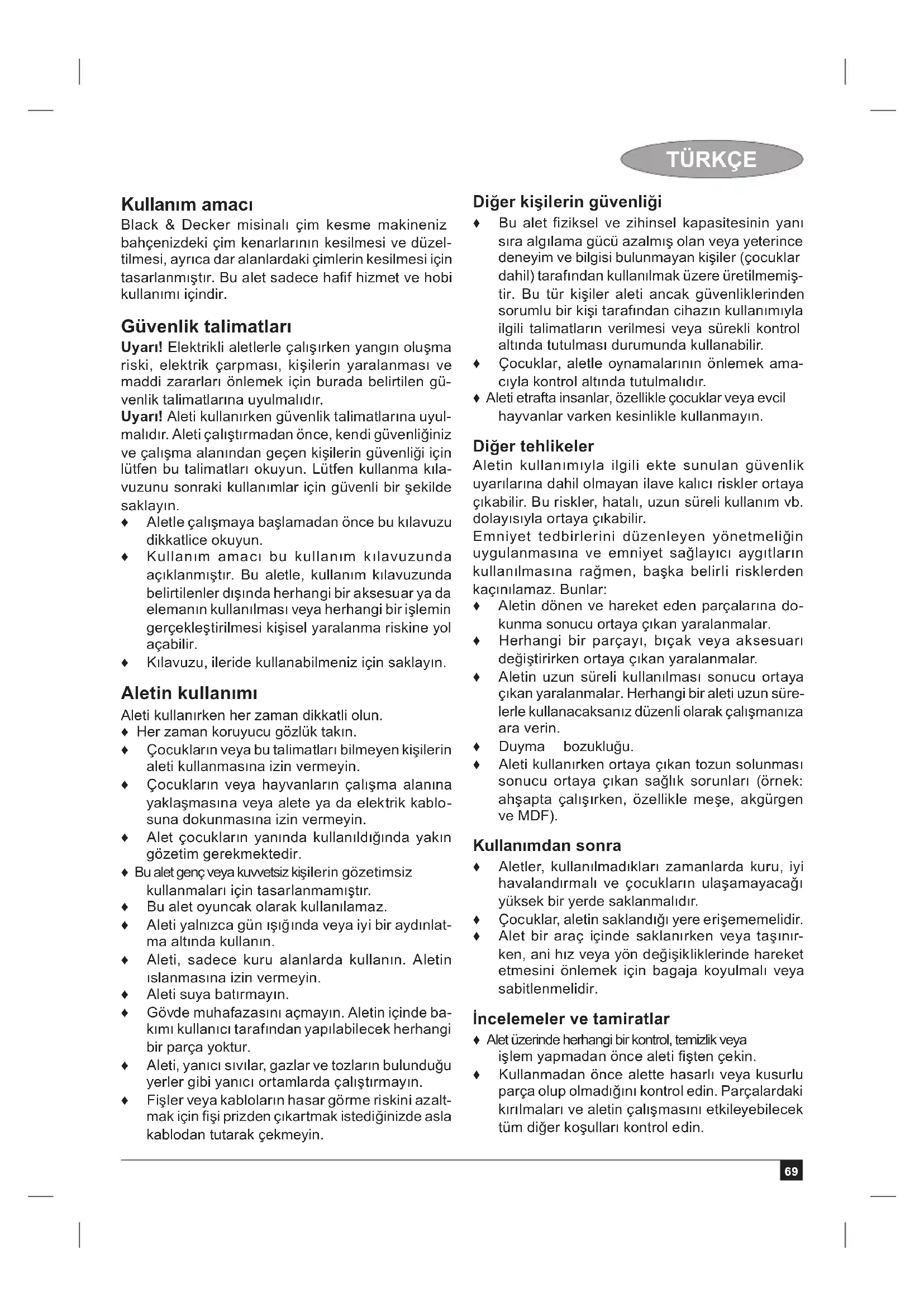 Kullanım amacı Black & Decker misinalı çim kesme makineniz bahçenizdeki çim kenarlarının kesilmesi ve düzel- tilmesi, ayrıca dar alanlardaki çimlerin kesilmesi için tasarlanmıştır. Bu alet sadece hafi f hizmet ve hobi kullanımı içindir. Güvenlik talimatları Uyarı! Elektrikli aletlerle çalışırken yangın oluşma riski, elektrik çarpması, kişilerin yaralanması ve maddi zararları önlemek için burada belirtilen gü- venlik talimatlarına uyulmalıdır. Uyarı! Aleti kullanırken güvenlik talimatlarına uyul- malıdır. Aleti çalıştı rmadan önce, kendi güvenliğiniz ve çalışma alanından geçen kişilerin güvenliği için lütfen bu talimatları okuyun. Lütfen kullanma kıla- vuzunu sonraki kullanımlar için güvenli bir şekilde saklayın. ♦ Aletle çalışmaya başlamadan önce bu kılavuzu dikkatlice okuyun. ♦ Kullanım amacı bu kullanım kılavuzunda açıklanmıştır. Bu aletle, kullanım kılavuzunda belirtilenler dışında herhangi bir aksesuar ya da elemanın kullanılması veya herhangi bir işlemin gerçekleştirilmesi kişisel yaralanma riskine yol açabilir. ♦ Kılavuzu, ileride kullanabilmeniz için saklayın. Aletin kullanımı Aleti kullanırken her zaman dikkatli olun. ♦ Her zaman koruyucu gözlük takın. ♦ Çocukların veya bu talimatları bilmeyen kişilerin aleti kullanmasına izin vermeyin. ♦ Çocukların veya hayvanların çalışma alanına yaklaşmasına veya alete ya da elektrik kablo- suna dokunmasına izin vermeyin. ♦ Alet çocukların yanında kullanıldığında yakın gözetim gerekmektedir. ♦ Bu alet genç veya kuvvetsiz kişilerin gözetimsiz kullanmaları için tasarlanmamıştır. ♦ Bu alet oyuncak olarak kullanılamaz. ♦ Aleti yalnızca gün ışığında veya iyi bir aydınlat- ma altında kullanın. ♦ Aleti, sadece kuru alanlarda kullanın. Aletin ıslanmasına izin vermeyin. ♦ Aleti suya batırmayın. ♦ Gövde muhafazasını açmayın. Aletin içinde ba- kımı kullanıcı tarafından yapılabilecek herhangi bir parça yoktur. ♦ Aleti, yanıcı sıvılar, gazlar ve tozların bulunduğu yerler gibi yanıcı ortamlarda çalıştırmayın. ♦ Fişler veya kabloların hasar görme riskini azalt- mak için fi şi prizden çıkartmak istediğinizde asla kablodan tutarak çekmeyin. Diğer kişilerin güvenliği ♦ Bu alet fi ziksel ve zihinsel kapasitesinin yanı sıra algılama gücü azalmış olan veya yeterince deneyim ve bilgisi bulunmayan kişiler (çocuklar dahil) tarafından kullanılmak üzere üretilmemiş- tir. Bu tür kişiler aleti ancak güvenliklerinden sorumlu bir kişi tarafından cihazın kullanımıyla ilgili talimatların verilmesi veya sürekli kontrol altında tutulması durumunda kullanabilir. ♦ Çocuklar, aletle oynamalarının önlemek ama- cıyla kontrol altında tutulmalıdır. ♦ Aleti etrafta insanlar, özellikle çocuklar veya evcil hayvanlar varken kesinlikle kullanmayın. Diğer tehlikeler Aletin kullanımıyla ilgili ekte sunulan güvenlik uyarılarına dahil olmayan ilave kalıcı riskler ortaya çıkabilir. Bu riskler, hatalı, uzun süreli kullanım vb. dolayısıyla ortaya çıkabilir. Emniyet tedbirlerini düzenleyen yönetmeliğin uygulanmasına ve emniyet sağlayıcı aygıtların kullanılmasına rağmen, başka belirli risklerden kaçınılamaz. Bunlar: ♦ Aletin dönen ve hareket eden parçalarına do- kunma sonucu ortaya çıkan yaralanmalar. ♦ Herhangi bir parçayı, bıçak veya aksesuarı değiştirirken ortaya çıkan yaralanmalar. ♦ Aletin uzun süreli kullanılması sonucu ortaya çıkan yaralanmalar. Herhangi bir aleti uzun süre- lerle kullanacaksanız düzenli olarak çalışmanıza ara verin. ♦ Duyma bozukluğu. ♦ Aleti kullanırken ortaya çıkan tozun solunması sonucu ortaya çıkan sağlık sorunları (örnek: ahşapta çalışırken, özellikle meşe, akgürgen ve MDF). Kullanımdan sonra ♦ Aletler, kullanılmadıkları zamanlarda kuru, iyi havalandırmalı ve çocukların ulaşamayacağı yüksek bir yerde saklanmalıdır. ♦ Çocuklar, aletin saklandığı yere erişememelidir. ♦ Alet bir araç içinde saklanırken veya taşınır- ken, ani hız veya yön değişikliklerinde hareket etmesini önlemek için bagaja koyulmalı veya sabitlenmelidir. İncelemeler ve tamiratlar ♦ Alet üzerinde herhangi bir kontrol, temizlik veya işlem yapmadan önce aleti fi şten çekin. ♦ Kullanmadan önce alette hasarlı veya kusurlu parça olup olmadığını kontrol edin. Parçalardaki kırılmaları ve aletin çalışmasını etkileyebilecek tüm diğer koşulları kontrol edin.70