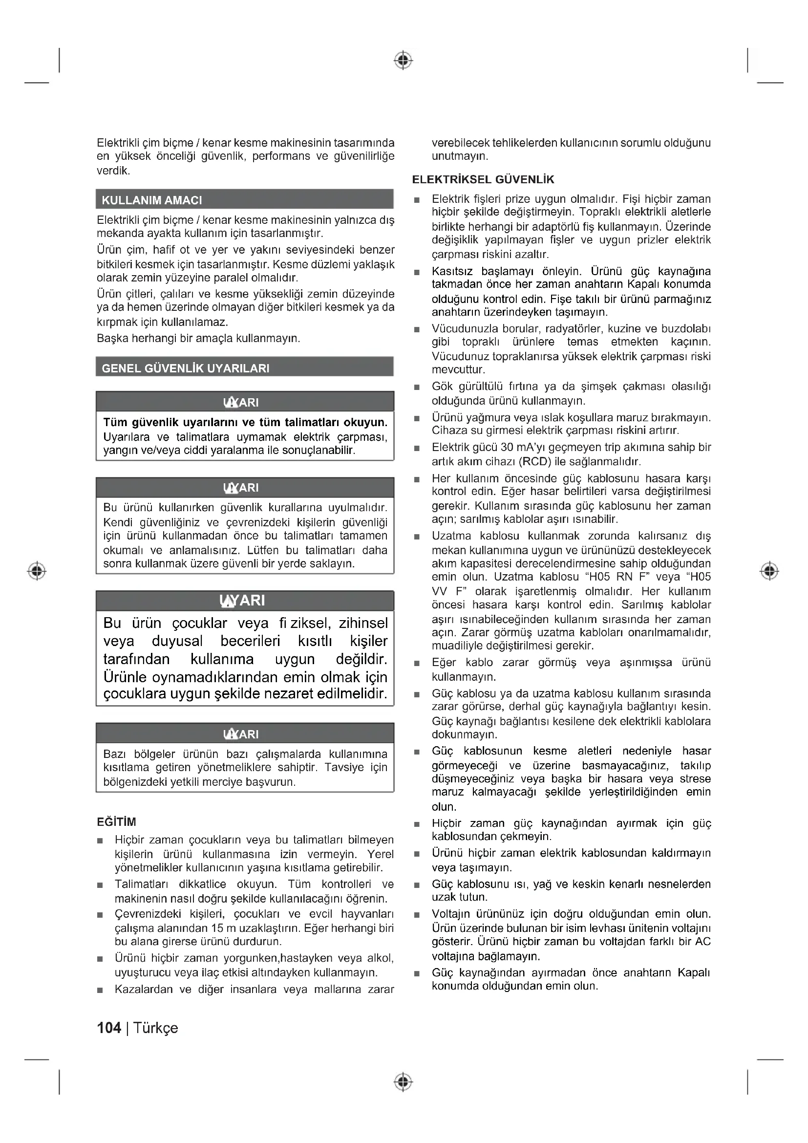 Попередження104 | Türkçe Elektrikli çim biçme / kenar kesme makinesinin tasarımında en yüksek önceliği güvenlik, performans ve güvenilirliğe verdik. KULLANIM AMACI Elektrikli çim biçme / kenar kesme makinesinin yalnızca dış mekanda ayakta kullanım için tasarlanmıştır. Ürün çim, hafi f ot ve yer ve yakını seviyesindeki benzer bitkileri kesmek için tasarlanmıştır. Kesme düzlemi yaklaşık olarak zemin yüzeyine paralel olmalıdır. Ürün çitleri, çalıları ve kesme yüksekliği zemin düzeyinde ya da hemen üzerinde olmayan diğer bitkileri kesmek ya da kırpmak için kullanılamaz. Başka herhangi bir amaçla kullanmayın.