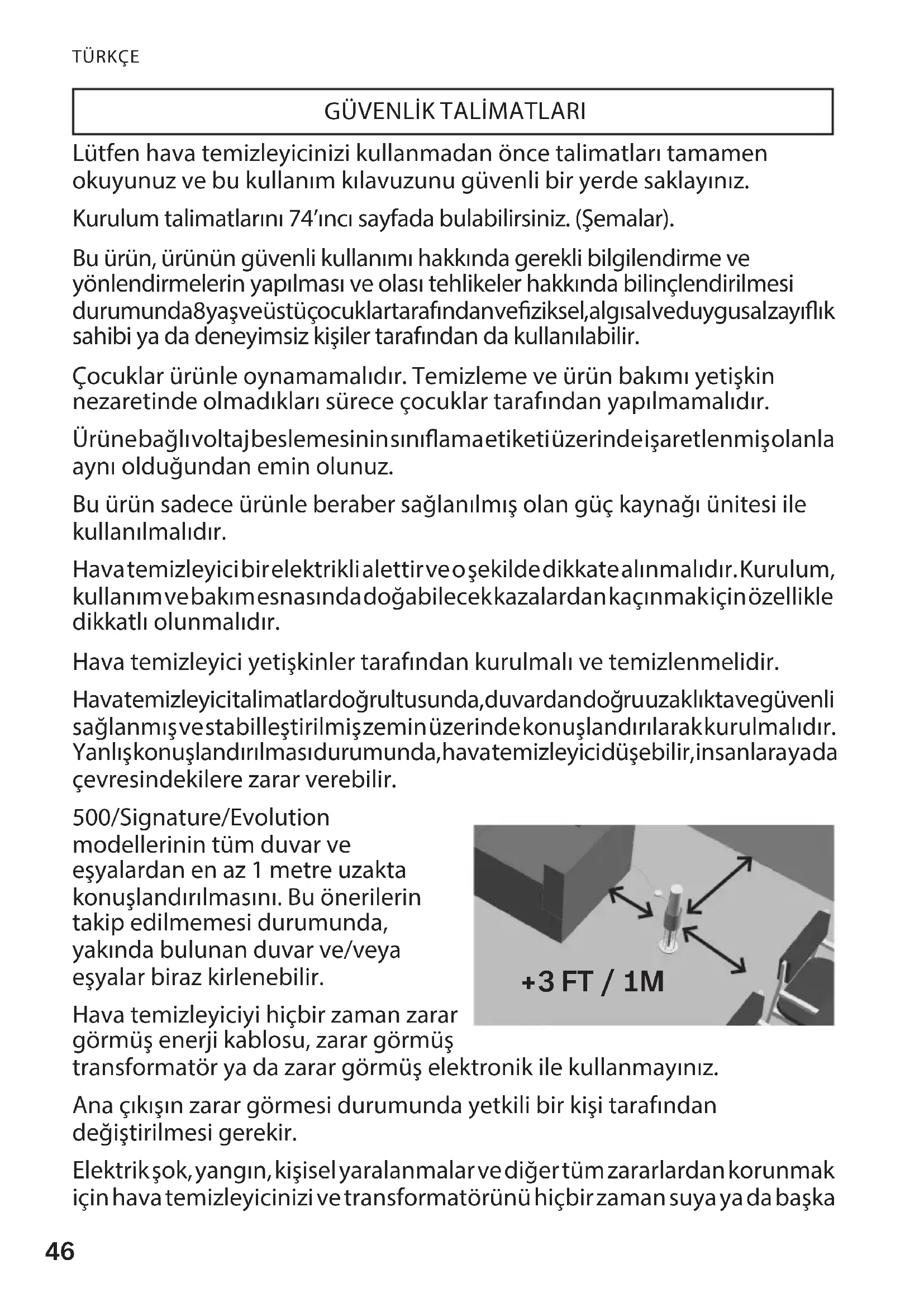 Lütfen hava temizleyicinizi kullanmadan önce talimatları tamamen okuyunuz ve bu kullanım kılavuzunu güvenli bir yerde saklayınız. Kurulum talimatlarını 74’ıncı sayfada bulabilirsiniz. (Şemalar). Bu ürün, ürünün güvenli kullanımı hakkında gerekli bilgilendirme ve yönlendirmelerin yapılması ve olası tehlikeler hakkında bilinçlendirilmesi durumunda 8 yaş ve üstü çocuk lar tarafından ve ziksel, algısal ve duygusal zayıık sahibi ya da deneyimsiz kişiler tarafından da kullanılabilir. Çocuklar ürünle oynamamalıdır. Temizleme ve ürün bakımı yetişkin nezaretinde olmadıkları sürece çocuklar tarafından yapılmamalıdır. Ürüne bağlı voltaj beslemesinin sınıama etiketi üzerinde işaretlenmiş olanla aynı olduğundan emin olunuz. Bu ürün sadece ürünle beraber sağlanılmış olan güç kaynağı ünitesi ile kullanılmalıdır. Hava temizleyici bir elektrikli alettir ve o şekilde dikkate alınmalıdır. Kurulum, kullanım ve bakım esnasında doğabilecek kazalardan kaçınmak için özellikle dikkatlı olunmalıdır. Hava temizleyici yetişkinler tarafından kurulmalı ve temizlenmelidir. Hava temizleyici talimatlar doğrultusunda, duvardan doğru uzak lıkta ve güvenli sağlanmış ve stabilleştirilmiş zemin üzerinde konuşlandırılarak kurulmalıdır. Yanlış konuşlandırılması durumunda, hava temizleyici düşebilir, insanlara ya da çevresindekilere zarar verebilir. 500/Signature/Evolution modellerinin tüm duvar ve eşyalardan en az 1 metre uzakta konuşlandırılmasını. Bu önerilerin takip edilmemesi durumunda, yakında bulunan duvar ve/veya eşyalar biraz kirlenebilir. Hava temizleyiciyi hiçbir zaman zarar görmüş enerji kablosu, zarar görmüş transformatör ya da zarar görmüş elektronik ile kullanmayınız. Ana çıkışın zarar görmesi durumunda yetkili bir kişi tarafından değiştirilmesi gerekir. Elektrik şok, yangın, kişisel yaralanmalar ve diğer tüm zararlardan korunmak için hava temizleyicinizi ve transformatörünü hiçbir zaman suya ya da başka
