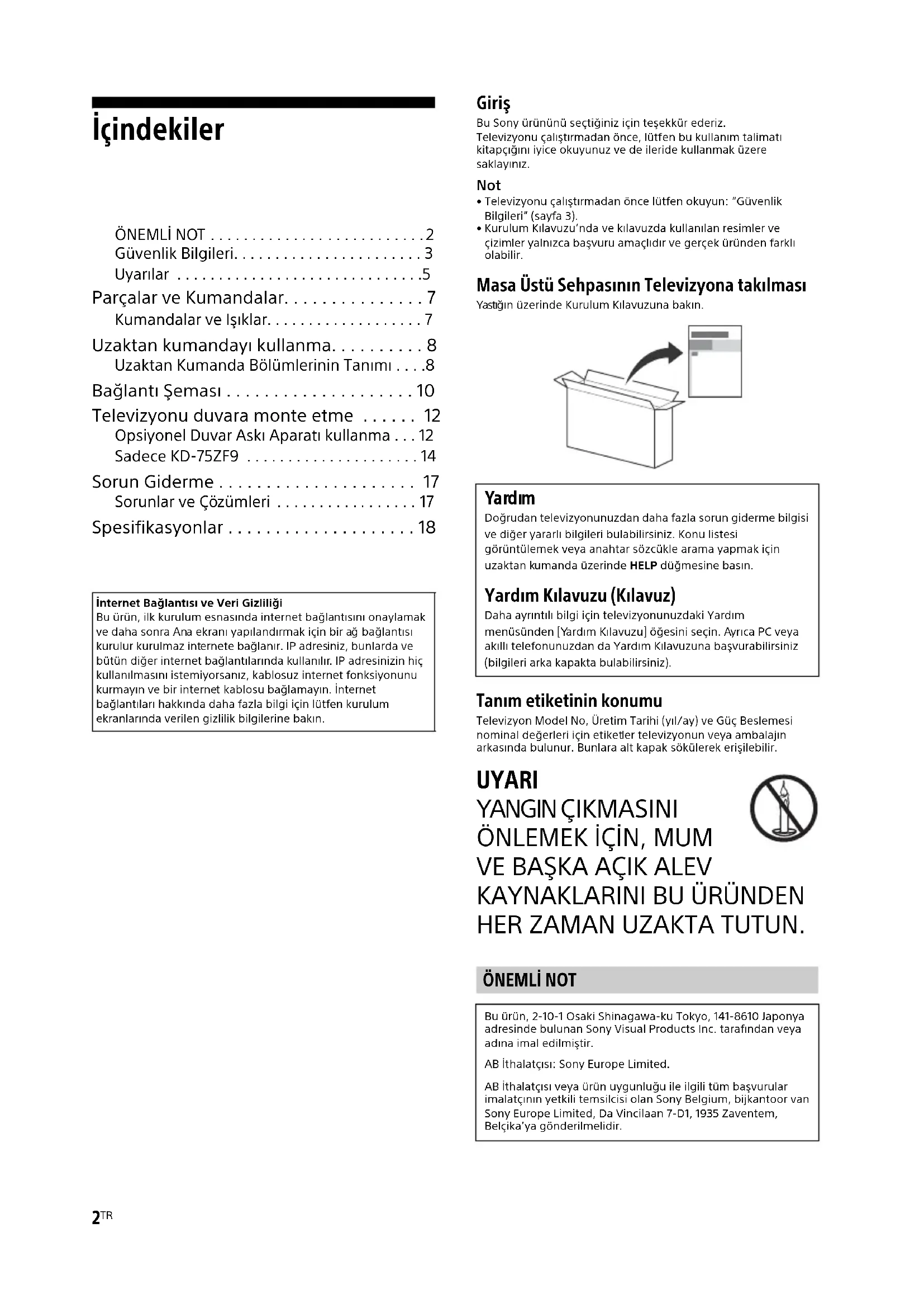 HER ZAMAN UZAKTA TUTUN. İnternet Bağlantısı ve Veri GizliliğiBu ürün, ilk kurulum esnasında internet bağlantısını onaylamak ve daha sonra Ana ekranı yapılandırmak için bir ağ bağlantısı kurulur kurulmaz internete bağlanır. IP adresiniz, bunlarda ve bütün diğer internet bağlantılarında kullanılır. IP adresinizin hiç kullanılmasını istemiyorsanız, kablosuz internet fonksiyonunu kurmayın ve bir internet kablosu bağlamayın. İnternet bağlantıları hakkında daha fazla bilgi için lütfen kurulum ekranlarında verilen gizlilik bilgilerine bakın. Ya rd ım Doğrudan televizyonunuzdan daha fazla sorun giderme bilgisi ve diğer yararlı bilgileri bulabilirsiniz. Konu listesi görüntülemek veya anahtar sözcükle arama yapmak için uzaktan kumanda üzerinde HELP düğmesine basın. Yardım Kılavuzu (Kılavuz) Daha ayrıntılı bilgi için televizyonunuzdaki Yardım menüsünden [Yardım Kılavuzu] öğesini seçin. Ayrıca PC veya akıllı telefonunuzdan da Yardım Kılavuzuna başvurabilirsiniz (bilgileri arka kapakta bulabilirsiniz). ÖNEMLİ NOT Bu ürün, 2-10-1 Osaki Shinagawa-ku Tokyo, 141-8610 Japonya adresinde bulunan Sony Visual Products Inc. tarafından veya adına imal edilmiştir.AB İthalatçısı: Sony Europe Limited.AB İthalatçısı veya ürün uygunluğu ile ilgili tüm başvurular imalatçının yetkili temsilcisi olan Sony Belgium, bijkantoor van Sony Europe Limited, Da Vincilaan 7-D1, 1935 Zaventem, Belçika’ya gönderilmelidir.3
