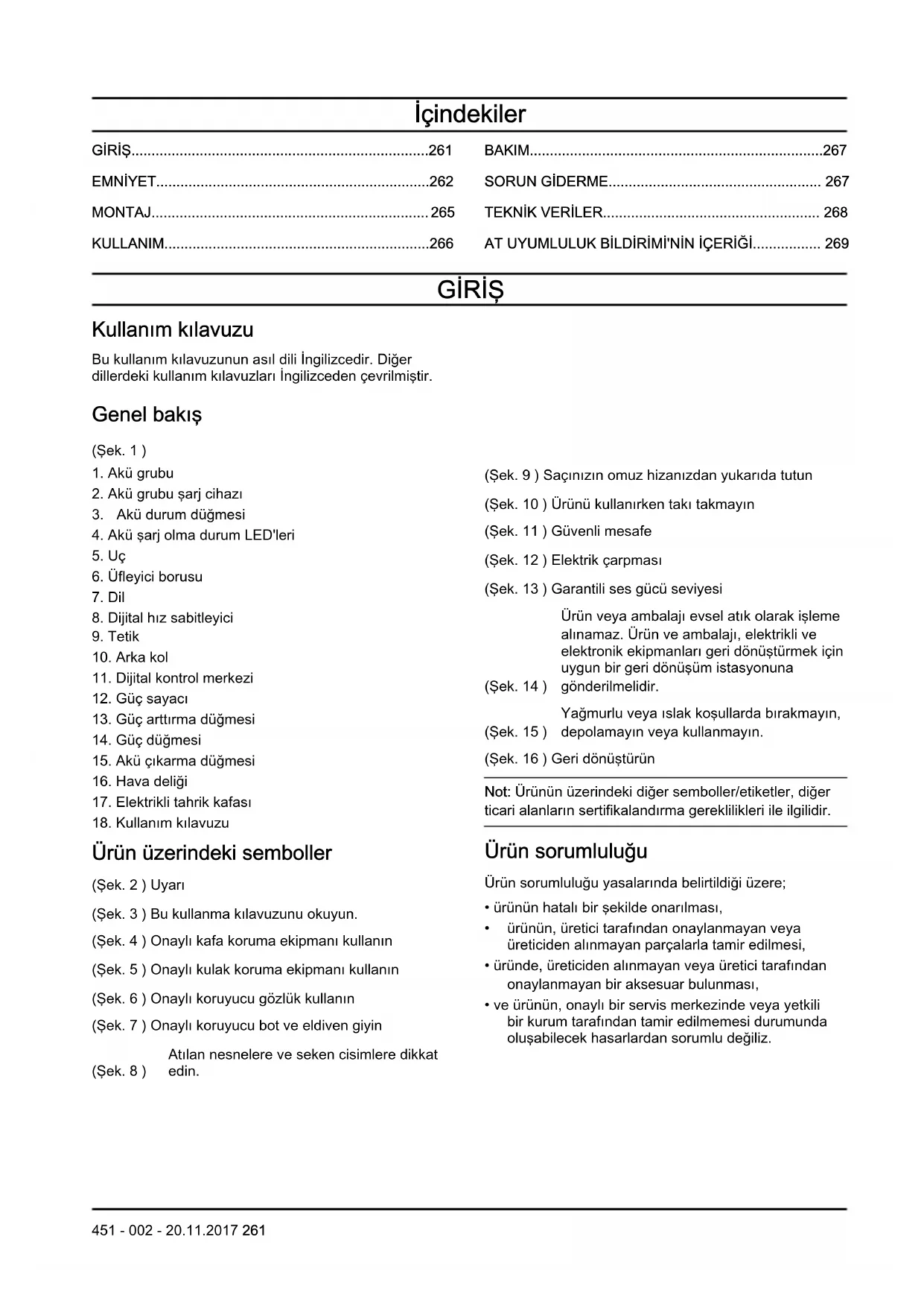 | Bak31m ve tamir | Batarya durumunu d fczg fcnce kontrol edin, hava filtresini temizleyin, kullan31m k31lavuzundaki tavsiyelere uyun |