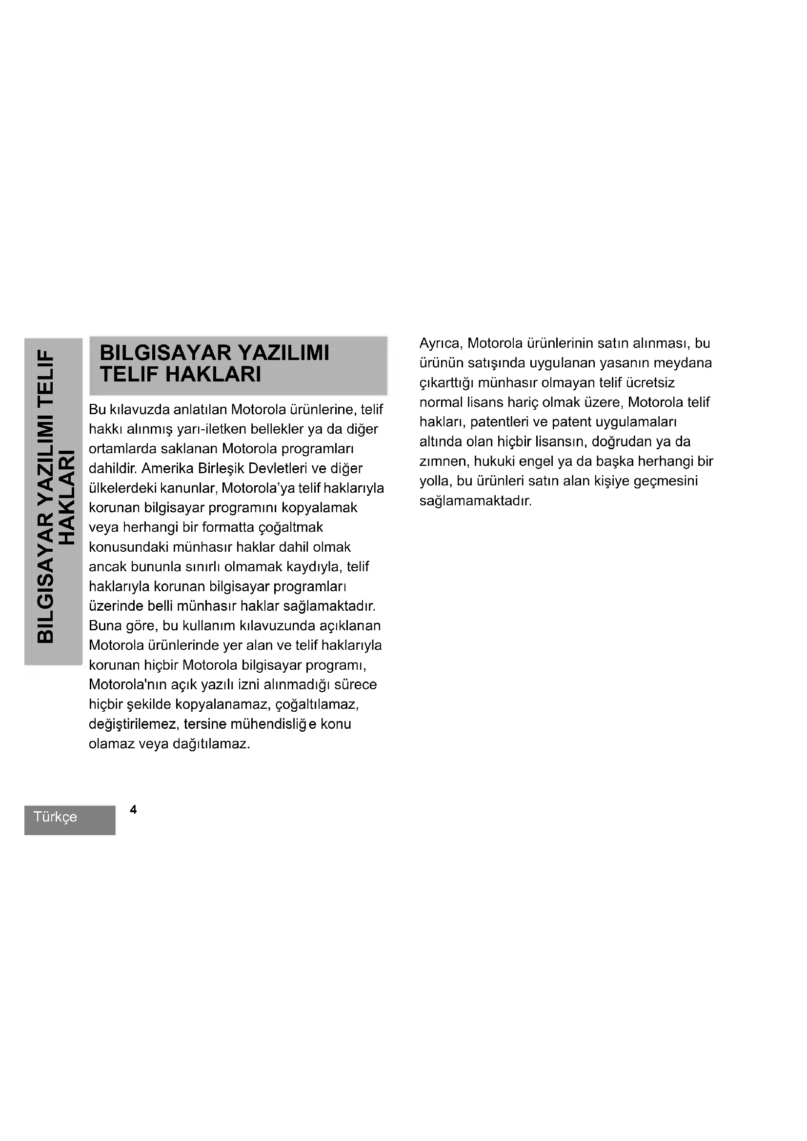 HAKLARI BILGISAYAR YAZILIMI TELIF HAKLARI Bu kılavuzda anlatılan Motorola ürünlerine, telif hakkı alınmış yarı-iletken bellekler ya da diğer ortamlarda saklanan Motorola programları dahildir. Amerika Birleşik Devletleri ve diğer ülkelerdeki kanunlar, Motorola’ya telif haklarıyla korunan bilgisayar programını kopyalamak veya herhangi bir formatta çoğaltmak konusundaki münhasır haklar dahil olmak ancak bununla sınırlı olmamak kaydıyla, telif haklarıyla korunan bilgisayar programları üzerinde belli münhasır haklar sağlamaktadır. Buna göre, bu kullanım kılavuzunda açıklanan Motorola ürünlerinde yer alan ve telif haklarıyla korunan hiçbir Motorola bilgisayar programı, Motorola'nın açık yazılı izni alınmadığı sürece hiçbir şekilde kopyalanamaz, çoğaltılamaz, değiştirilemez, tersine mühendisliğ e konu olamaz veya dağıtılamaz. Ayrıca, Motorola ürünlerinin satın alınması, bu ürünün satışında uygulanan yasanın meydana çıkarttığı münhasır olmayan telif ücretsiz normal lisans hariç olmak üzere, Motorola telif hakları, patentleri ve patent uygulamaları altında olan hiçbir lisansın, doğrudan ya da zımnen, hukuki engel ya da başka herhangi bir yolla, bu ürünleri satın alan kişiye geçmesini sağlamamaktadır.Türkçe