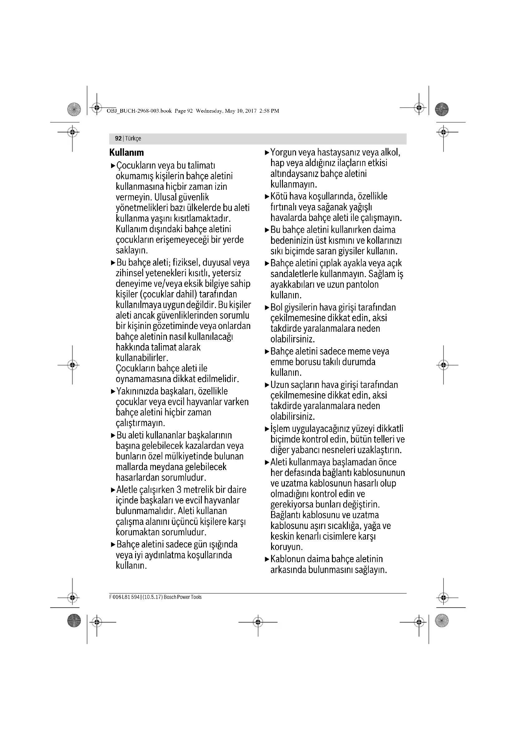 Τα μηχανήματα κήπου, τα εξαρτήματα και οι συσκευασίες πρέπει να ανακυκλώνονται με τρόπο φιλικό προς το περιβάλλον. Μην ρίξετε τα μηχανήματα κήπου στα απορρίμματα του σπιτιού σας! Μόνο για χώρες της ΕΕ: Σύμφωνα με την Κοινοτική Οδηγία 2012/19/EE σχετικά με τις παλαιές ηλεκτρικές και ηλεκτρονικές συσκευές και τη μεταφορά της οδηγίας αυτής σε εθνικό δίκαιο δεν είναι πλέον υποχρεωτικό τα άχρηστα ηλεκτρικά και ηλεκτρονικά μηχανήματα να συλλέγονται ξεχωριστά για να ανακυκλωθούν με τρόπο φιλικό προς το περιβάλλον. Τηρούμε το δικαίωμα αλλαγών. Türkçe Güvenlik Talimatı Dikkat! Aşağıdaki talimatı dikkatle okuyun. Bahçe aletinin usulüne uygun olarak kullanımını ve kumanda elemanlarının işlevlerini tam olarak öğrenin. Bu kullanım kılavuzunu ileride başvurmak üzere güvenli bir yerde saklayın. Bahçe aleti üzerindeki sembollerin açıklaması Genel tehlike uyarısı. Kullanım kılavuzunu tam olarak okuyun. Çalışırken yakınınızda bulunan kişilerin etrafa savrulabilicek yabancı cisimler tarafından yaralanmaması için gerekli önlemleri alın. Uyarı: Bahçe aleti çalışır durumda iken aletle aranızda güvenli bir mesafe bırakın. Dönen fan. Bahçe aleti çalışırken ellerinizi ve ayaklarınızı deliklere yaklaştırmayın. Bahçe aleti çalışırken ellerinizi ve ayaklarınızı deliklere yaklaştırmayın. Yakınınızda bulunan kişilerin bahçe aletinden savrulan yabancı cisimler nedeniyle yaralanmamasına dikkat edin. Başkalarının bahçe aletinden güvenli bir uzaklıkta bulunmasına dikkat edin. Koruyucu kulaklık ve gözlük kullanın. Yağmur altında çalışmayın ve yaprak üfleme makinesini/ elektrikli bahçe süpürgesini yağmur altında bırakmayın. Aletin kendinde ayarlama, temizlik ve bakım işlerine başlamadan önce, şebeke bağlantı kablosu sarıldığında, kesildiğinde veya hasar gördüğünde veya yaprak üfleme makinesini/elektrikli bahçe süpürgesini denetiminiz dışında bırakacağınız zaman bahçe aletini kapatın ve fişi prizden çekin. Bahçe aletinin herhangi bir parçasını tutmadan önce, bütün parçaların tam olarak durmasını bekleyin. Bahçe aleti kapandıktan sonra da bıçaklar bir süre serbest dönüşte dönerler ve yaralanmalara neden olabilirler. OBJ_BUCH-2968-003.book Page 91 Wednesday, May 10, 2017 2:58 PM92 | Türkçe F 016 L81 594 | (10.5.17) Bosch Power Tools Kullanım Çocukların veya bu talimatı okumamış kişilerin bahçe aletini kullanmasına hiçbir zaman izin vermeyin. Ulusal güvenlik yönetmelikleri bazı ülkelerde bu aleti kullanma yaşını kısıtlamaktadır. Kullanım dışındaki bahçe aletini çocukların erişemeyeceği bir yerde saklayın. Bu bahçe aleti; fiziksel, duyusal veya zihinsel yetenekleri kısıtlı, yetersiz deneyime ve/veya eksik bilgiye sahip kişiler (çocuklar dahil) tarafından kullanılmaya uygun değildir. Bu kişiler aleti ancak güvenliklerinden sorumlu bir kişinin gözetiminde veya onlardan bahçe aletinin nasıl kullanılacağı hakkında talimat alarak kullanabilirler. Çocukların bahçe aleti ile oynamamasına dikkat edilmelidir. Yakınınızda başkaları, özellikle çocuklar veya evcil hayvanlar varken bahçe aletini hiçbir zaman çalıştırmayın. Bu aleti kullananlar başkalarının başına gelebilecek kazalardan veya bunların özel mülkiyetinde bulunan mallarda meydana gelebilecek hasarlardan sorumludur. Aletle çalışırken 3 metrelik bir daire içinde başkaları ve evcil hayvanlar bulunmamalıdır. Aleti kullanan çalışma alanını üçüncü kişilere karşı korumaktan sorumludur. Bahçe aletini sadece gün ışığında veya iyi aydınlatma koşullarında kullanın. Yorgun veya hastaysanız veya alkol, hap veya aldığınız ilaçların etkisi altındaysanız bahçe aletini kullanmayın. Kötü hava koşullarında, özellikle fırtınalı veya sağanak yağışlı havalarda bahçe aleti ile çalışmayın. Bu bahçe aletini kullanırken daima bedeninizin üst kısmını ve kollarınızı sıkı biçimde saran giysiler kullanın. Bahçe aletini çıplak ayakla veya açık sandaletlerle kullanmayın. Sağlam iş ayakkabıları ve uzun pantolon kullanın. Bol giysilerin hava girişi tarafından çekilmemesine dikkat edin, aksi takdirde yaralanmalara neden olabilirsiniz. Bahçe aletini sadece meme veya emme borusu takılı durumda kullanın. Uzun saçların hava girişi tarafından çekilmemesine dikkat edin, aksi takdirde yaralanmalara neden olabilirsiniz. İşlem uygulayacağınız yüzeyi dikkatli biçimde kontrol edin, bütün telleri ve diğer yabancı nesneleri uzaklaştırın. Aleti kullanmaya başlamadan önce her defasında bağlantı kablosununun ve uzatma kablosunun hasarlı olup olmadığını kontrol edin ve gerekiyorsa bunları değiştirin. Bağlantı kablosunu ve uzatma kablosunu aşırı sıcaklığa, yağa ve keskin kenarlı cisimlere karşı koruyun. Kablonun daima bahçe aletinin arkasında bulunmasını sağlayın. OBJ_BUCH-2968-003.book Page 92 Wednesday, May 10, 2017 2:58 PMTürkçe | 93 Bosch Power Tools F 016 L81 594 | (10.5.17) Bahçe aletini sadece işletim türü için öngörülen pozisyonda çalıştırın. Bahçe aleti yaprak emme modunda ters tutulmaya uygun değildir. Yaprak üfleme makinesini/elektrikli bahçe süpürgesini hiçbir zaman arızalı koruyucu donanımla, kapaklarla veya örneğin toplama torbası gibi güvenlik donanımı olmadan kullanmayın. Yaprak üfleme makinesi/elektrikli bahçe süpürgesi çalıştırılırken birlikte teslim edilen bü