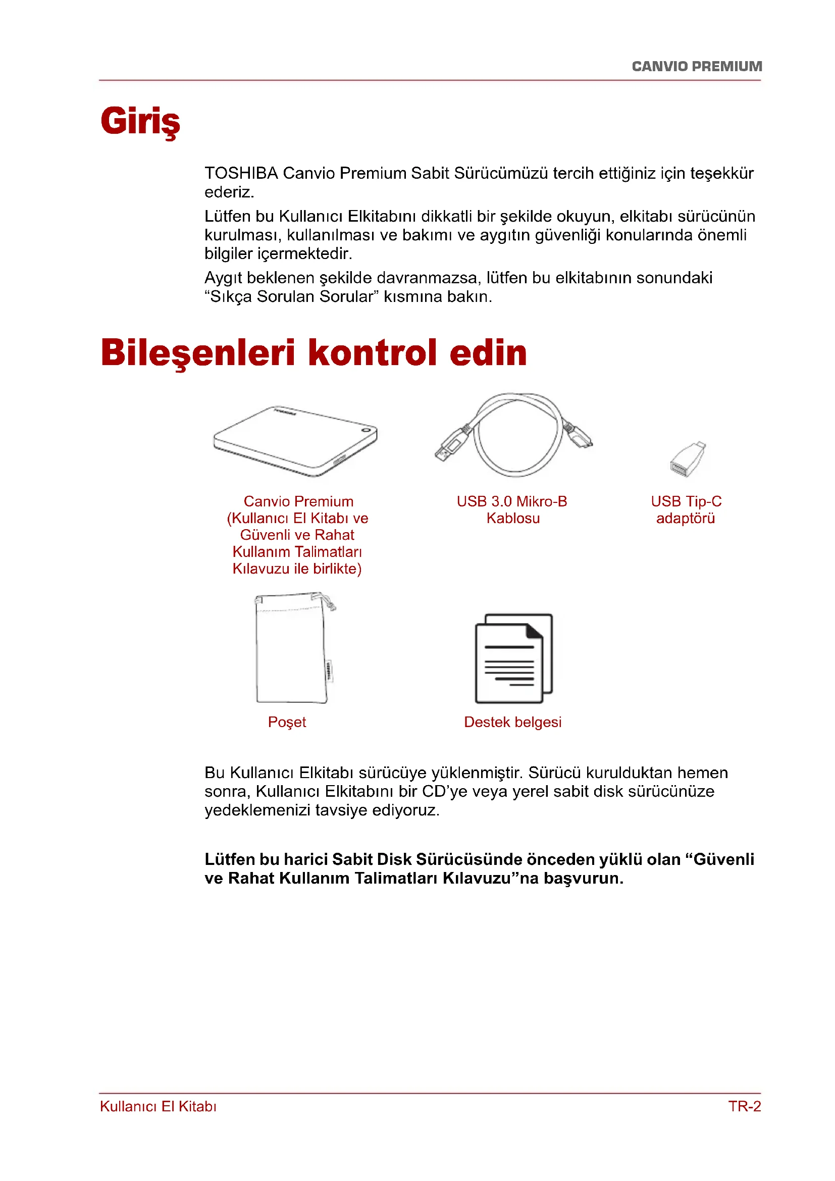 - Düzenlemeye ilişkin bildirimler Kullanıcı El Kitabı TR-2 CANVIO PREMIUM Giriş TOSHIBA Canvio Premium Sabit Sürücümüzü tercih ettiğiniz için teşekkür ederiz. Lütfen bu Kullanıcı Elkitabını dikkatli bir şekilde okuyun, elkitabı sürücünün kurulması, kullanılması ve bakımı ve aygıtın güvenliği konularında önemli bilgiler içermektedir. Aygıt beklenen şekilde davranmazsa, lütfen bu elkitabının sonundaki “Sıkça Sorulan Sorular” kısmına bakın. Bileşenleri kontrol edin Bu Kullanıcı Elkitabı sürücüye yüklenmiştir. Sürücü kurulduktan hemen sonra, Kullanıcı Elkitabını bir CD’ye veya yerel sabit disk sürücünüze yedeklemenizi tavsiye ediyoruz. Lütfen bu harici Sabit Disk Sürücüsünde önceden yüklü olan “Güvenli ve Rahat Kullanım Talimatları Kılavuzu”na başvurun. Canvio Premium (Kullanıcı El Kitabı ve Güvenli ve Rahat Kullanım Talimatları Kılavuzu ile birlikte) USB 3.0 Mikro-B Kablosu Poşet USB Tip-C adaptörü Destek belgesiKullanıcı El Kitabı TR-3 CANVIO PREMIUM Sistem Gereksinimleri ■ Windows p. 8