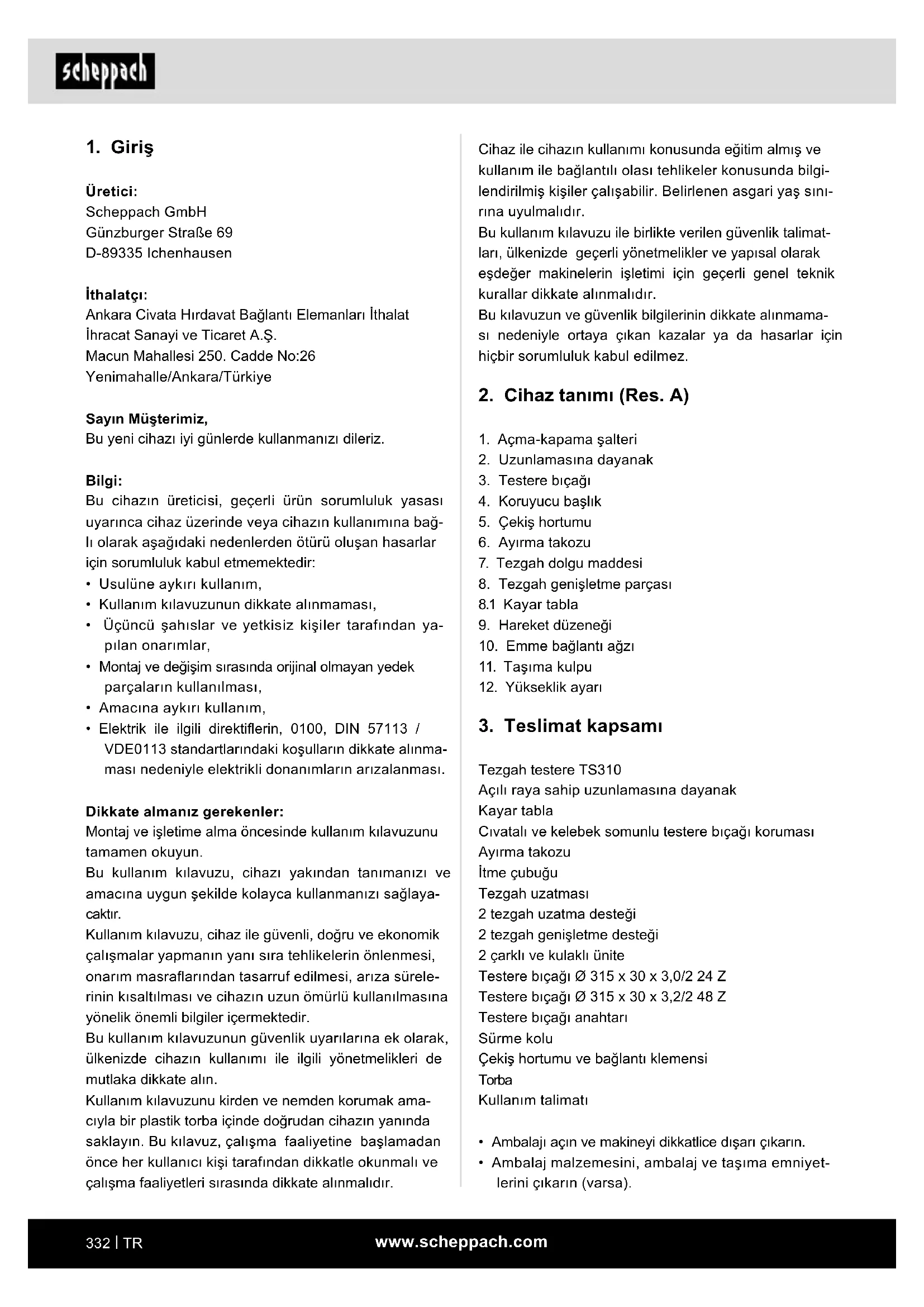KULLANIM KILAVUZU TS310 SCHEPPACH