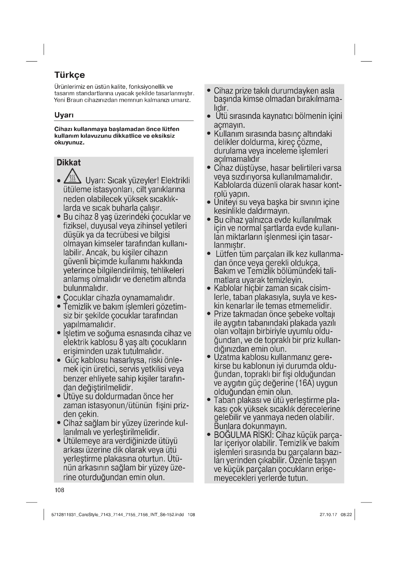 BOĞULMA RİSKİ: Cihaz küçük parça- lar içeriyor olabilir. Temizlik ve bakım işlemleri sırasında bu parçaların bazı- ları yerinden çıkabilir. Özenle taşıyın ve küçük parçaları çocukların erişe- meyecekleri yerlerde tutun. 5712811931_CareStyle_7143_7144_7155_7156_INT_S6-152.indd 1085712811931_CareStyle_7143_7144_7155_7156_INT_S6-152.indd 108 27.10.17 08:2227.10.17 08:22109