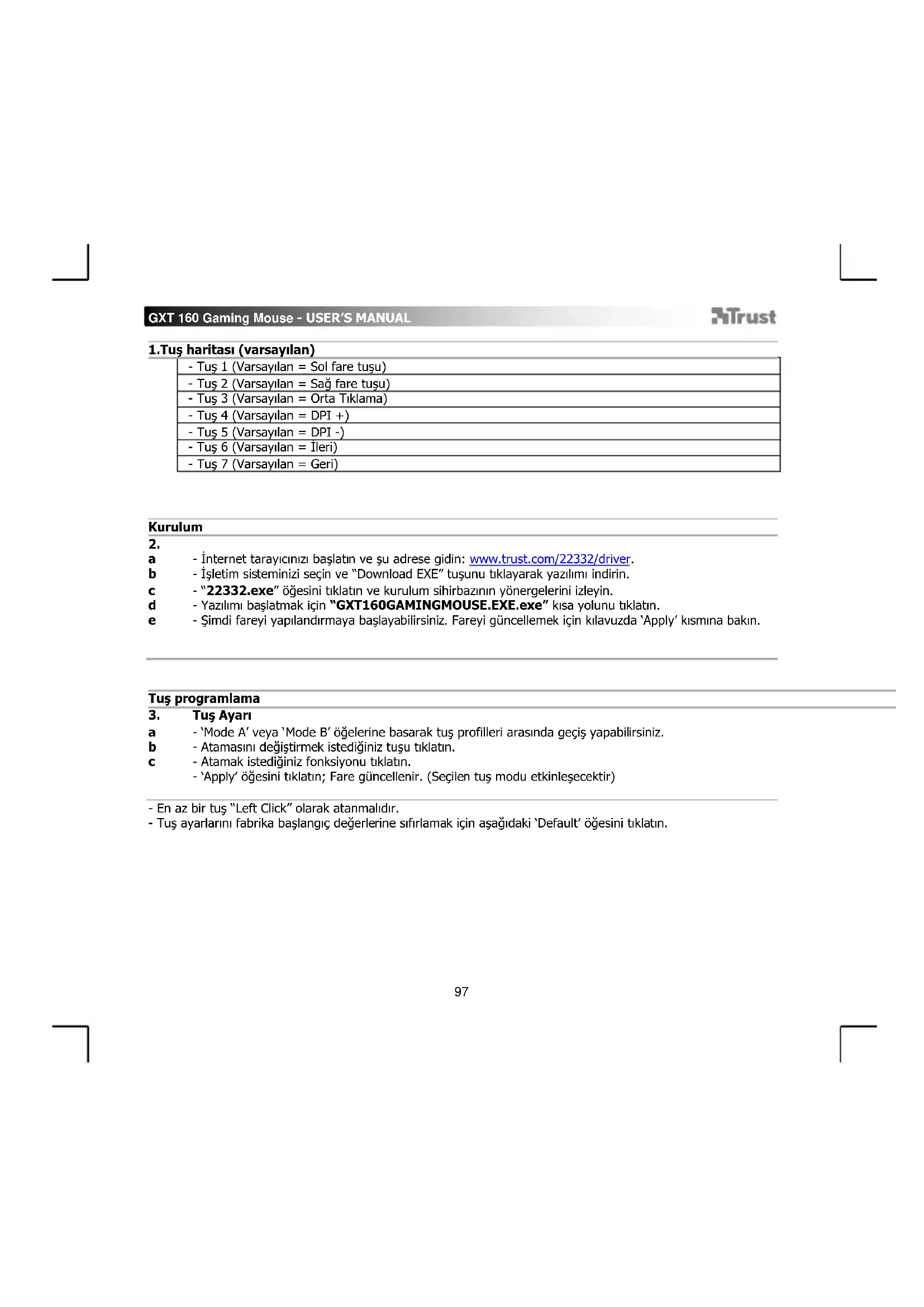Sorununuz çözülmezse lütfen şu bağlantıdan yardım masasıyla irtibata geçin: www.trust.com/22332/faq.GXT 160 Gaming Mouse - USER’S MANUAL