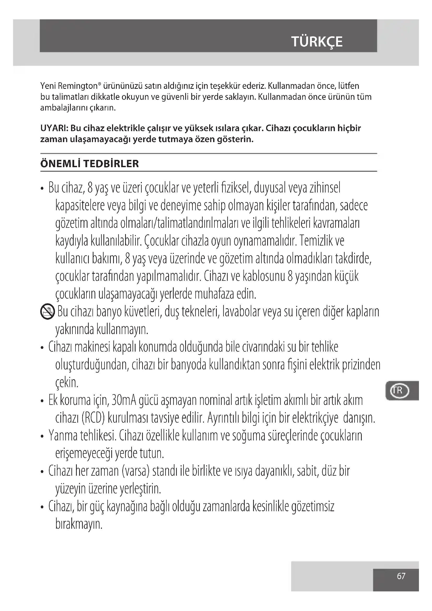 - Şayet bu cihazın elektrik kablosu hasar görmüşse, derhal kullanmayı bırakın ve cihazı, bir tehlikeyi önlemek üzere onarım veya yenileme işlemleri için, size en yakın Remington® yetkili servis merkezine geri götürün.