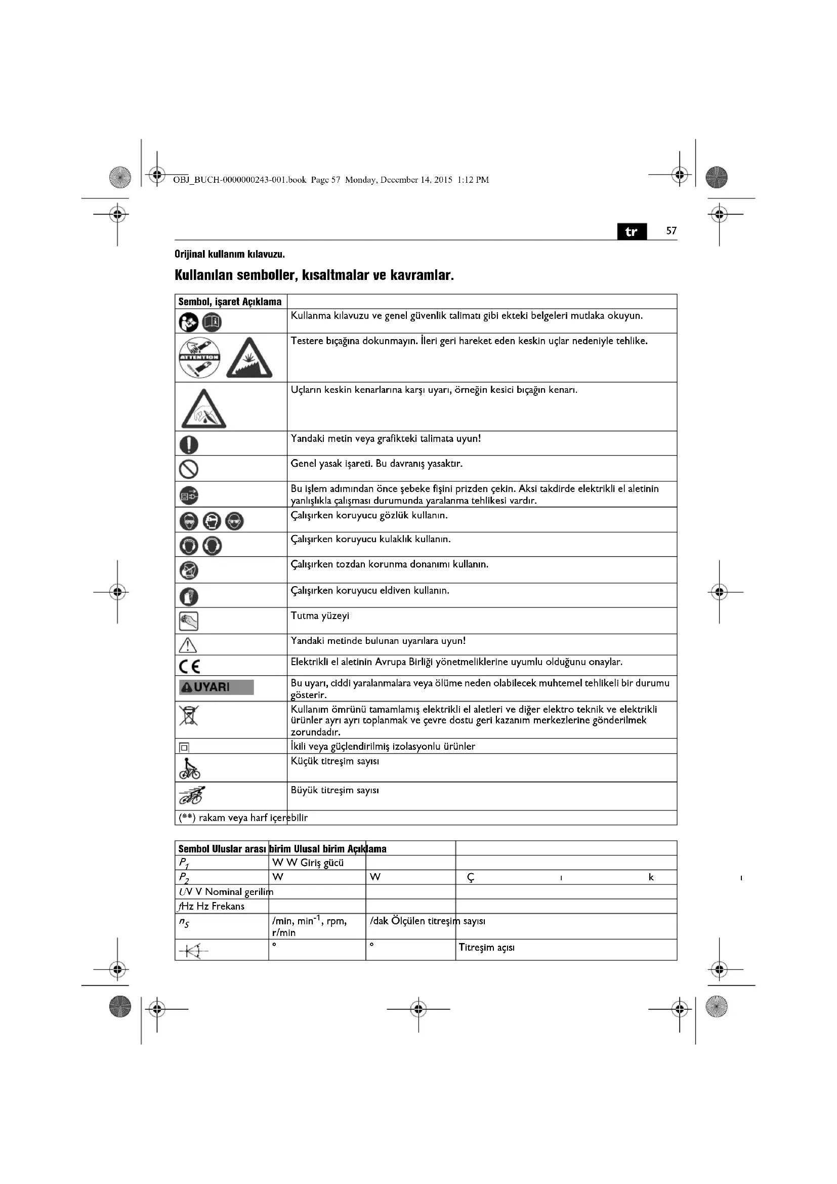 Orijinal kullanım kılavuzu. Kullanılan semboller, kısaltmalar ve kavramlar. Sembol, işaret Açıklama Kullanma kılavuzu ve genel güvenlik talimatı gibi ekteki belgeleri mutlaka okuyun. Testere bıçağına dokunmayın. İleri geri hareket eden keskin uçlar nedeniyle tehlike. Uçların keskin kenarlarına karşı uyarı, örneğin kesici bıçağın kenarı. Yandaki metin veya grafikteki talimata uyun! Genel yasak işareti. Bu davranış yasaktır. Bu işlem adımından önce şebeke fişini prizden çekin. Aksi takdirde elektrikli el aletinin yanlışlıkla çalışması durumunda yaralanma tehlikesi vardır. Çalışırken koruyucu gözlük kullanın. Çalışırken koruyucu kulaklık kullanın. Çalışırken tozdan korunma donanımı kullanın. Çalışırken koruyucu eldiven kullanın. Tutma yüzeyi Yandaki metinde bulunan uyarılara uyun! Elektrikli el aletinin Avrupa Birliği yönetmeliklerine uyumlu olduğunu onaylar. Bu uyarı, ciddi yaralanmalara veya ölüme neden olabilecek muhtemel tehlikeli bir durumu gösterir. Kullanım ömrünü tamamlamış elektrikli el aletleri ve diğer elektro teknik ve elektrikli ürünler ayrı ayrı toplanmak ve çevre dostu geri kazanım merkezlerine gönderilmek zorundadır. İkili veya güçlendirilmiş izolasyonlu ürünler Küçük titreşim sayısı Büyük titreşim sayısı (**) rakam veya harf içerebilir Sembol Uluslar arası birim Ulusal birim Açıklama